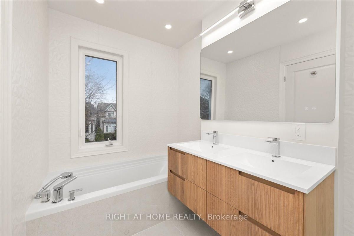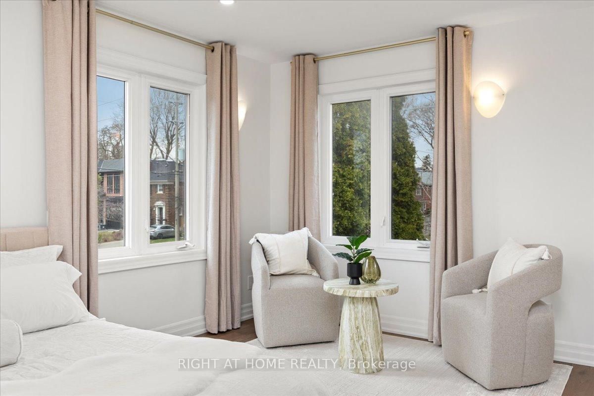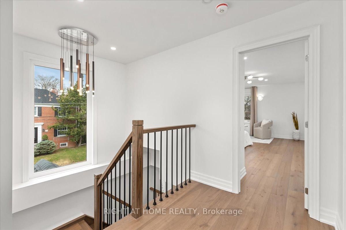 North Leaside move-in-ready, fully renovated detached home with top of the line material. The 2-Storey on 497 Broadway Avenue has 3 bedrooms, 4 bathrooms, and is located on a 125 x 25 ft lot in the community of Leaside . Prime corner lot backing onto Northlea Elementary/Middle School. Perfect for people with small to middle school kids. Bright and spacious with 3+2 bedrooms and 4 baths provides a functional layout and nice flow. The custom eat-in kitchen features quartz counters and a large island. New oak flooring runs throughout, complemented by new oak stairs. 9' ceilings on the main level. The living area is enhanced by a travertine framed gas fireplace. A nook next to the living area provides a little office space. The upper level includes a primary retreat with a spa-like 5-piece ensuite and walk-in closet in the master bedroom, plus a main bath with steam sauna and heated floors. The finished lower level with heated vinyl flooring with 2 bedrooms, a 3-piece bath. Major upgrades in 2026 include all oak flooring and stairs, fiberglass front door, energy efficient patio doors, Travertine Gas Fireplace, Lennox High Efficiency furnace, A/C, tankless water heater, Upgraded 200-amp electric panel, EV charger, Smart video doorbell and Ecobee thermostat. Private two car driveway. Irrigation system in the landscape. Walking distance to Eglinton LRT and Leaside High School. **Everything is paid off. No Rental Items** **Basement photos are virtually staged**