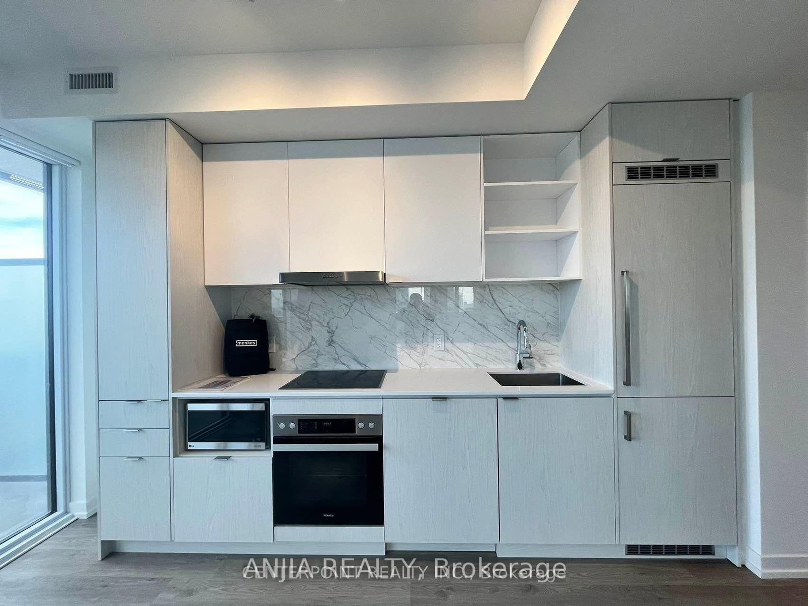 High-End Appliances: Miele Built-In Fridge, Stove, Dishwasher, Range Hood, Microwave, Stacking Washer & Dryer.