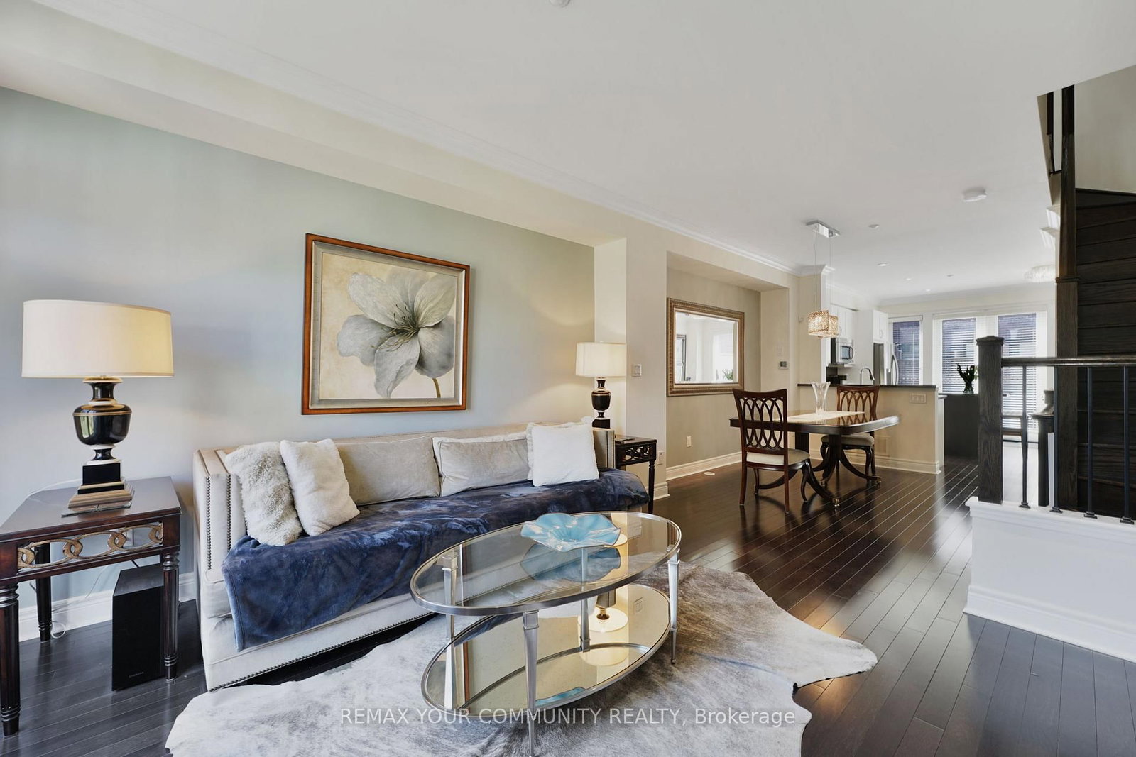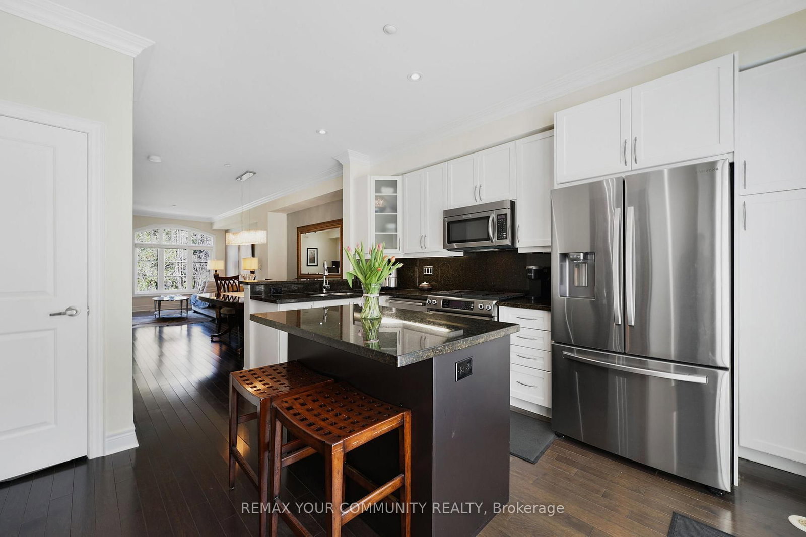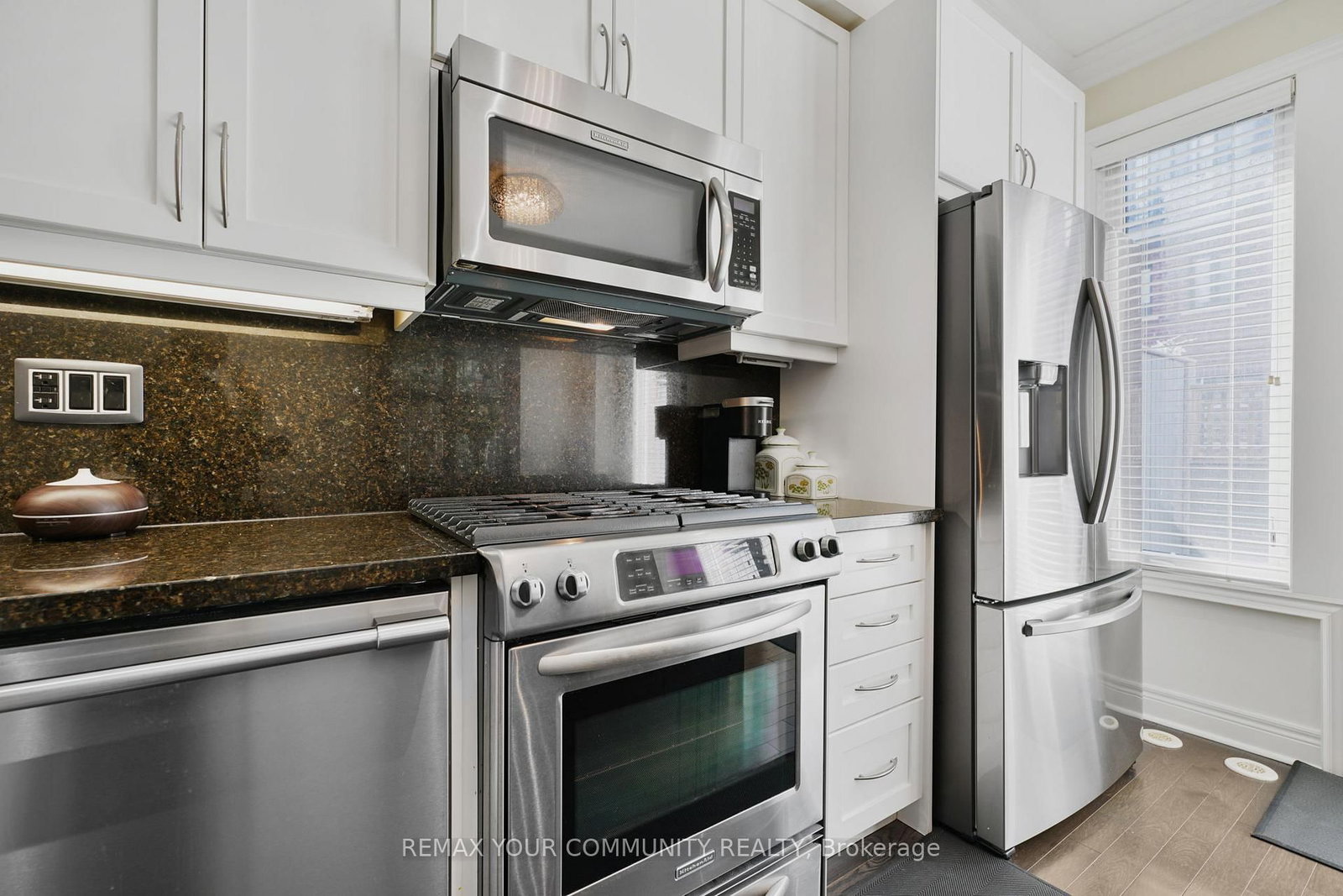 Riverside Luxury Townhouse for Sale. The 3-Storey on 16 Agar Lane has 3 bedrooms, 3 bathrooms, and is located in the community of West Woodbridge . Welcome to a peaceful luxury townhouse community in matured Woodbridge, surround by Market Lane Shops, Restaurants, Supermarkets, Public Transit, easy access to HWY 27, 427, 407 and 50. A premium lot, facing a quiet private community park. It provides a save, elegant, spacious and economical life-style-living, with security monitored, concealed ceiling fire-sprinklers throughout and an oversized indoor two-car tandem garage with generous storage space. Rich wood floors and stairs with 9ft ceilings and crow-moldings are throughout the home. The entry-level floor has heated ceramic floors, one washroom and a spacious den with large wood shutter windows facing the private park area - ideal for office, exercise or bedroom use. The primary floor level has an open-concept layout with large windows facing the private park. A gas fireplace with stone-facing enriches has spacious living and dining area. The Kitchen has generous cabinet storage and a pantry. Granite countertops, including the kitchen island has generous cabinet storage and a pantry. Granite countertops, including the kitchen island with additional storage space. The refrigerator, dishwasher and gas-stove are stainless steel, and large size microwave. Double French doors exit's the kitchen into a spacious private outdoor patio balcony. The secondary floor level has 2 spacious bedrooms, one with wall-to-wall windows for a breathtaking view of the community private park. A full bathroom services the floor level, along with the laundry room with ample storage space. The grand master bedroom has a walk-out balcony, a custom-built walk-in closet and a large spa-like 5 pcs ensuite with double-sink and a jacuzzi.