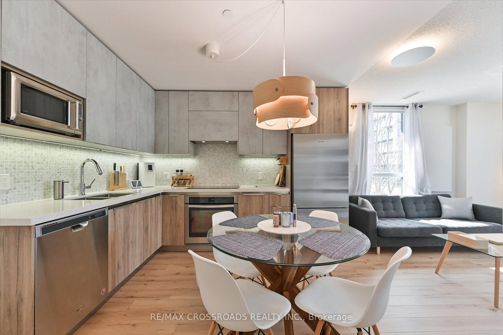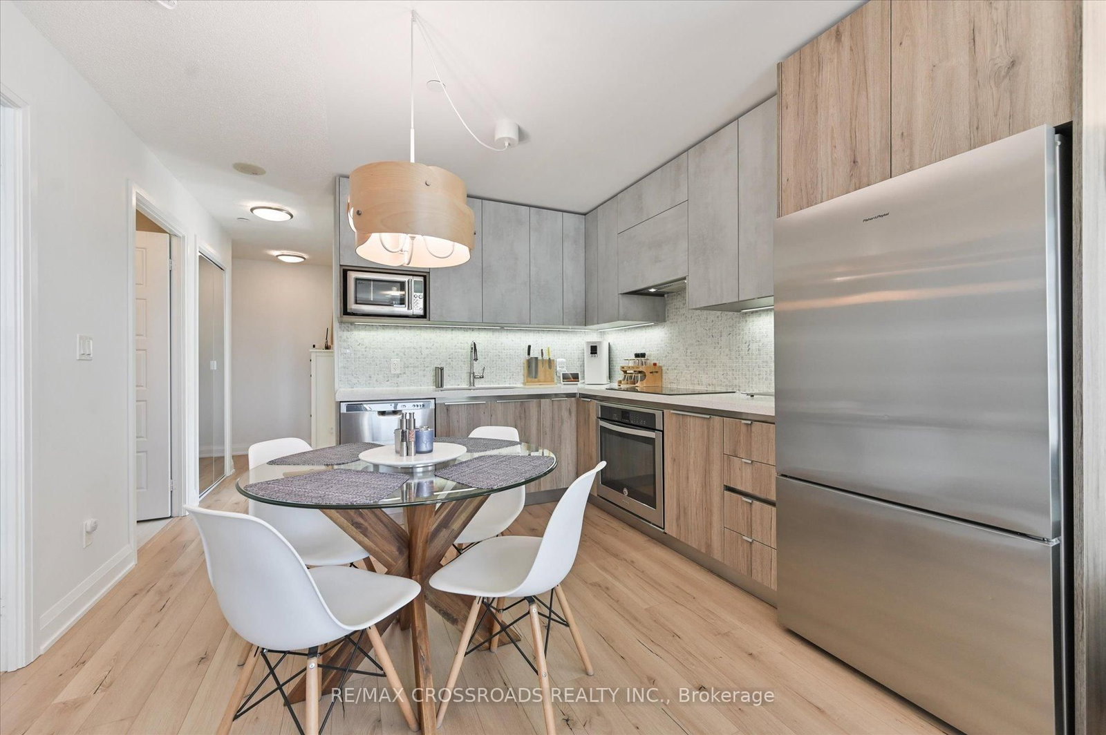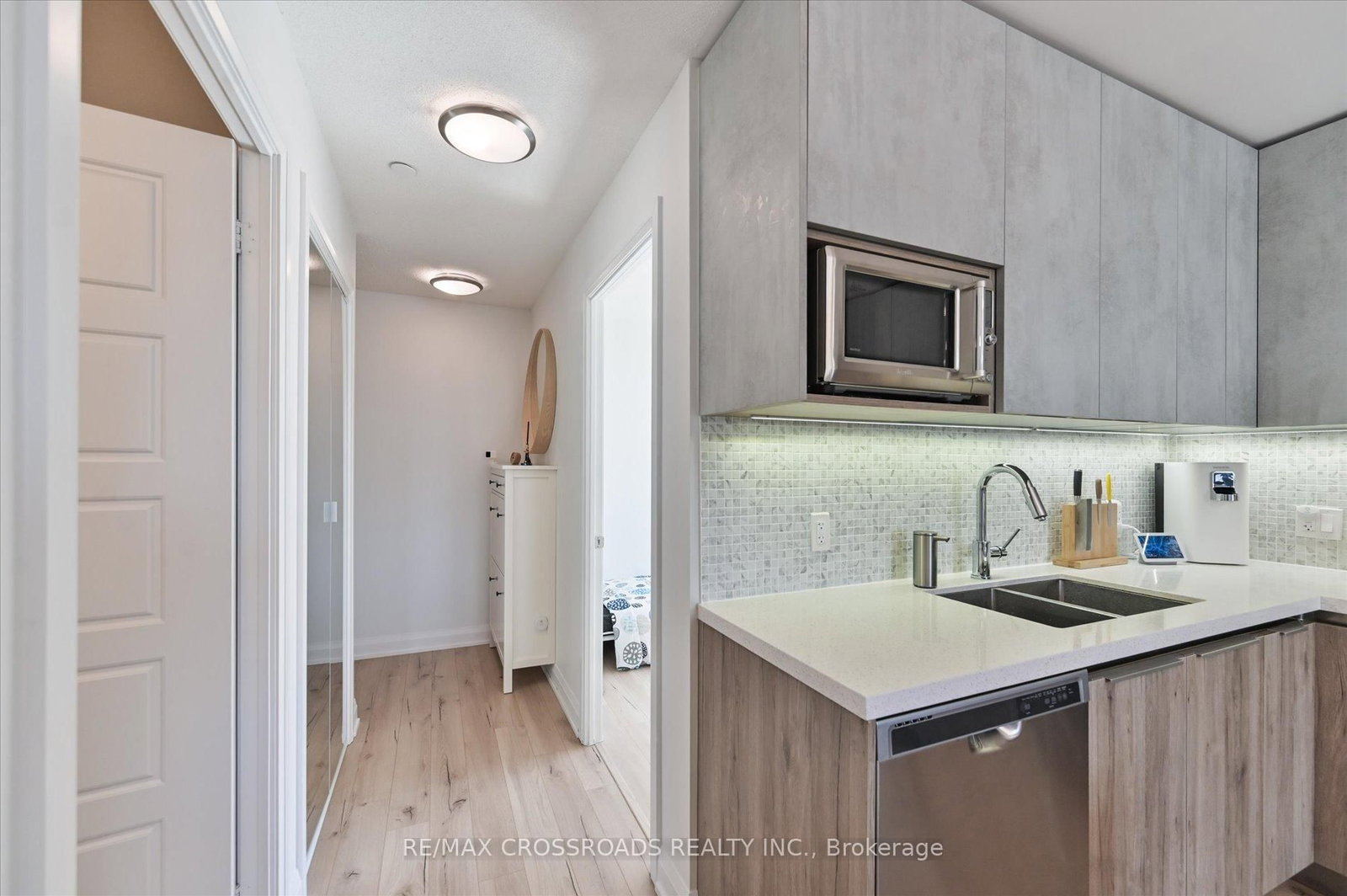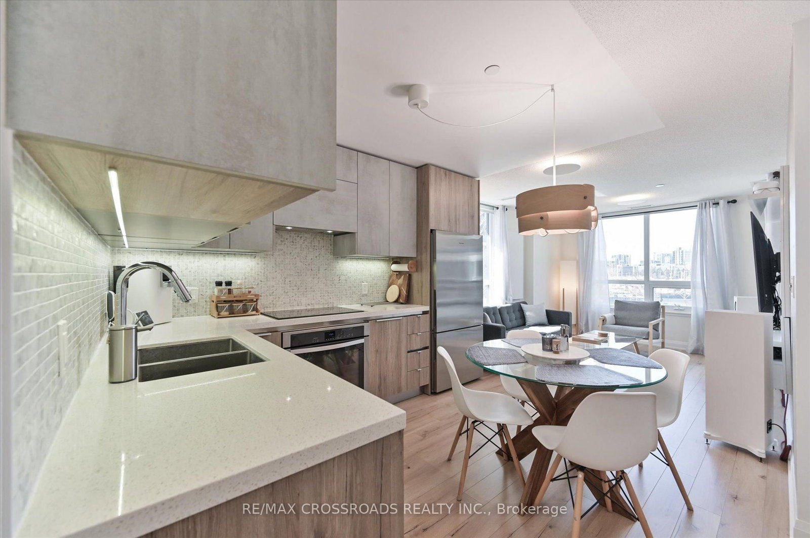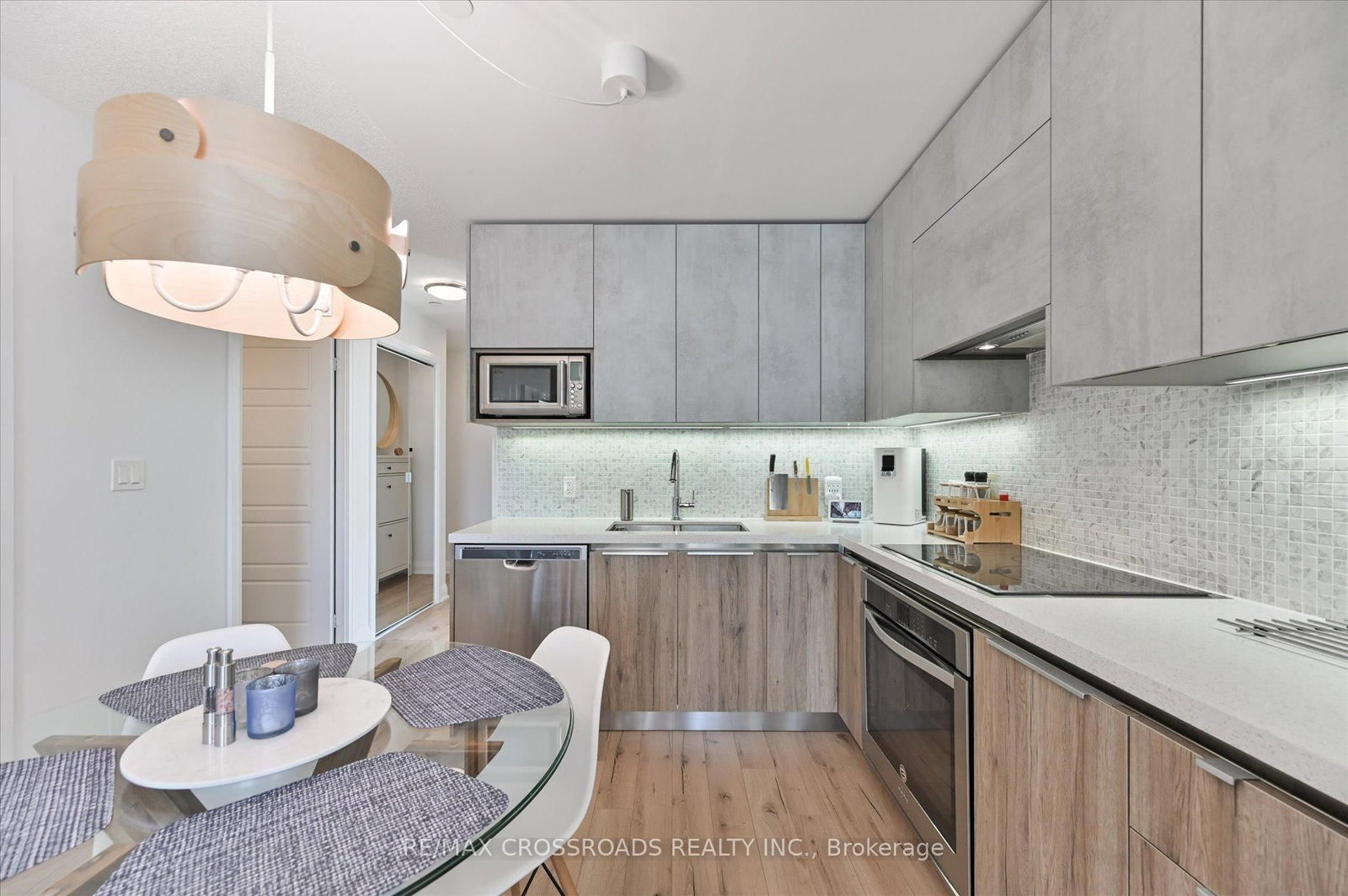 Rare Corner Sanctuary in Riverside Uptown Markham - Sunset Views & Ultimate Privacy. The Apartment on 308-25 Water Walk Drive has 1 bedrooms, 1 bathrooms, and is located in the community of Unionville . True pride of ownership! Experience the pinnacle of urban living in this meticulously maintained oversized 1-bedroom plus den corner suite. Spanning 695 square feet of meticulously upgraded space, this southwest-facing unit is flooded with natural light and offers a rare level of tranquility - tucked away at the end of the hallway with no neighbours above! The versatile, sun-filled den features a large window and is easily convertible into a functional second bedroom or executive home office. The gourmet kitchen is a chef's dream, featuring an upgraded GE Cafe induction cooktop, premium stainless steel appliances, and sleek cabinetry. The open-concept living area is anchored by a custom built-in media wall unit and accented by upgraded designer light fixtures throughout. Upgraded with CAT6 network wiring throughout for seamless, high-speed internet connectivity in every room. Not to mention, already included in the maintenance fee is Rogers 1.5 gigabit internet for your convenience! Includes 1 Parking & 1 Locker. Enjoy world-class LEED Gold amenities: an infinity rooftop pool, fitness centre, library/Wi-Fi lounge, and 24-hour concierge. Located steps from Whole Foods, luxury dining, and Viva Transit, with rapid access to Highways 407 and 404.