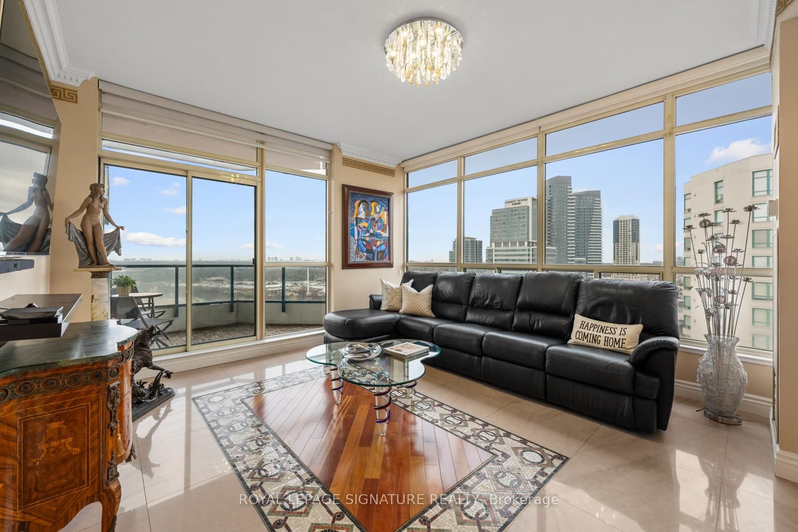 Welcome to 7300 Yonge Street, PH9 - Skyrise on Yonge, a rarely available, one-of-a-kind 2-storey penthouse offeringapproximately 3,620 sq. The 2-Storey on PH9-7300 Yonge Street has 2 bedrooms, 3 bathrooms, and is located in the community of Crestwood-Springfarm-Yorkhill . ft. of luxurious living space in the heart of Thornhill.This bright corner suite is an entertainer's dream, featuring breathtaking panoramic south-east views and an impressive grandfoyer with mosaic inserts in both ceiling and flooring. The residence offers 2 spacious bedrooms plus a solarium and 3 beautifullyrenovated bathrooms.Designed with exceptional craftsmanship and upscale finishes throughout, this home showcases a gourmet kitchen, elegantliving and dining areas with crown mouldings and architectural columns, and a striking floating wrought iron staircase. Theprimary suite is a private retreat, complete with a picture-window sitting area and sauna.Enjoy seamless indoor-outdoor living with a private terrace on the second floor and an additional balcony off the family room.Additional features include two parking spaces, a locker, and a large laundry room with ensuite storage.All-inclusive maintenance fees cover utilities plus TV, internet, and telephone.Residents enjoy premium amenities including an indoor pool, gym, party room, tennis and squash courts, and guest suites.Ideally located with TTC at your doorstep, and close to shopping, dining, and places of worship.A truly exceptional residence offering space, elegance, and convenience-showing to perfection.