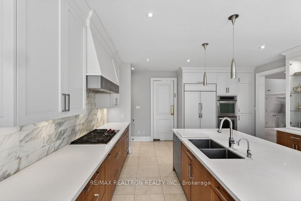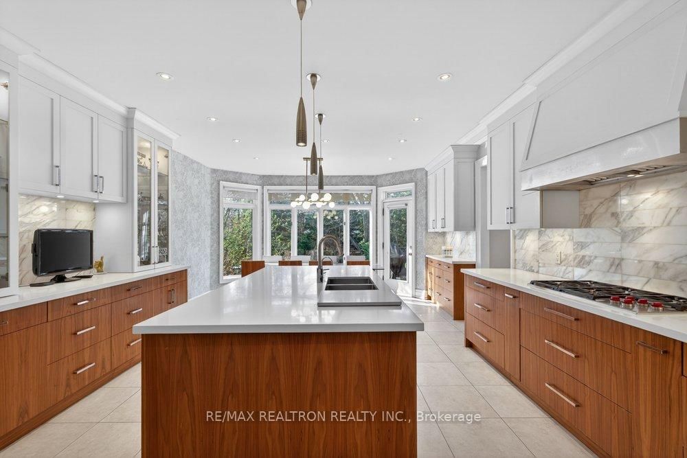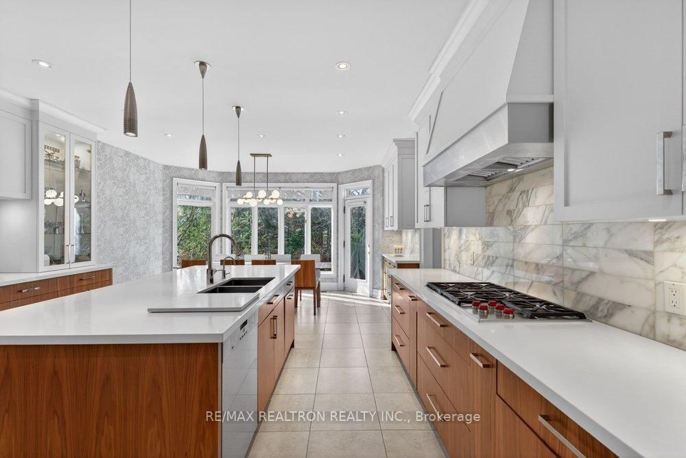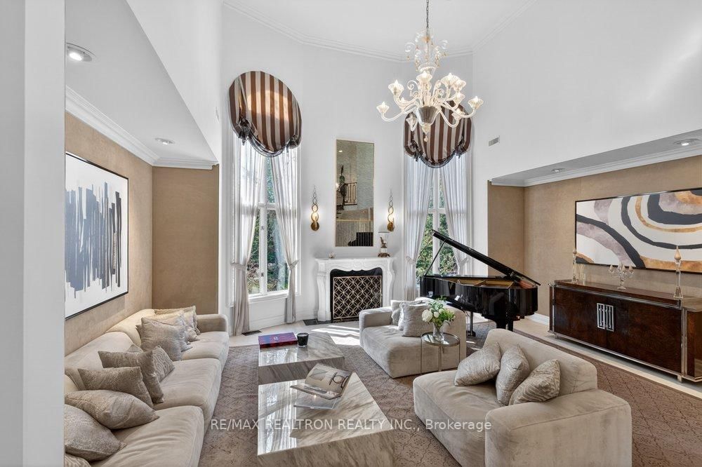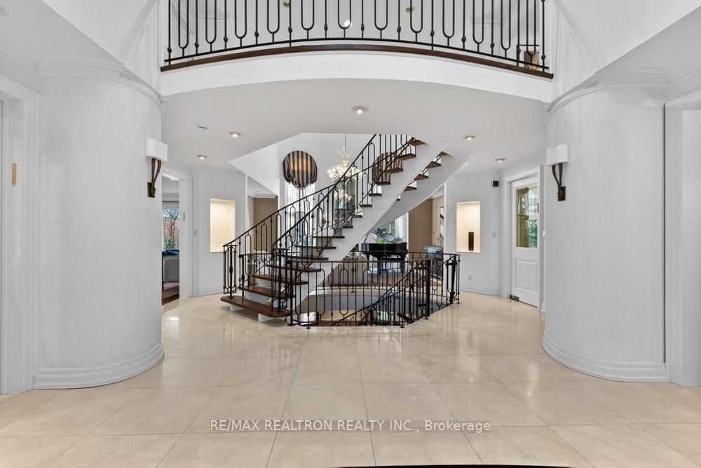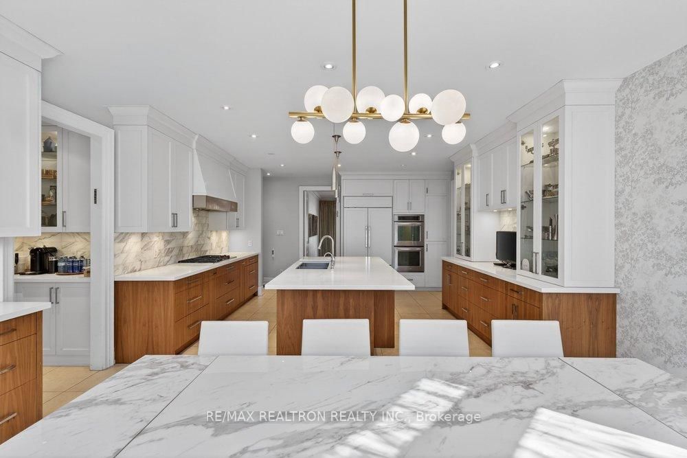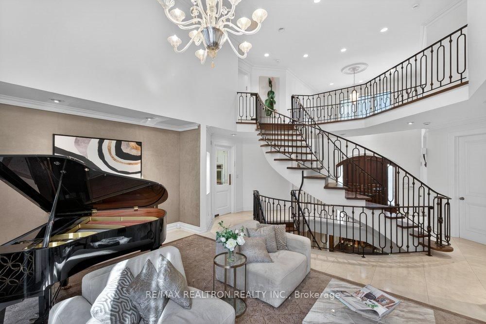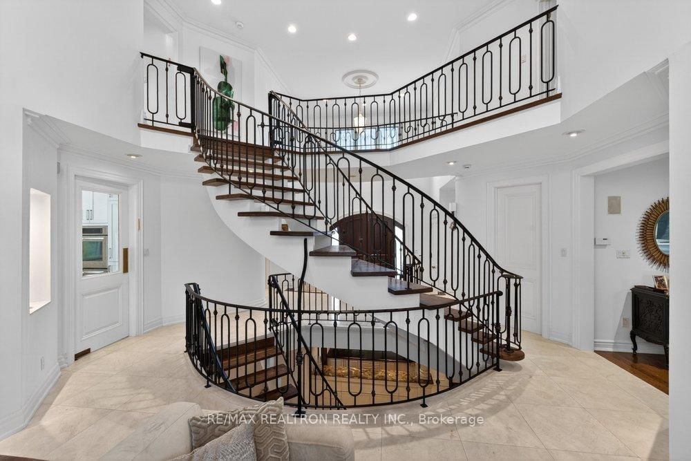 Exquisitely finished modern mansion in prime Thornhill, fully renovated top-to-bottom with sophisticated, high-end detailing throughout. The 2-Storey on 75 Arnold Avenue has 5 bedrooms, 7 bathrooms, and is located on a 182 x 100 ft lot in the community of Crestwood-Springfarm-Yorkhill . The interior showcases a dramatic foyer and great room with soaring 21+ ft cathedral ceilings, enhancing light and volume, while 24" x 24" Crema Marfil limestone slabs flow seamlessly across the main level. A custom walnut kitchen is appointed with Caesarstone countertops, premium built-ins, and top-tier appliances including Sub-Zero fridge, Miele dishwasher, and Wolf cooktop with hood fan. A striking three-level floating staircase with wrought iron railings serves as a central architectural feature, complemented by three fireplaces and a refined private office with natural wood cabinetry. The primary suite offers a tranquil retreat with its own balcony, while all washrooms and the lower level have been fully renovated to a fresh, modern standard. California Closets provide tailored organization throughout. The exterior completes the offering with a private backyard oasis featuring a Betz concrete pool, waterfall, hot tub, Credit Valley flagstone, interlock driveway, and a full sprinkler system, ideal for both relaxation and upscale entertaining.
