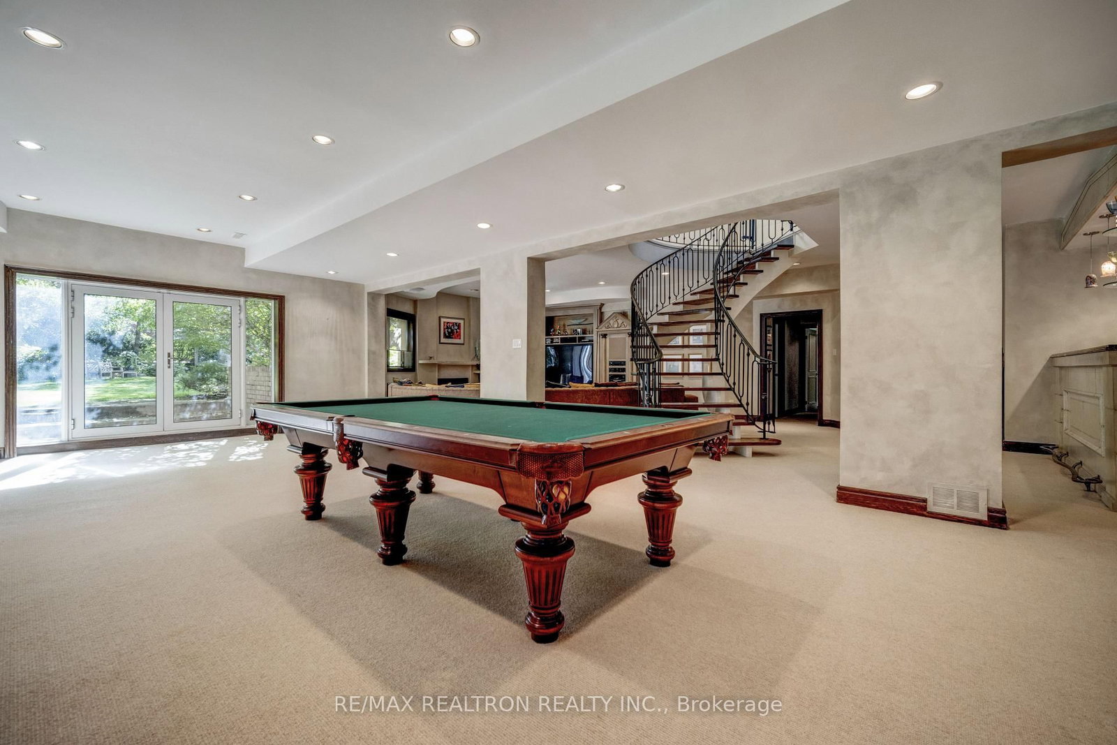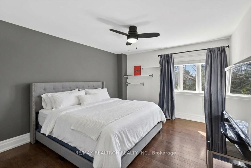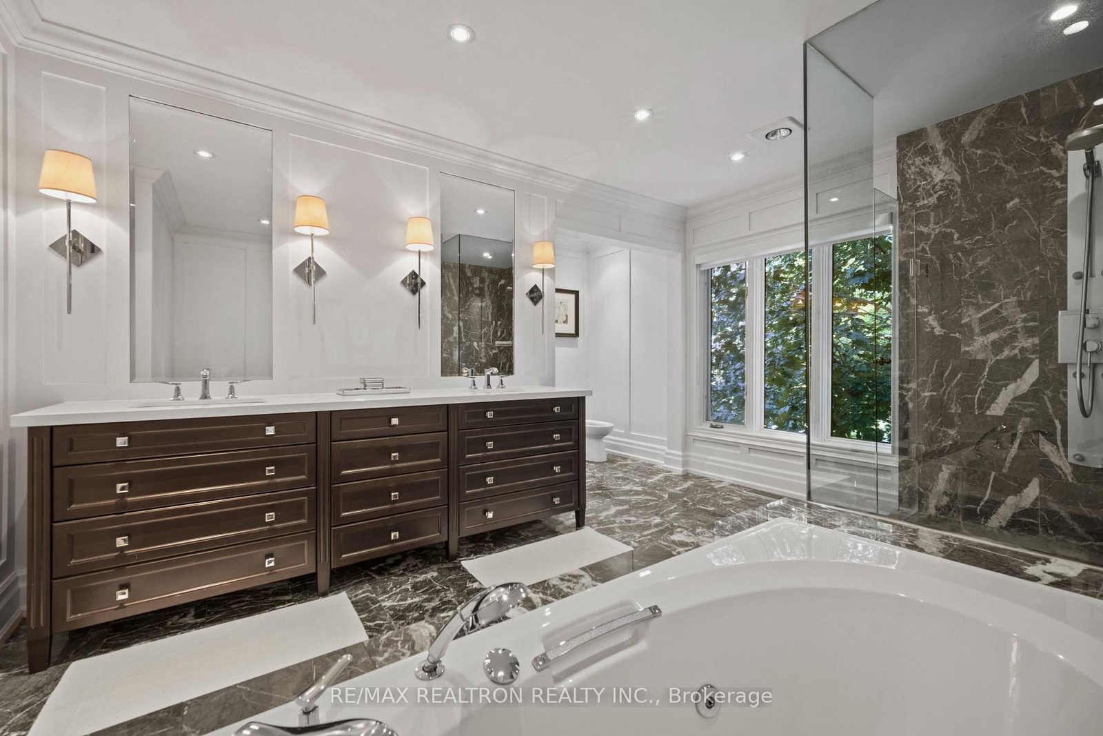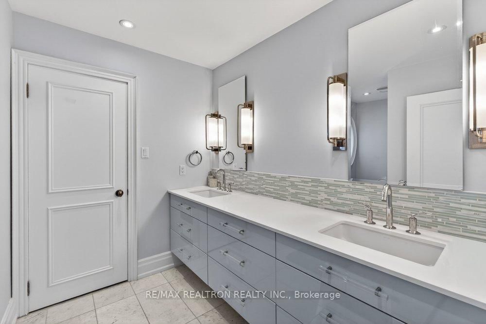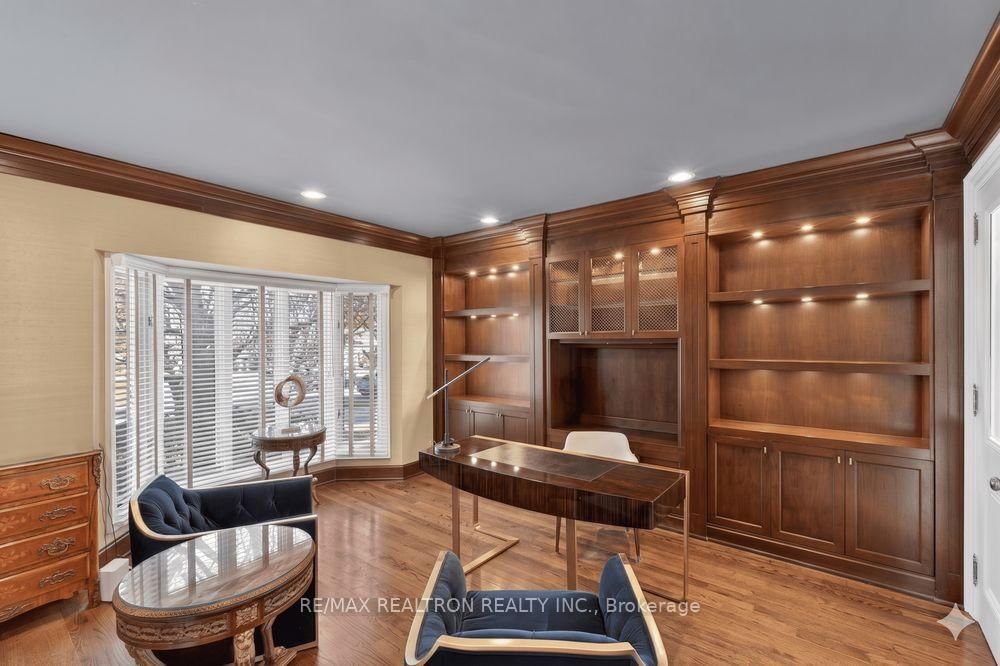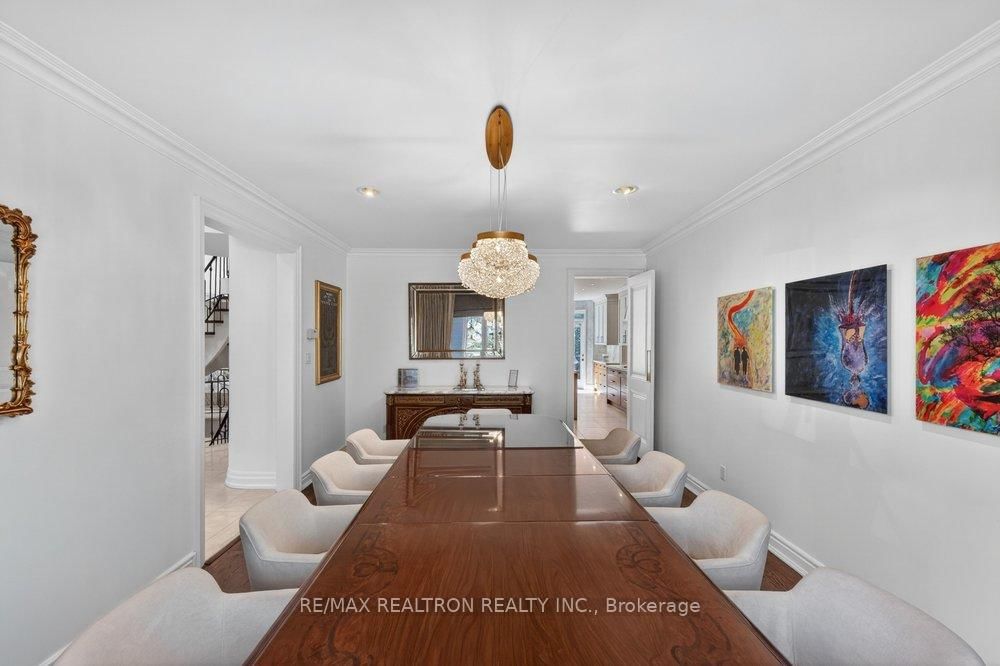 Exquisitely finished modern mansion in prime Thornhill, fully renovated top-to-bottom with sophisticated, high-end detailing throughout. The 2-Storey on 75 Arnold Avenue has 5 bedrooms, 7 bathrooms, and is located on a 182 x 100 ft lot in the community of Crestwood-Springfarm-Yorkhill . The interior showcases a dramatic foyer and great room with soaring 21+ ft cathedral ceilings, enhancing light and volume, while 24" x 24" Crema Marfil limestone slabs flow seamlessly across the main level. A custom walnut kitchen is appointed with Caesarstone countertops, premium built-ins, and top-tier appliances including Sub-Zero fridge, Miele dishwasher, and Wolf cooktop with hood fan. A striking three-level floating staircase with wrought iron railings serves as a central architectural feature, complemented by three fireplaces and a refined private office with natural wood cabinetry. The primary suite offers a tranquil retreat with its own balcony, while all washrooms and the lower level have been fully renovated to a fresh, modern standard. California Closets provide tailored organization throughout. The exterior completes the offering with a private backyard oasis featuring a Betz concrete pool, waterfall, hot tub, Credit Valley flagstone, interlock driveway, and a full sprinkler system, ideal for both relaxation and upscale entertaining.