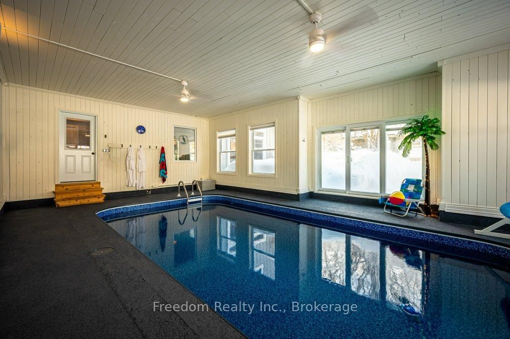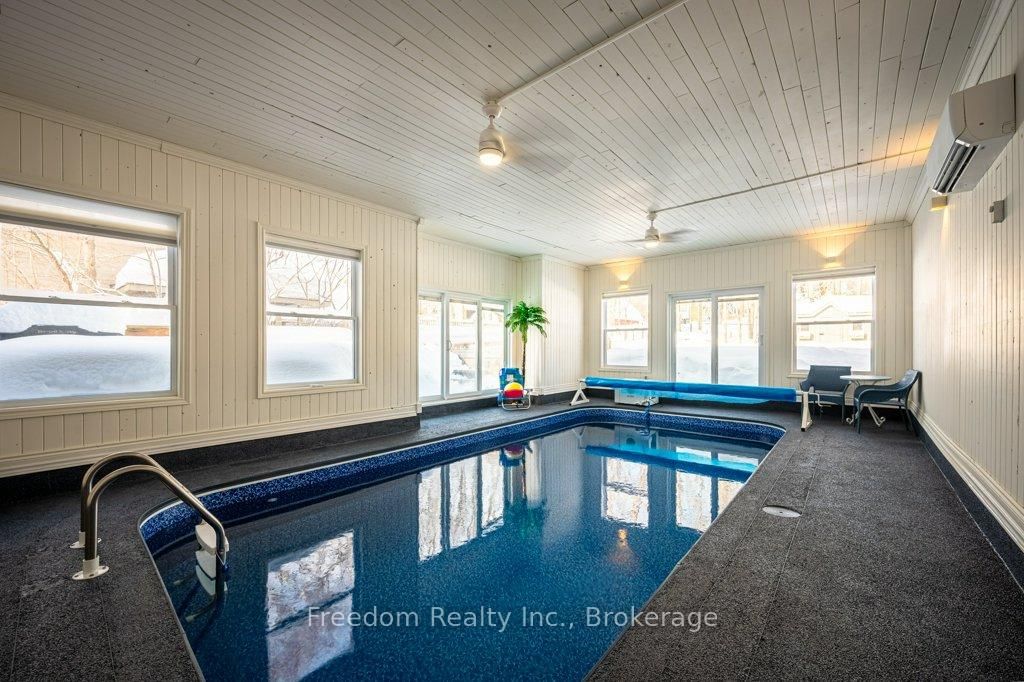 Located in the historic section of Orillia's prestigious north ward, & 10 min walk to Lake Couchiching . The 2-Storey on 14 Jarvis Street has 5 bedrooms, 4 bathrooms, and is located on a 214.34 x 51.92 ft lot in the community of Orillia . This perfect 4 bedroom home allows for privacy, relaxation , & is suited to just about any lifestyle choice - including small to large families & even those that prefer to work from home . This bright replica of a Century Home was built in 1989 & has so many upgrades. It is set back on a private, beautifully landscaped 1/4 acre + property & has an expansive fenced-in backyard that encompasses a large rear deck & outdoor hot tub ( 2021 ) that is a natural extension from the various walkouts along the walls of the indoor pool & living room ! The luxurious kitchen , ideally set between the living & dining rooms, has newer quartz kitchen counters/backsplash ( 2024 ) & includes a large pantry . Plenty of thermal glazing surrounds the salt water indoor pool area & is children friendly with its 4 ft depth & is also great for getting those laps in - any time of the year ! The upgraded " salt based " pool ( new liner and pool heater 2025 ) comes with a newer dehumidifier, wall mounted heat pump , & protective rubberized coating on the walkway around the pool. The main floor laundry has a 2-piece bathroom, walkout to the side yard, and entrance doors to the pool area and garage. The 4 large children/ guest bedrooms on the 2nd floor offer plenty of closet space & include beautiful hardwood floors . There is one 5 pc & one 3 pc bathroom ideally positioned to service the four bedrooms ! The main bedroom contains hardwood floors, oversized walk-in closet , 5 pc ensuite , walkout to front deck, & its own heat pump ( primarily for AC use in summer). The large basement is presently being used as an entertainment area with good size windows. The custom garage door ( 2024 ) allows for a larger truck & the cement driveway was upgraded in ( 2019). Don't forget - the durable metal roof will protect your investment for many years to come !