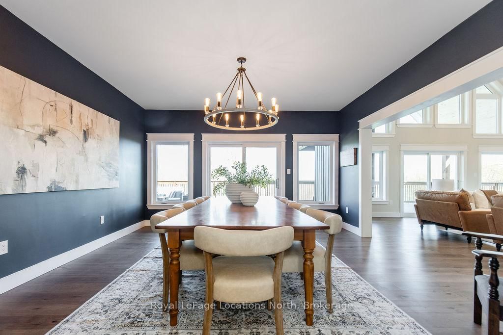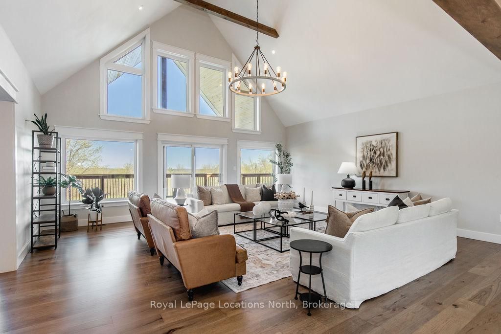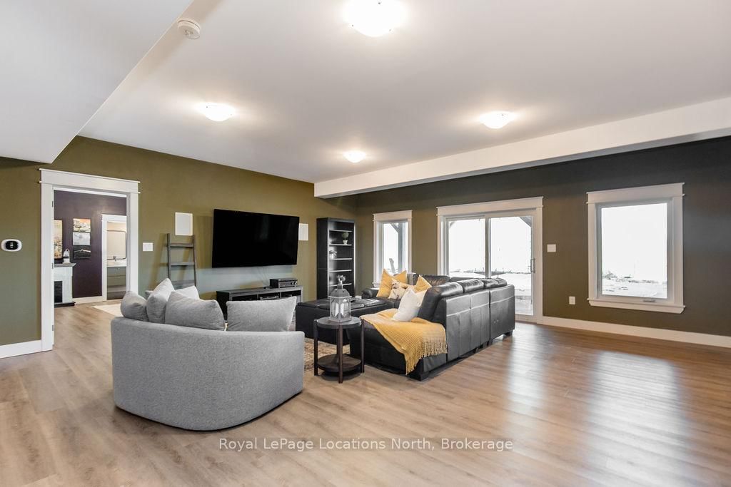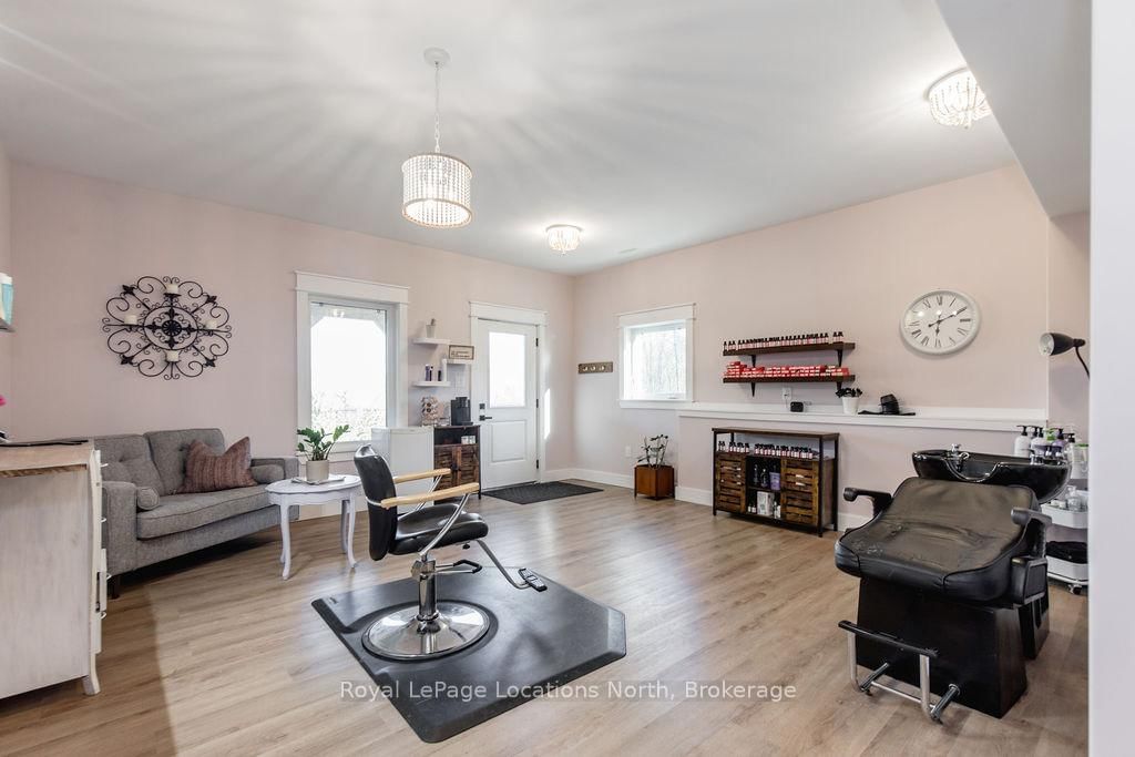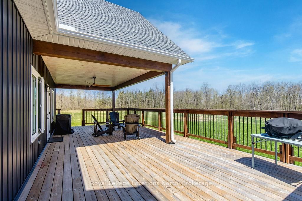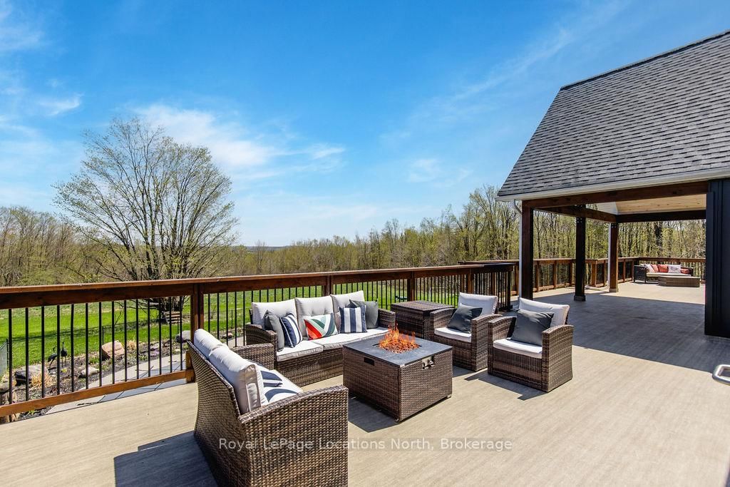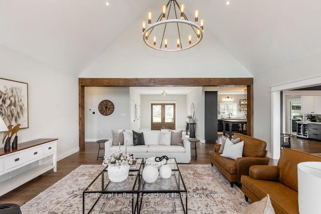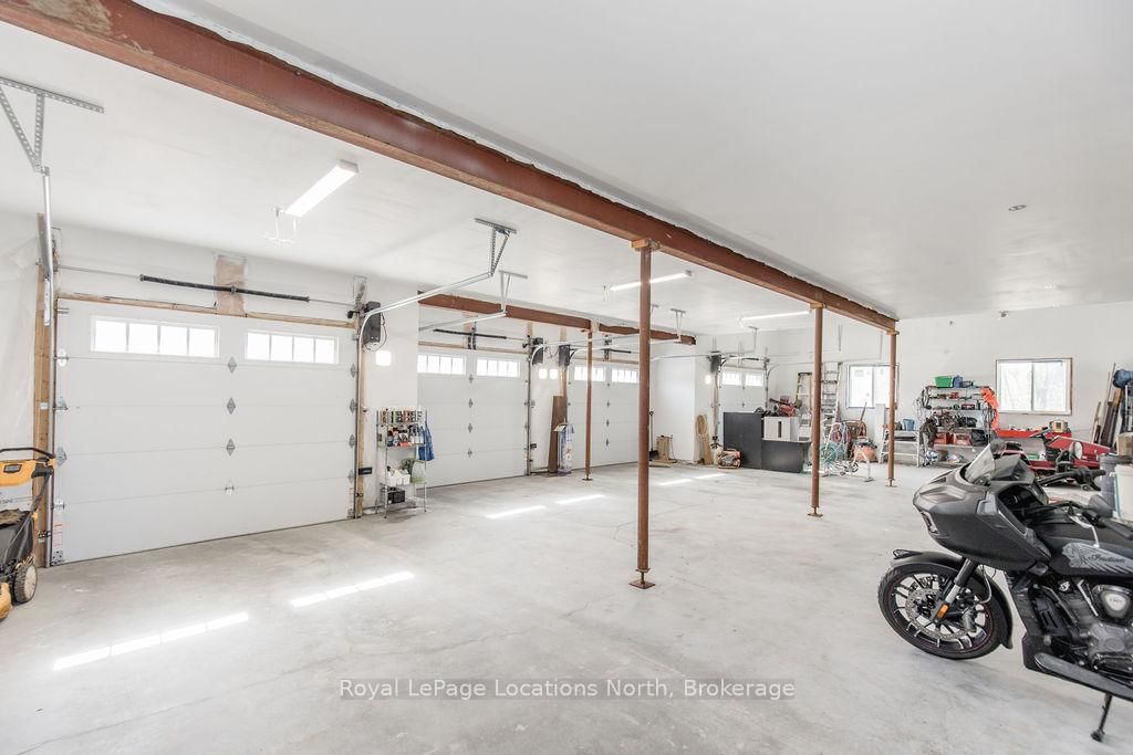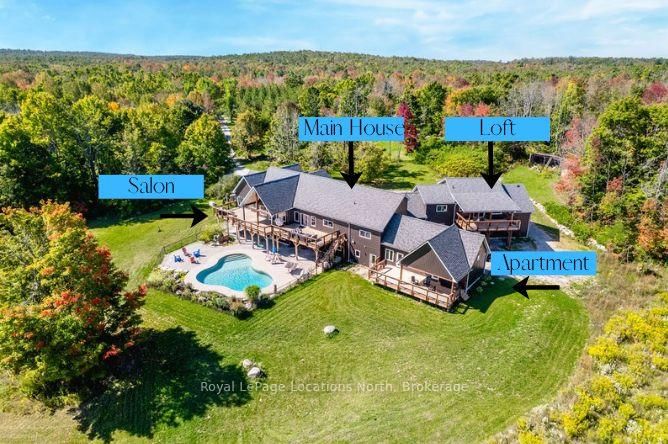 FAMILY COMPOUND | Built in 2022, this expansive 9,000 sqft estate on 100 acres is ideal for multi-generational living, family compound use, or rental income potential. The Bungalow-Raised on 5385 8 Line N has 5 bedrooms, 6 bathrooms, and is located on 100 + acres in the community of Moonstone . The property includes a custom main residence, a legal ranch-style accessory apartment with private laundry & a self-contained loft suite above a heated 4-car garage, offering exceptional flexibility. A grand foyer flows into a stunning living room featuring floor-to-ceiling windows & expansive panoramic views of the acreage. The main home features 3+2 bedrooms, 3 full & 2 half bathrooms, 9' ceilings & engineered hardwood throughout the main level. The great room showcases 19' vaulted ceilings with walk-out access to a covered deck overlooking the pool.The chef's kitchen & formal dining area are designed for entertaining, complete with quartz countertops, oversized custom island, double farmhouse sink, and premium stainless steel appliances. The primary suite is a private retreat with deck access, dual walk-in closets & a spa-inspired 5-piece ensuite featuring a soaker tub, walk-in shower, dual quartz vanity & private water closet.The walk-out lower level includes a large recreation room, two additional bedrooms & a dedicated salon with powder room, ideal for a home business, studio, or professional workspace, finished with durable vinyl plank flooring.The legal accessory apartment offers vaulted ceilings, an open-concept layout, quartz kitchen counters, private covered deck & in-suite laundry - perfect for extended family or income-generating rental use. The loft suite includes a bedroom, 4-piece bath, kitchenette & private deck for guests or independent living.The heated 4-car garage features 10' and 14' ceilings, ideal for car enthusiasts, storage, or workshop use. Outdoors, the 100-acre property supports hiking trails, hobby farming, recreational use, or a private nature retreat. Enjoy a resort-style outdoor setting with a heated 20' x 40' saltwater pool, multiple decks & expansive green space.