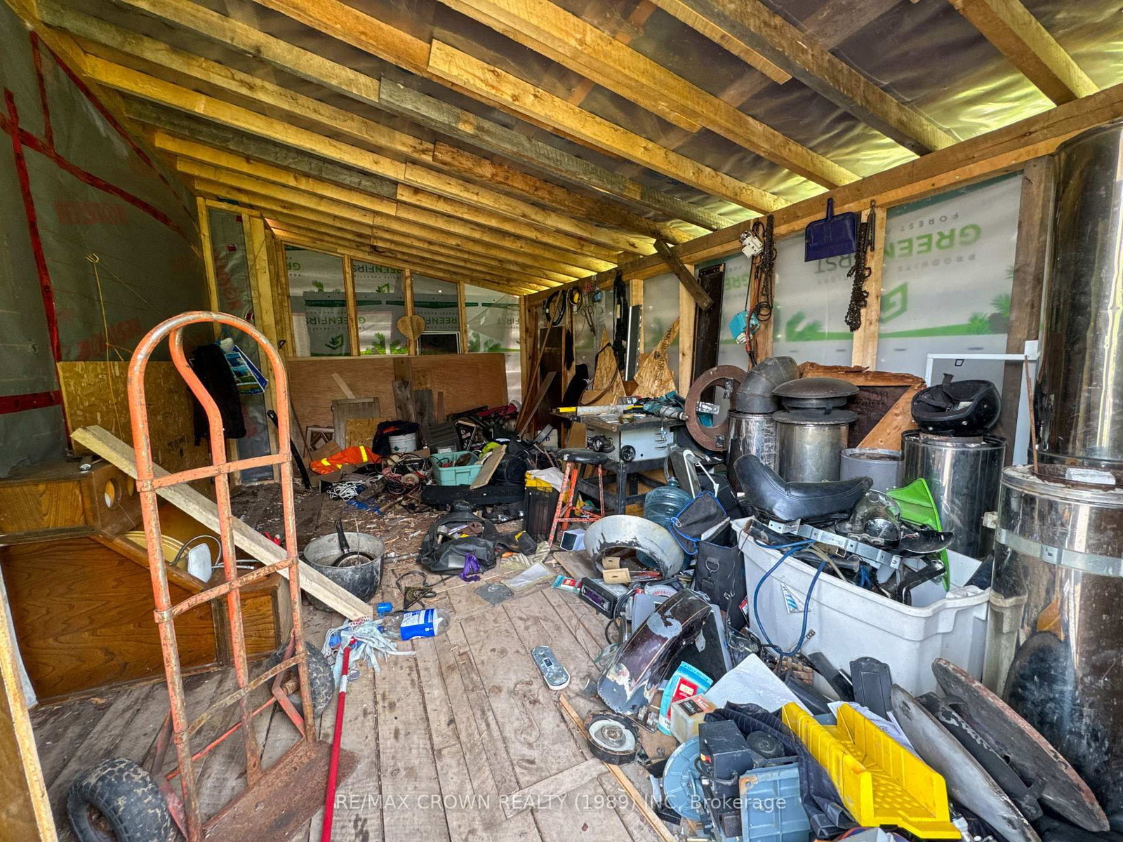 Everything currently on the property, which includes the riding lawn mower, well equipment, building materials, tools, solar panels, etc.