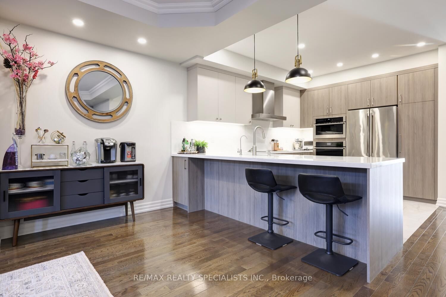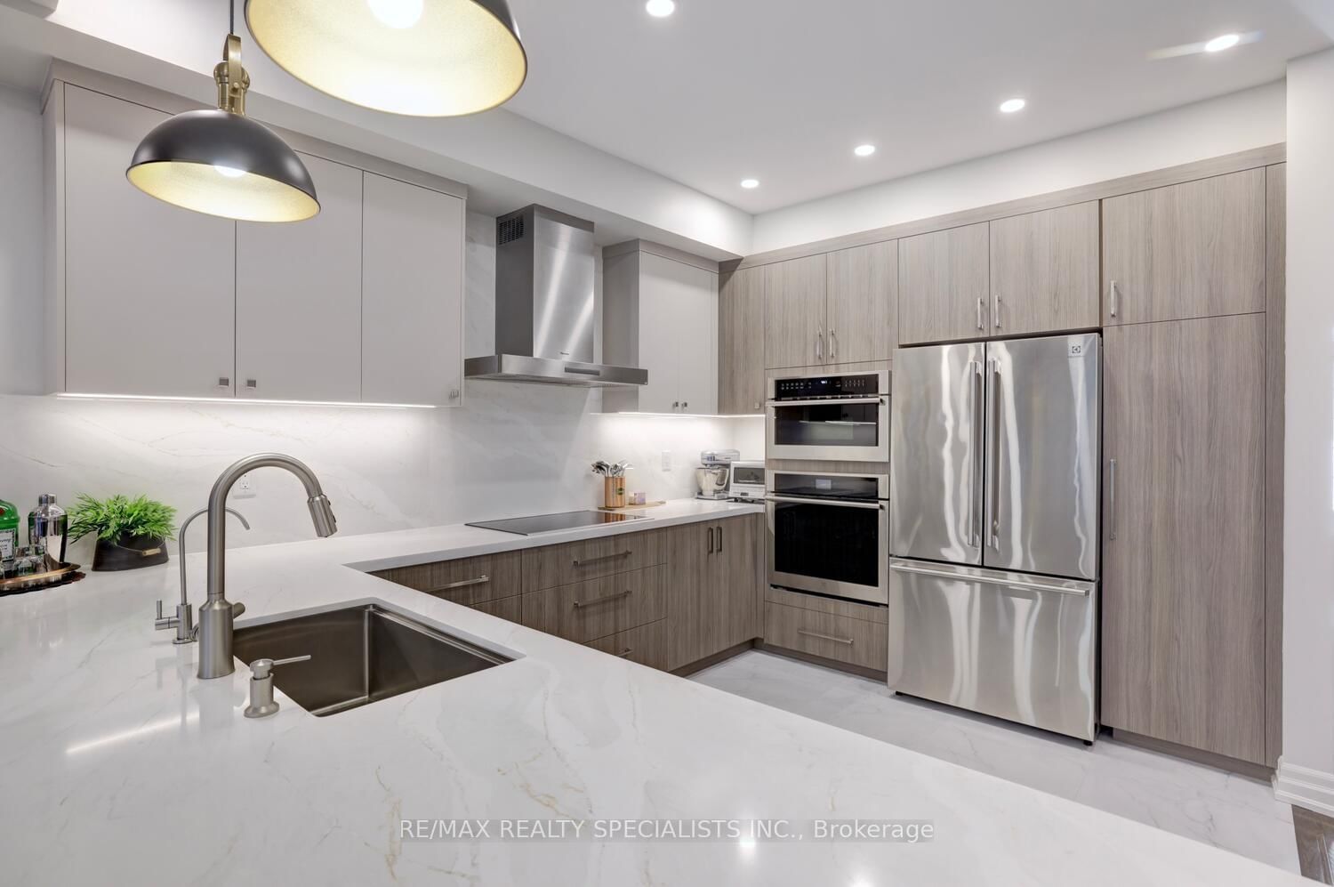Electrolux stainless steel fridge, Electrolux wall oven, Electrolux microwave, Bosch cooktop, Thermador stainless steel range hood, Bosch dishwasher, Samsung front load steam washer and dryer, all light fixtures, new led pot lighting, custom window coverings, attached television mount, garage door opener with remote, Whirlpool water softener, Ecobee thermostat and doorbell.