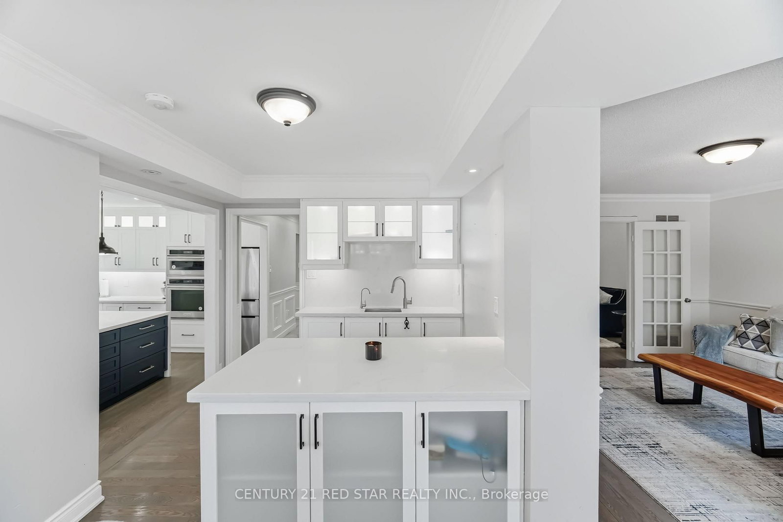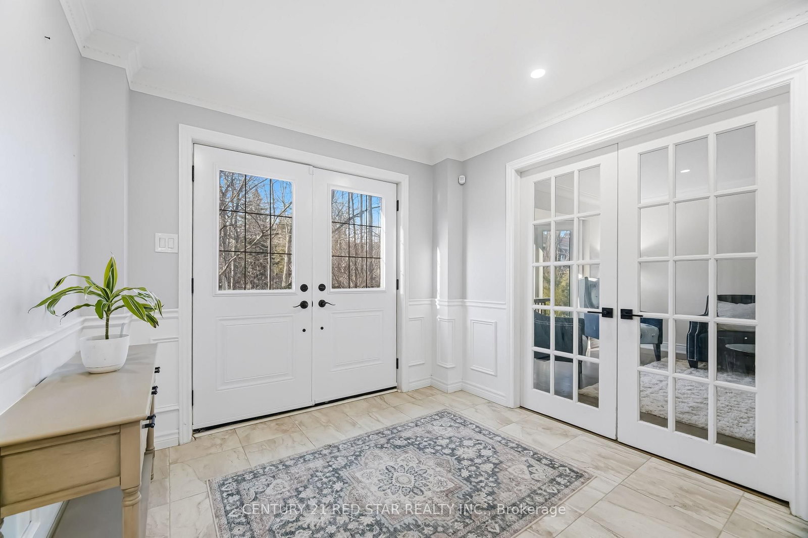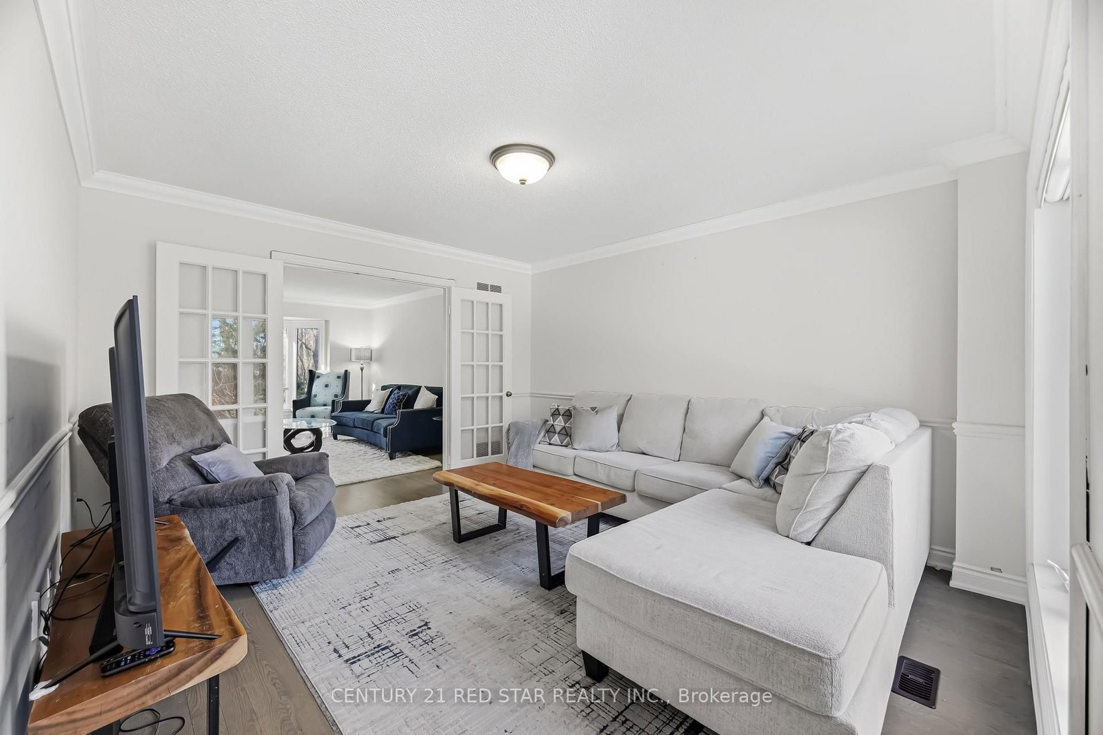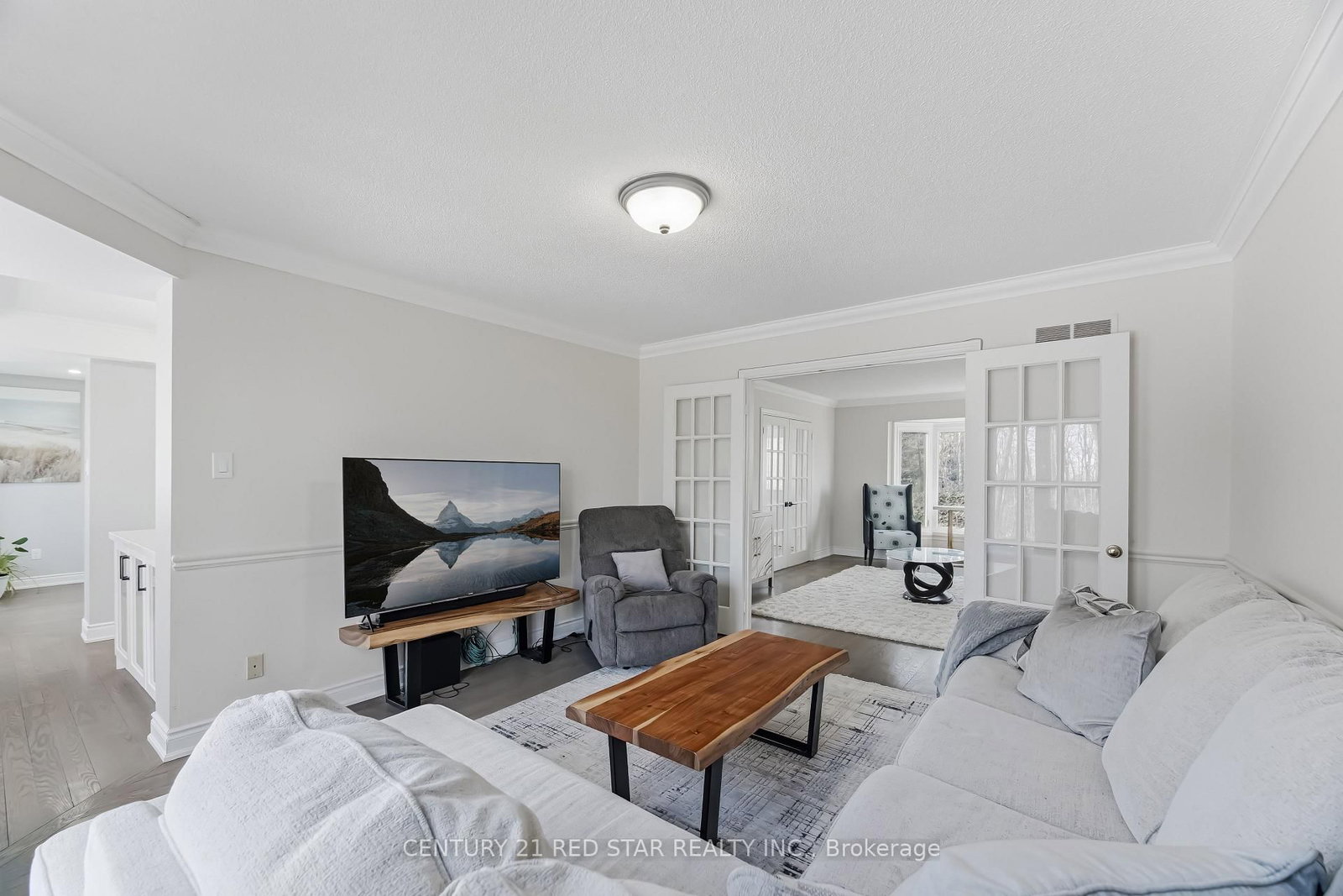 • Living Room: hardwood floor, Crown Moulding, French Doors
