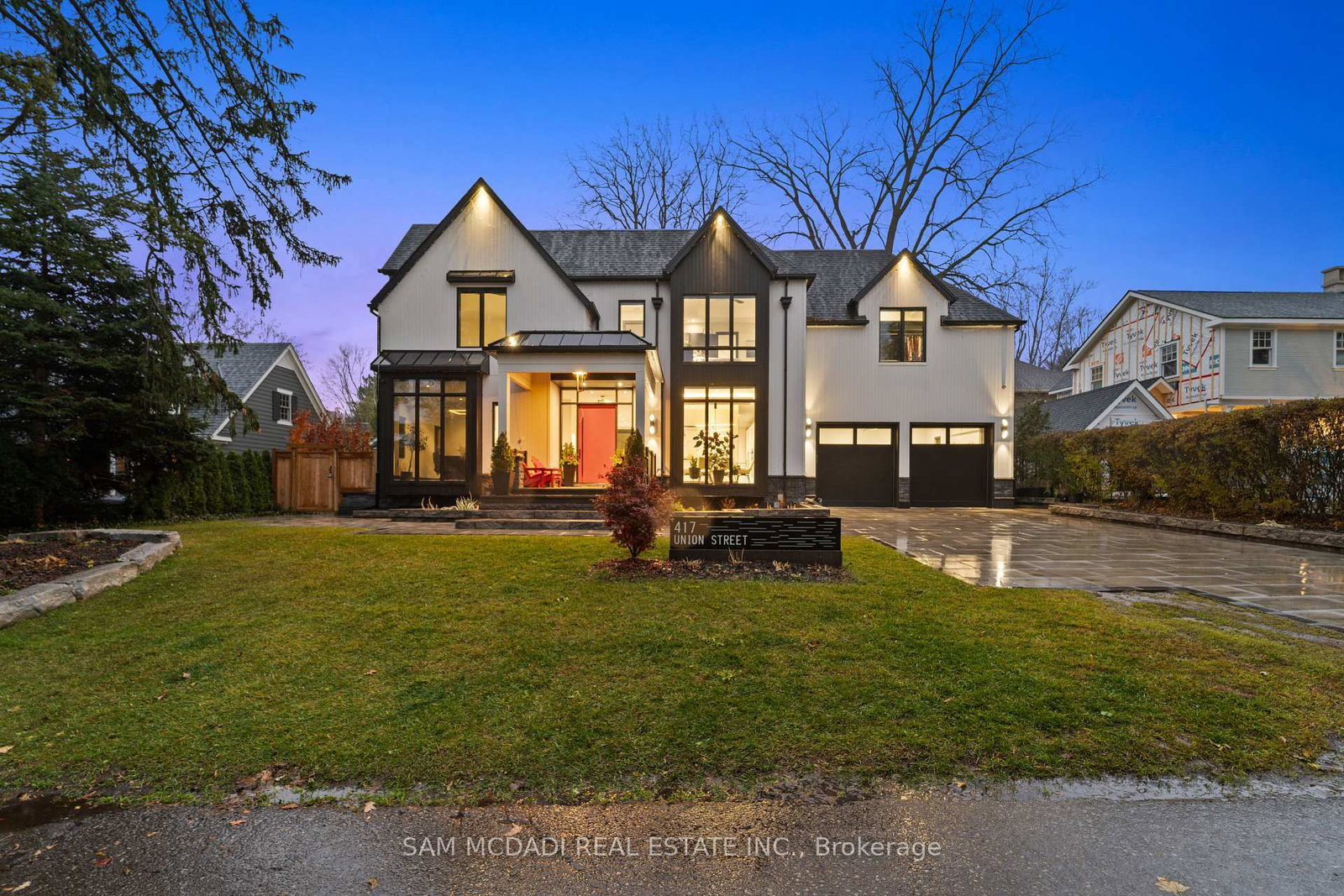Welcome to 417 Union Street, an exceptional modern home nestled in the heart of prestigious Old Oakville. The 2-Storey on 417 Union Street has 4 bedrooms, 8 bathrooms, and is located on a 100 x 73.3 ft lot in the community of Old Oakville . Completed in 2023, this one-of-a-kind residence blends modern farmhouse inspiration with refined contemporary and traditional design elements, creating a home that is both striking and timeless. The modern farmhouse exterior showcases clean lines, black-framed windows, and a harmonious mix of materials, complemented by a covered porch, professionally landscaped front and back yards, and a stone six-car driveway. The backyard offers a private retreat with a deck, stone patio, and custom garden shed. Inside, the home is filled with natural light and defined by a modern, sleek interior. Wide-plank engineered hardwood flooring, custom ceilings with integrated LED lighting, and large-format matte tiles elevate the main living areas. The chef-inspired kitchen features quartz countertops and backsplash, an oversized centre island, built-in Bosch appliances, and a convenient adjoining servery. A tiered maple staircase with glass railings leads to the upper level, where skylights continue the home's bright and airy feel. The expansive primary suite spans over 700 square feet and offers two walk-in closets and a luxurious five-piece ensuite with double vanity, freestanding tub, and glass-enclosed rainfall shower. Three additional bedrooms each include their own custom three-piece ensuite with modern walk-in showers. The fully finished lower level adds outstanding versatility with a second kitchen, large recreation room, two additional bedrooms with ensuites, and a powder room. Additional highlights include an elevator servicing all three levels, 10-ft ceilings on the main and lower levels, pot lights, blackout blinds, built-in speakers, and a security system. Ideally located minutes from Lake Ontario, parks, trails, Oakville GO, the QEW, and top-ranked schools including Appleby College, this home delivers modern luxury, thoughtful design, and an exceptional lifestyle.