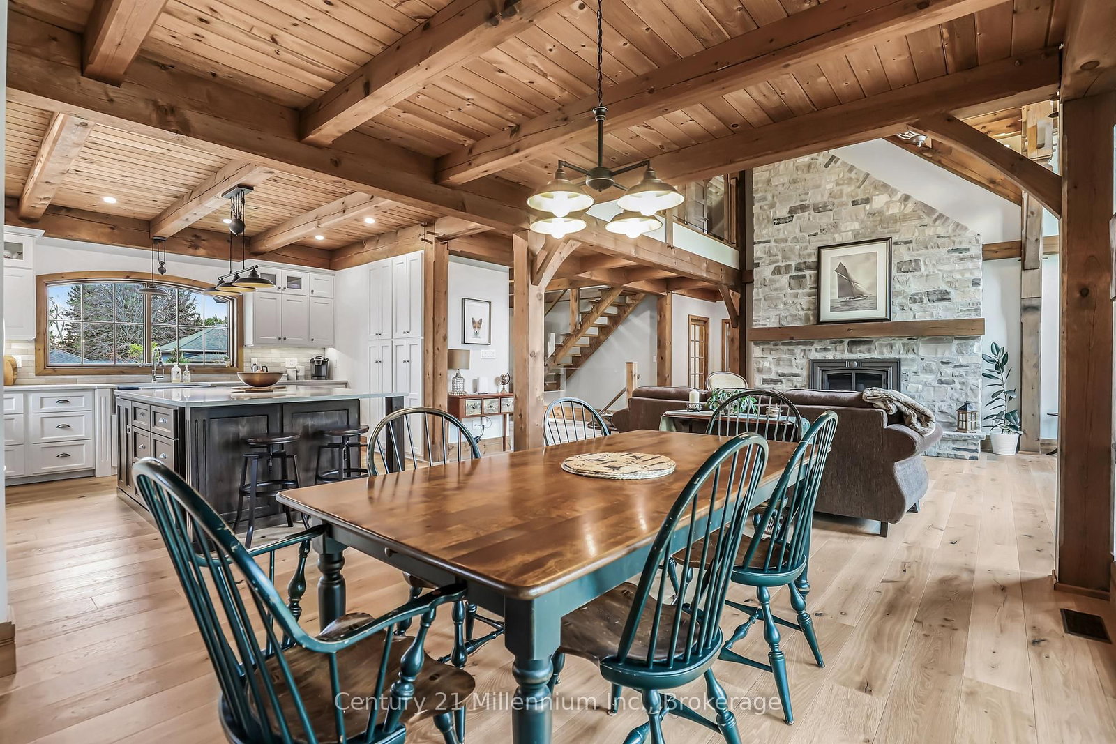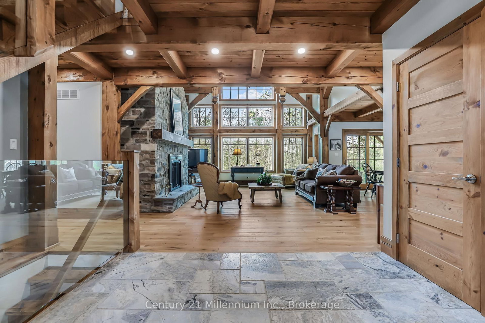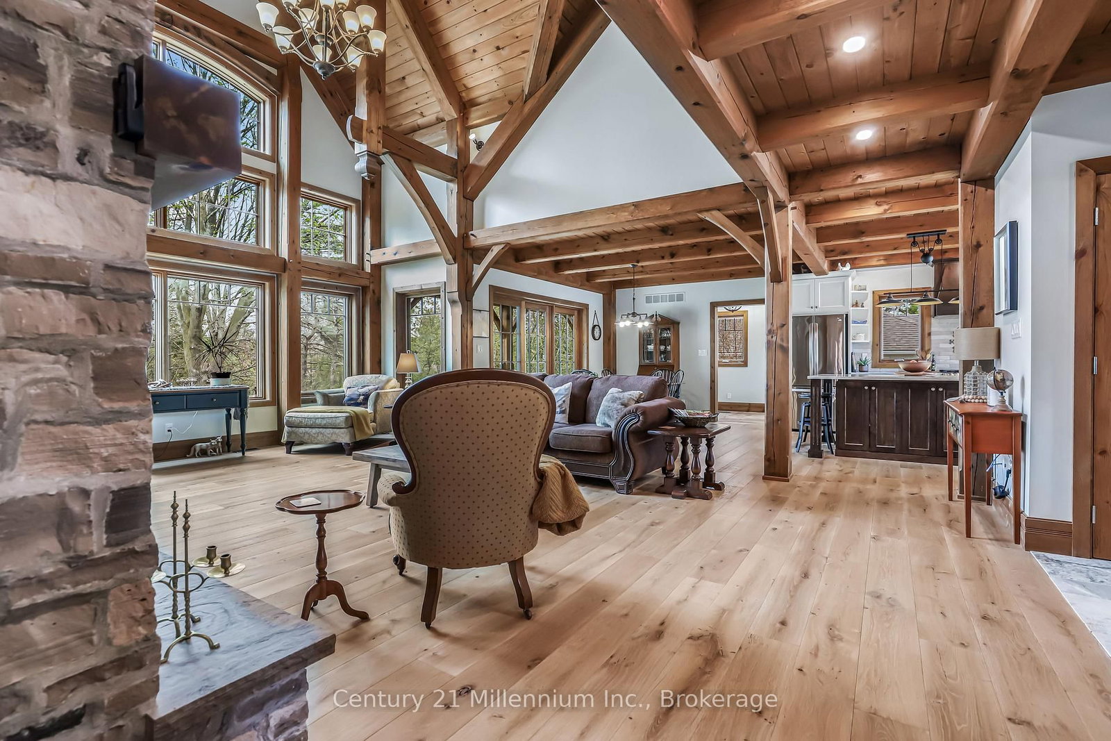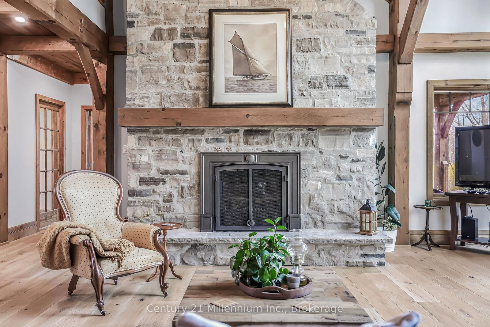 A Rare Riverfront Retreat in Southampton. The 1 1/2 Storey on 166 Clarendon Street has 3 bedrooms, 4 bathrooms, and is located on a 208.11 x 75 ft lot in the community of Saugeen Shores . Welcome to a one-of-a-kind timber frame masterpiece nestled on the banks of the Saugeen River, just steps from the shores of Lake Huron. This extraordinary home blends artisan craftsmanship with refined luxury in one of Ontario's most coveted locations. From the moment you step into the grand foyer, you're greeted by a stunning interplay of natural elements rich timber beams, elegant tile, and soaring glass. The dramatic living room is the heart of the home, where cathedral ceilings and exposed hammerbeam trusses frame a floor-to-ceiling stone fireplace. Sunlight floods the space through expansive windows, creating a warm and inviting ambiance. The chefs kitchen is an entertainers dream, with a generous central island that seats five, gleaming quartz countertops, and exquisite cabinetry with custom pot drawers and glazed uppers. Host elegant dinners in the dining room, or step onto the raised balcony to dine alfresco with views of your private, treed backyard. The main floor primary suite is a tranquil escape featuring its own secluded balcony, a lavish 5-piece spa-inspired ensuite with freestanding soaker tub, glass walk-in shower, double vanity, and a generous walk-in closet. Upstairs, a glass-railed loft overlooks the living room, flanked by two private bedrooms and a luxurious central bath. The fully finished lower level offers even more indulgence: a radiant-heated family room with stone hearth wood stove, wet bar, walk-out patio access, a spacious bedroom, full bath, exercise room, and a wine-lovers dream cold room. Just steps from Pioneer Park, the riverfront harbour, and Southampton's charming downtown, this home offers an unparalleled lifestyle of beauty, privacy, and prestige.