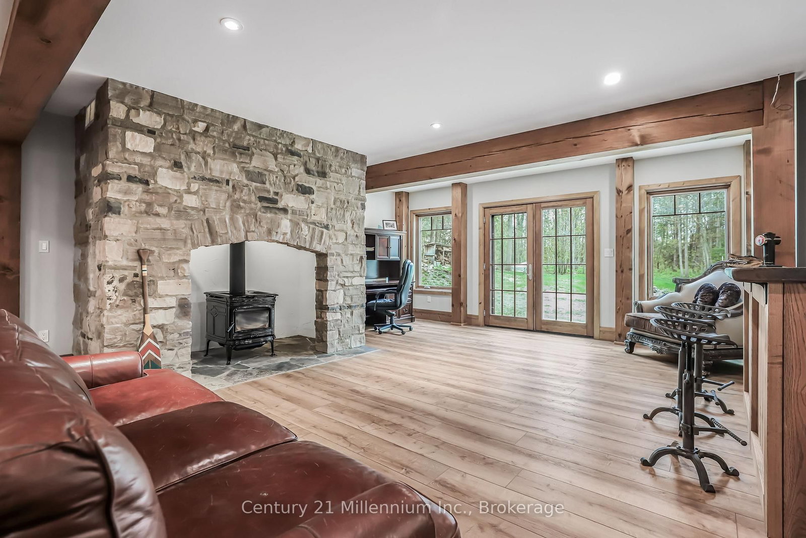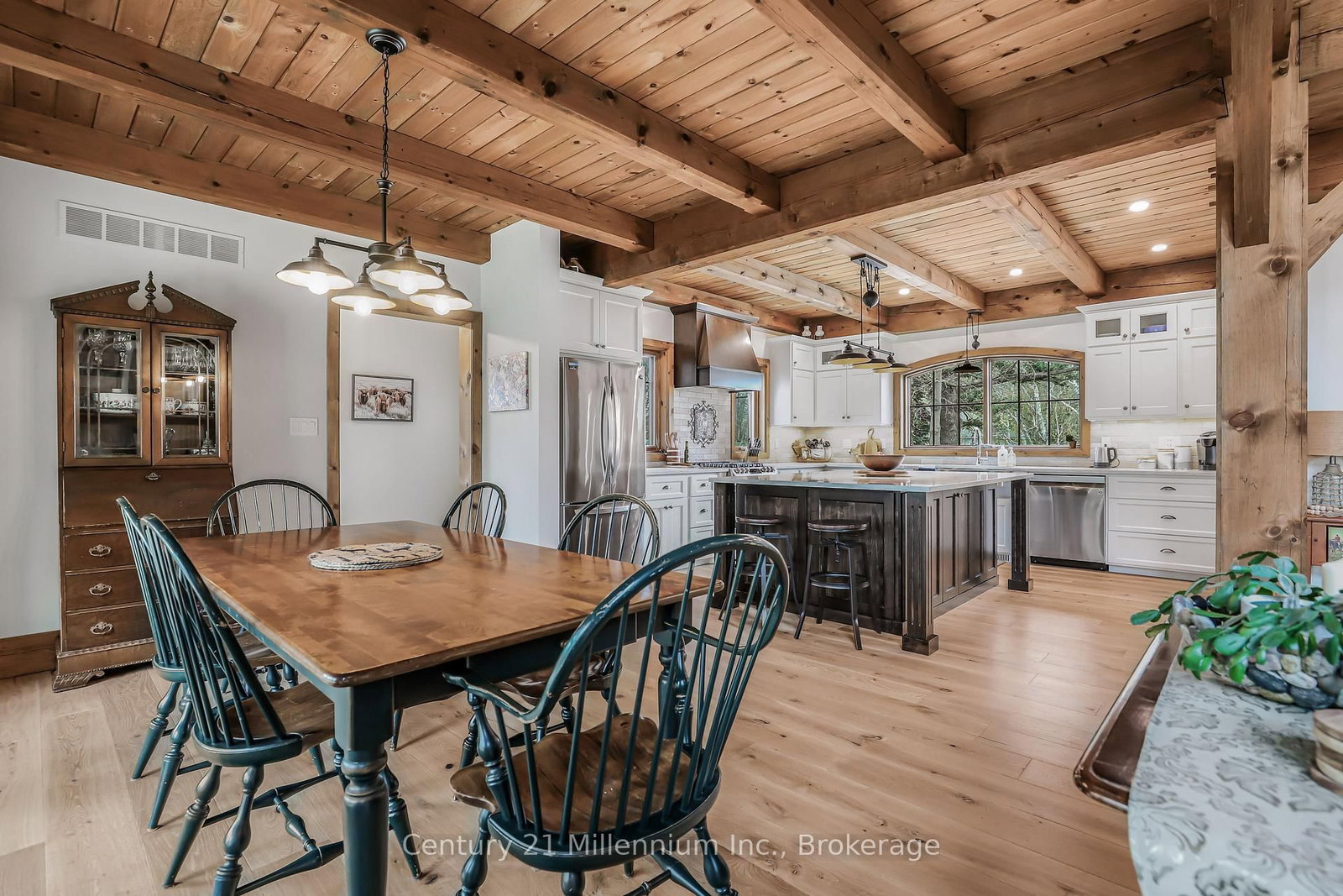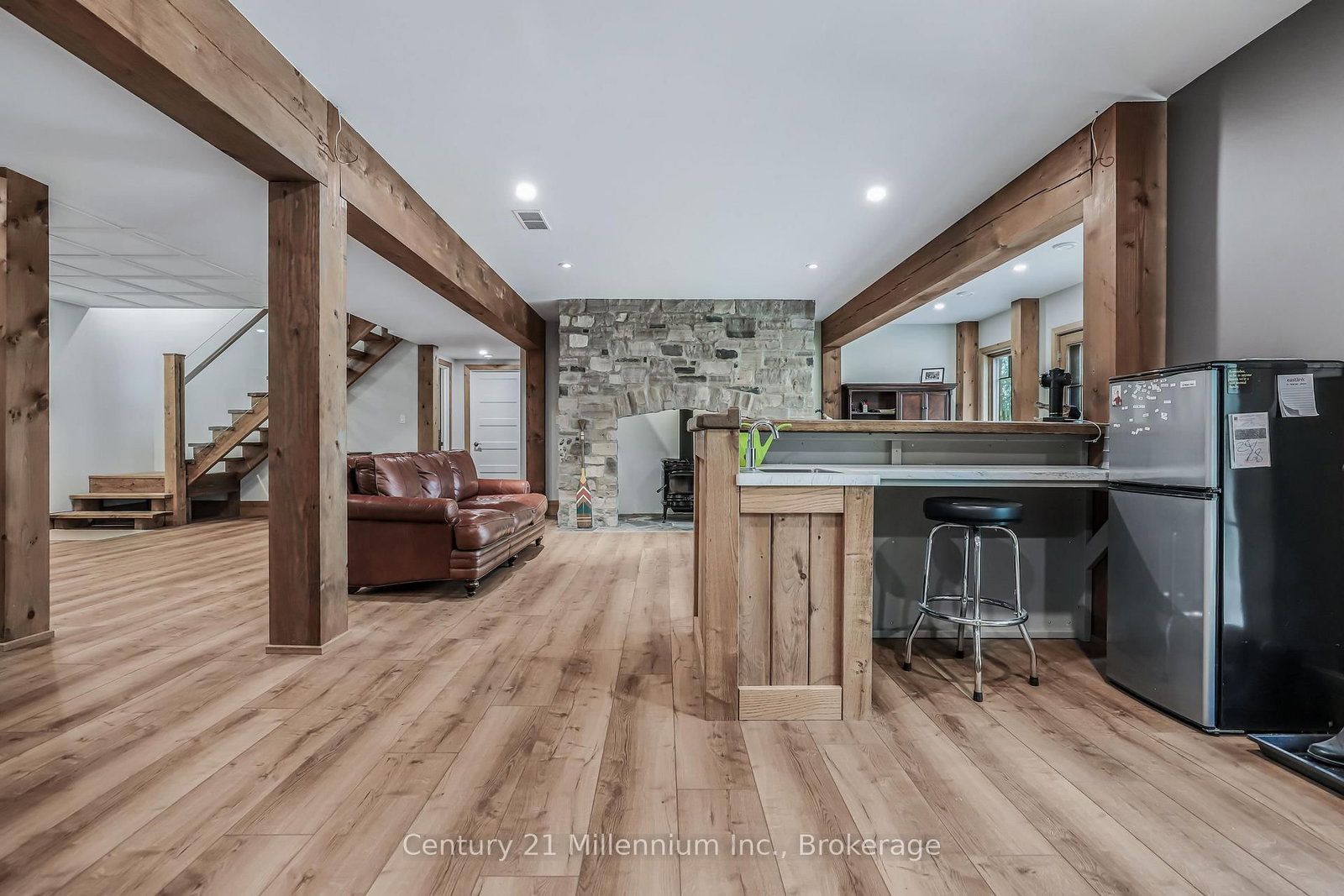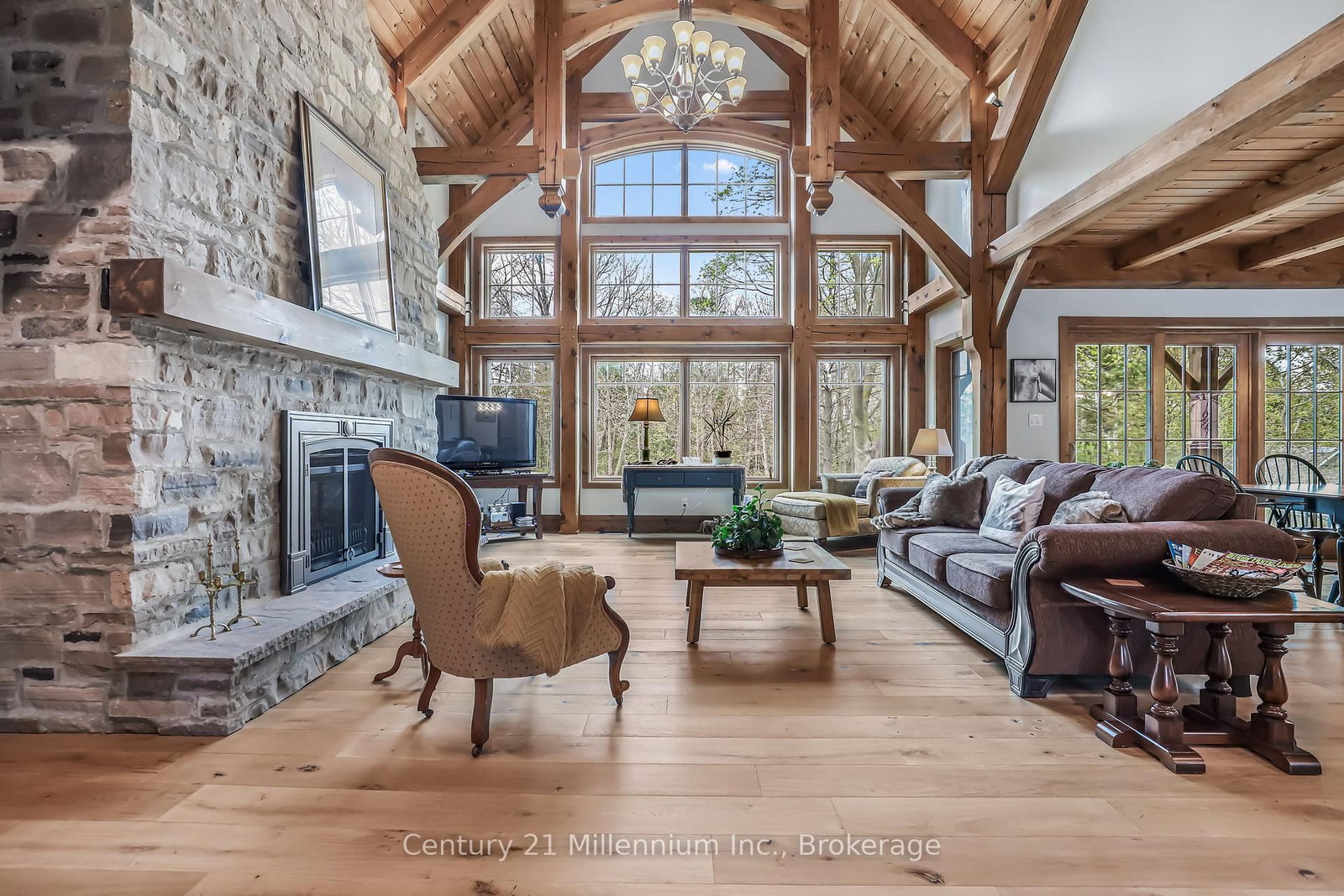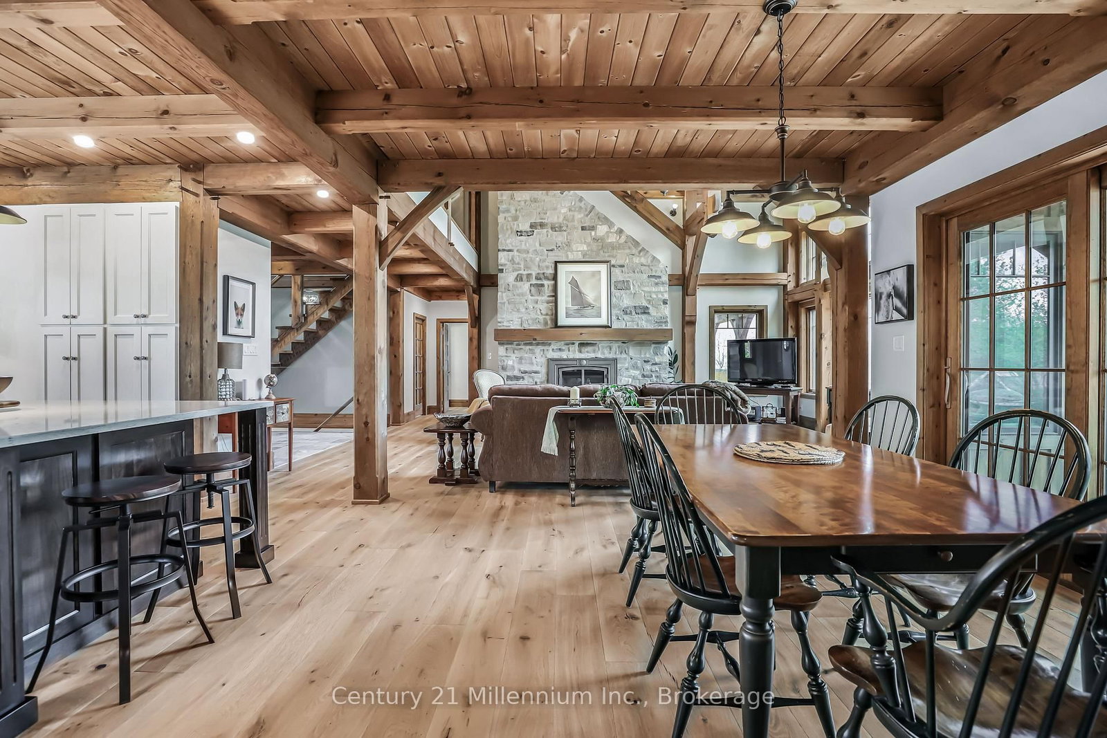 A Rare Riverfront Retreat in Southampton. The 1 1/2 Storey on 166 Clarendon Street has 3 bedrooms, 4 bathrooms, and is located on a 208.11 x 75 ft lot in the community of Saugeen Shores . Welcome to a one-of-a-kind timber frame masterpiece nestled on the banks of the Saugeen River, just steps from the shores of Lake Huron. This extraordinary home blends artisan craftsmanship with refined luxury in one of Ontario's most coveted locations. From the moment you step into the grand foyer, you're greeted by a stunning interplay of natural elements rich timber beams, elegant tile, and soaring glass. The dramatic living room is the heart of the home, where cathedral ceilings and exposed hammerbeam trusses frame a floor-to-ceiling stone fireplace. Sunlight floods the space through expansive windows, creating a warm and inviting ambiance. The chefs kitchen is an entertainers dream, with a generous central island that seats five, gleaming quartz countertops, and exquisite cabinetry with custom pot drawers and glazed uppers. Host elegant dinners in the dining room, or step onto the raised balcony to dine alfresco with views of your private, treed backyard. The main floor primary suite is a tranquil escape featuring its own secluded balcony, a lavish 5-piece spa-inspired ensuite with freestanding soaker tub, glass walk-in shower, double vanity, and a generous walk-in closet. Upstairs, a glass-railed loft overlooks the living room, flanked by two private bedrooms and a luxurious central bath. The fully finished lower level offers even more indulgence: a radiant-heated family room with stone hearth wood stove, wet bar, walk-out patio access, a spacious bedroom, full bath, exercise room, and a wine-lovers dream cold room. Just steps from Pioneer Park, the riverfront harbour, and Southampton's charming downtown, this home offers an unparalleled lifestyle of beauty, privacy, and prestige.