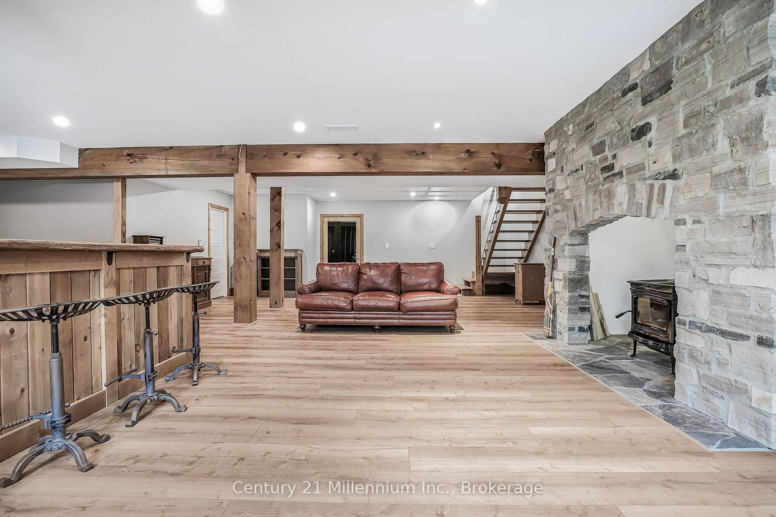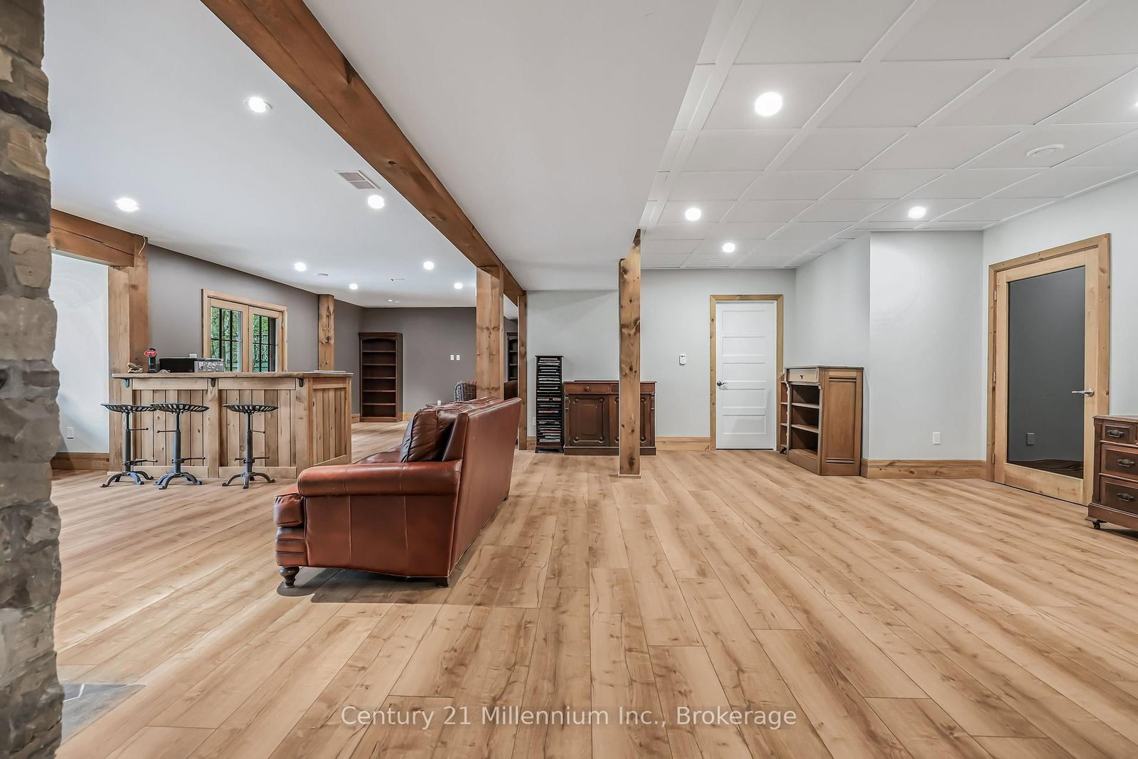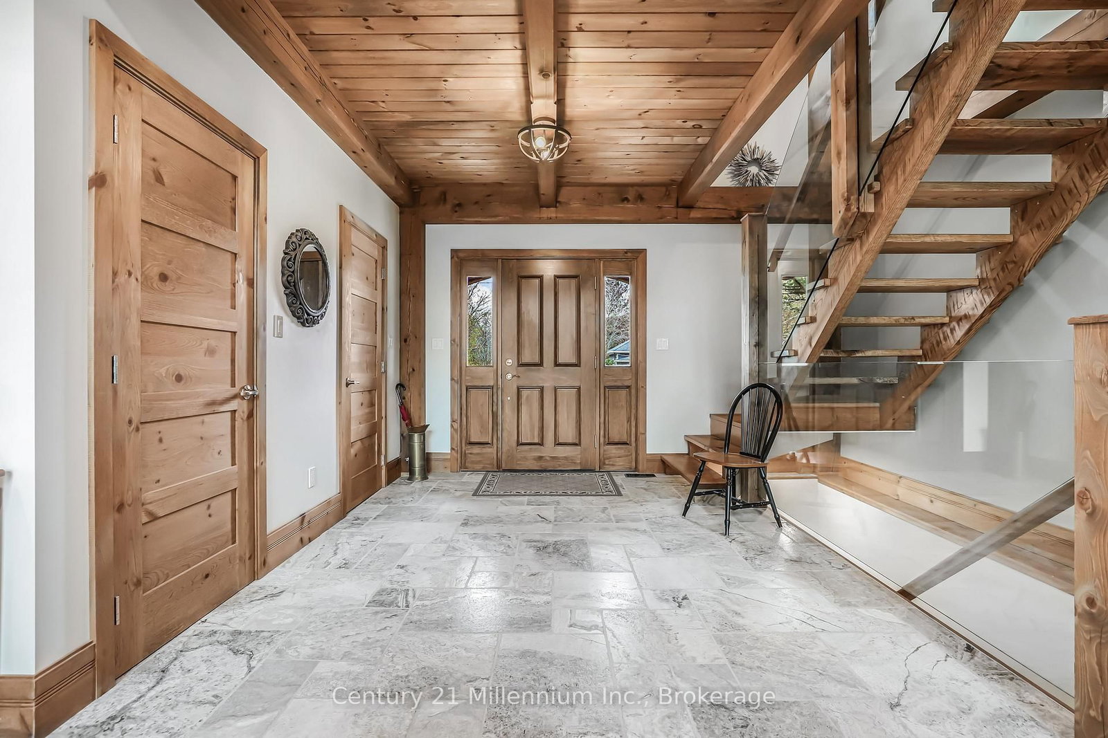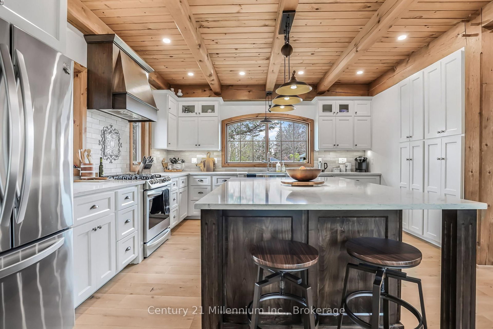 A Rare Riverfront Retreat in Southampton. The 1 1/2 Storey on 166 Clarendon Street has 3 bedrooms, 4 bathrooms, and is located on a 208.11 x 75 ft lot in the community of Saugeen Shores . Welcome to a one-of-a-kind timber frame masterpiece nestled on the banks of the Saugeen River, just steps from the shores of Lake Huron. This extraordinary home blends artisan craftsmanship with refined luxury in one of Ontario's most coveted locations. From the moment you step into the grand foyer, you're greeted by a stunning interplay of natural elements rich timber beams, elegant tile, and soaring glass. The dramatic living room is the heart of the home, where cathedral ceilings and exposed hammerbeam trusses frame a floor-to-ceiling stone fireplace. Sunlight floods the space through expansive windows, creating a warm and inviting ambiance. The chefs kitchen is an entertainers dream, with a generous central island that seats five, gleaming quartz countertops, and exquisite cabinetry with custom pot drawers and glazed uppers. Host elegant dinners in the dining room, or step onto the raised balcony to dine alfresco with views of your private, treed backyard. The main floor primary suite is a tranquil escape featuring its own secluded balcony, a lavish 5-piece spa-inspired ensuite with freestanding soaker tub, glass walk-in shower, double vanity, and a generous walk-in closet. Upstairs, a glass-railed loft overlooks the living room, flanked by two private bedrooms and a luxurious central bath. The fully finished lower level offers even more indulgence: a radiant-heated family room with stone hearth wood stove, wet bar, walk-out patio access, a spacious bedroom, full bath, exercise room, and a wine-lovers dream cold room. Just steps from Pioneer Park, the riverfront harbour, and Southampton's charming downtown, this home offers an unparalleled lifestyle of beauty, privacy, and prestige.