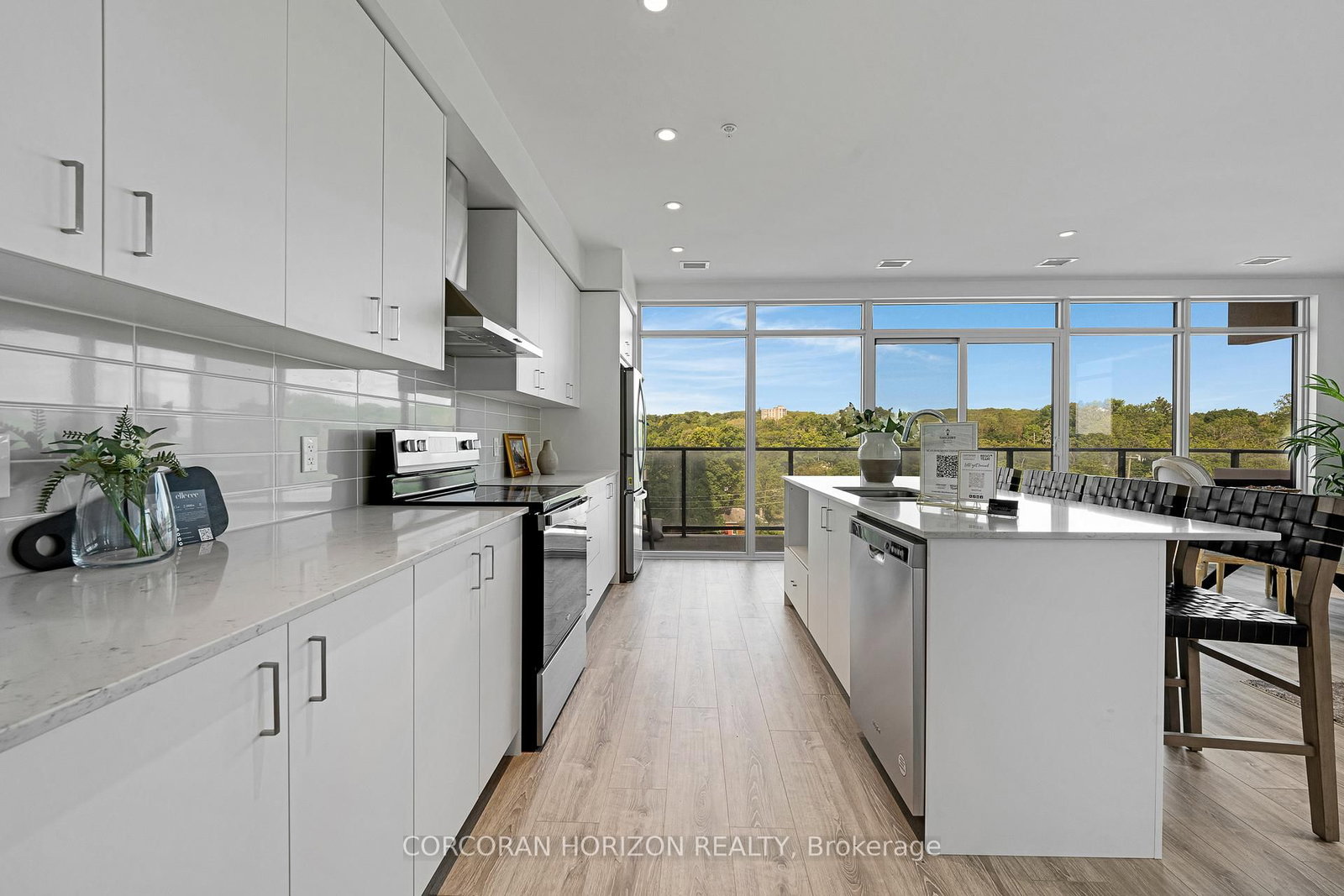 Rare Two-Bedroom Corner Unit with TWO Parking Spaces in the Coveted Gaslight District! Nestled in the heart of historic downtown Galt, this elegant two-bedroom, two-bathroom corner condo offers a perfect blend of style, comfort, and urban convenience. The Apartment on 801-50 Grand Avenue S has 2 bedrooms, 2 bathrooms, and is located in the community of . The highly sought-after Gaslight District combines residential, commercial, and cultural elements to create a vibrant and dynamic living experience. Step inside to find nine-foot painted ceilings, wide plank flooring, and premium finishes throughout. The modern kitchen is designed for both function and aesthetics, featuring sleek cabinetry, quartz countertops, a tile backsplash, an oversized island with an undermount sink and gooseneck faucet, and top-tier stainless steel appliances. The open-concept layout seamlessly connects the kitchen to the spacious living and dining areas, making it ideal for entertaining. Floor-to-ceiling windows and a generous balcony invite an abundance of natural light into the space. The primary suite is a private retreat, offering ample closet space, balcony access through sliding glass doors, and a spa-like four-piece ensuite with dual sinks and a walk-in shower. A second bedroom with expansive windows, a four-piece bath with a tub and shower combo, and in-suite laundry complete this impressive unit. Residents of Gaslight enjoy an array of premium amenities, including a stylish lobby with ample seating, secure video-monitored entry, a state-of-the-art fitness center with yoga and Pilates studios, and a game room with billiards, ping-pong, and a large TV. Additional features include a catering kitchen, a private dining room, a cozy reading area with a library, and an expansive outdoor terrace with seating areas, pergolas, fire pits, and a barbecue zone. Experience the best of modern living in one of Cambridge's most exciting communities!