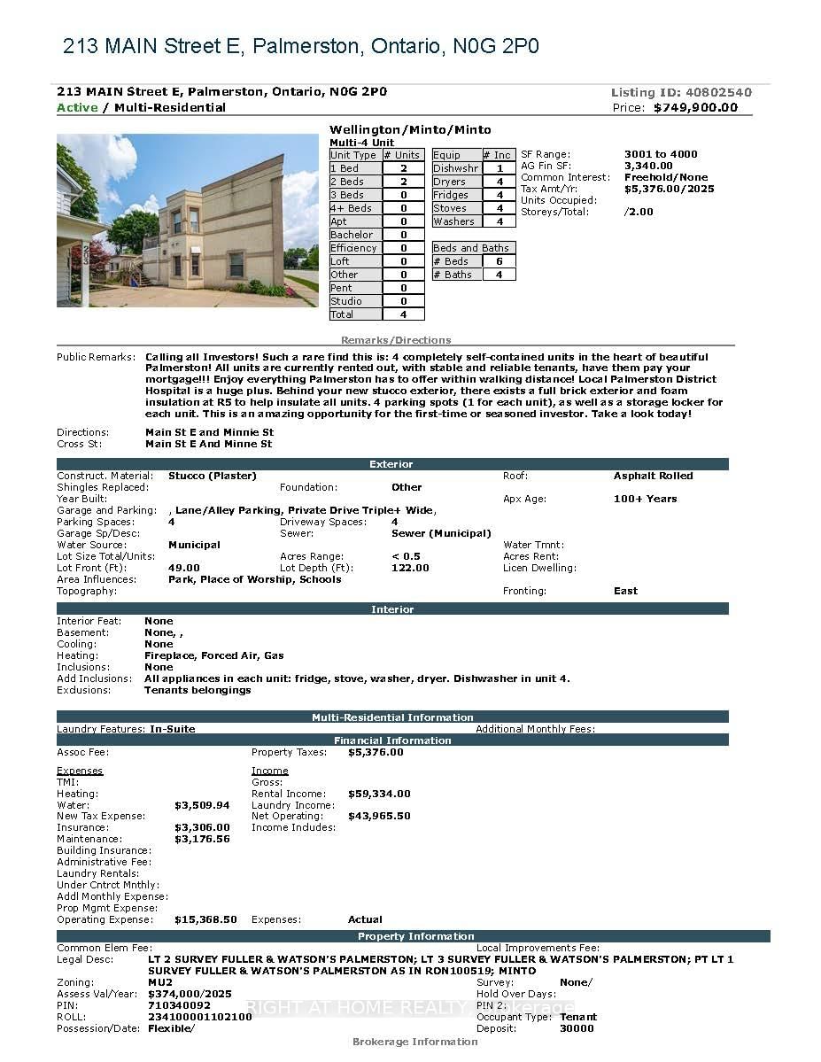 Calling all Investors! Such a rare find this is: 4 completely self-contained units in the heart of beautiful Palmerston! All units are currently rented out, with stable and reliable tenants, have them pay your mortgage!!! Enjoy everything Palmerston has to offer within walking distance! Local Palmerston District Hospital is a huge plus. The 2-Storey on 213 Main Street E has 6 bedrooms, 4 bathrooms, and is located on a 122.18 x 49.07 ft loton Not Applicable acres in the community of Minto . Behind your new stucco exterior, there exists a full brick exterior and foam insulation at R5 to help insulate all units. 4 parking spots (1 for each unit), as well as a storage locker for each unit. This is an amazing opportunity for the first-time or seasoned investor. Take a look today!