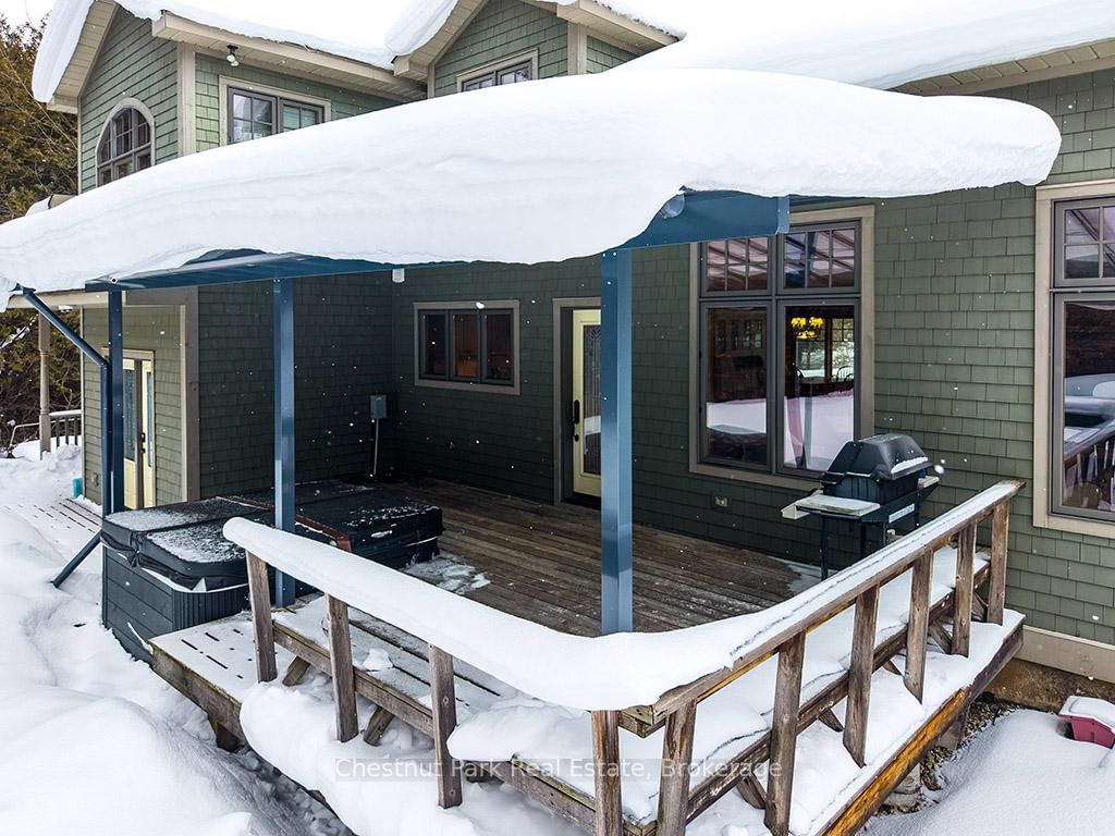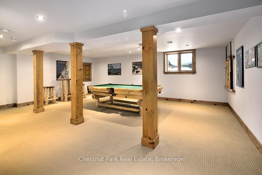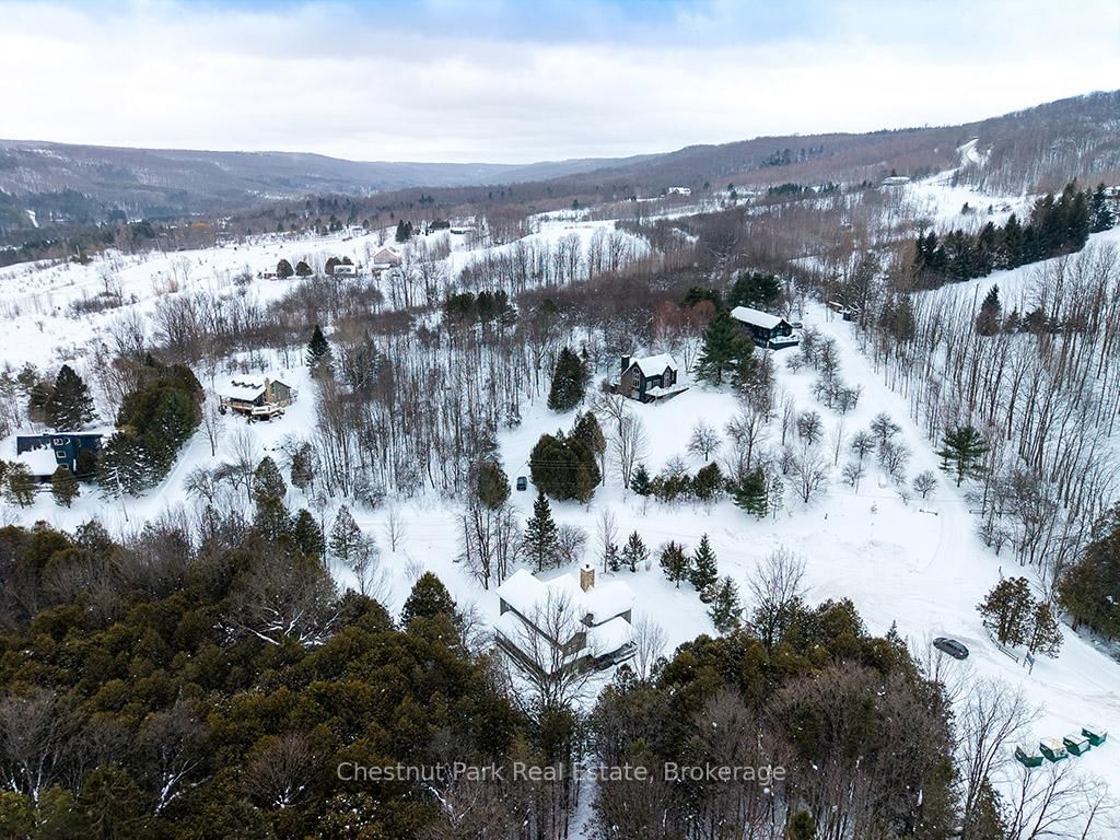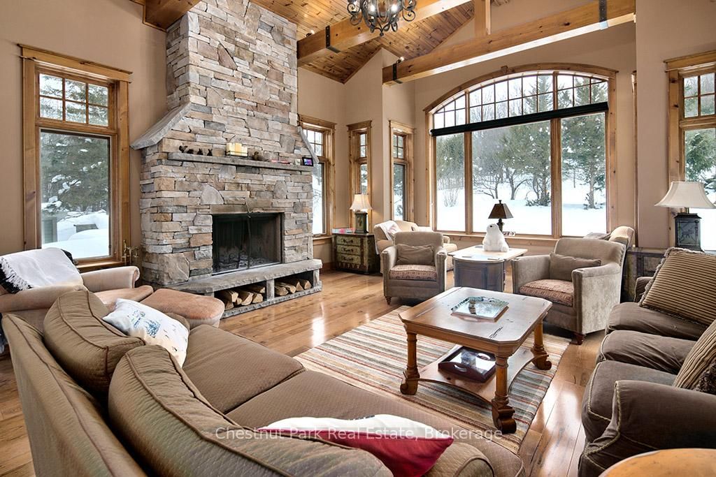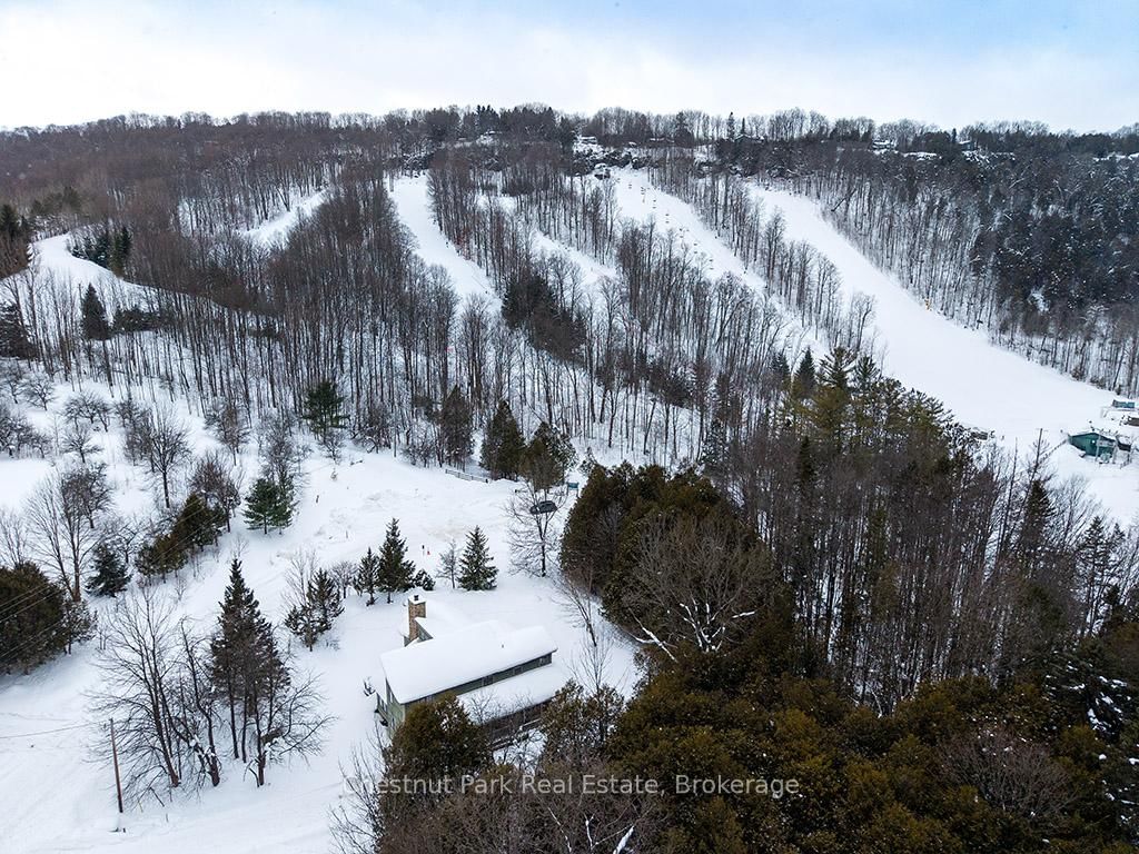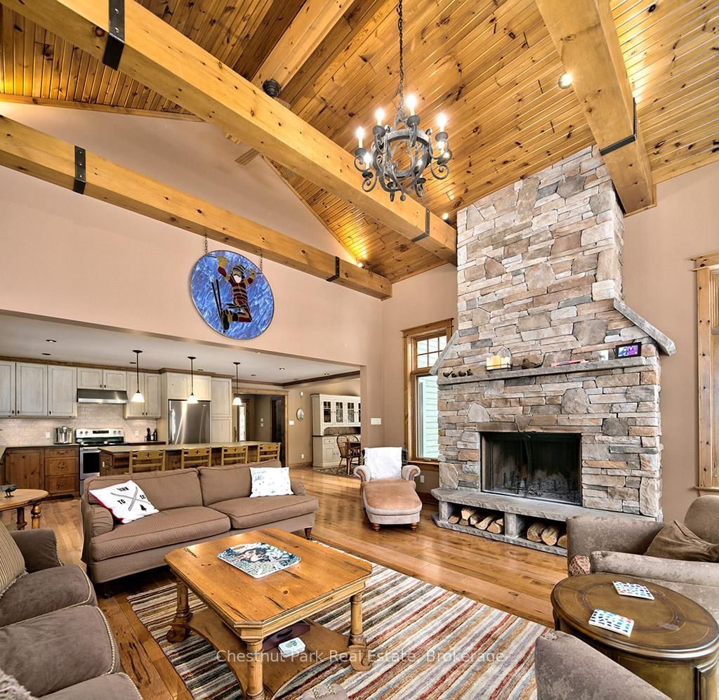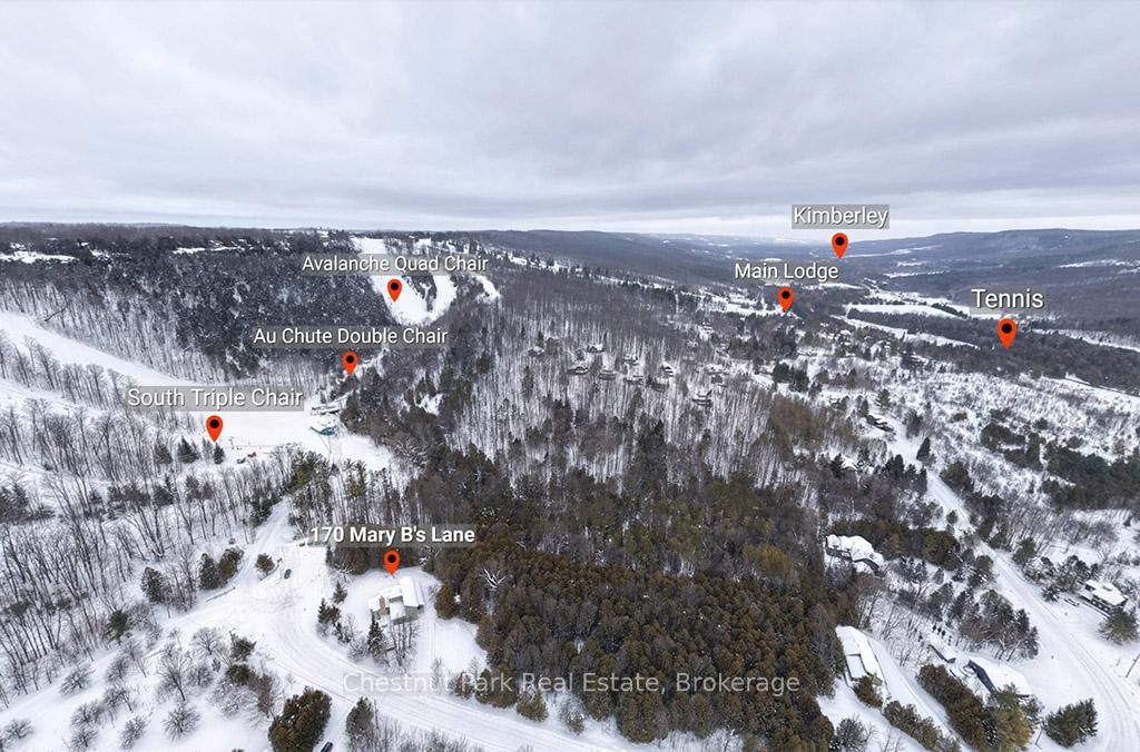 Rare opportunity to own a true ski-in, ski-out chalet at the prestigious Beaver Valley Ski Club, ideally located in Beaver South. The 2-Storey on 170 Mary B's Lane has 4 bedrooms, 3 bathrooms, and is located on a 104.84 x 509.4 ft loton .50-1.99 acres in the community of Grey Highlands . Privately set at the end of a quiet dead-end road, this custom-built chalet offers the perfect blend of luxury, warmth, and functionality. A spacious stone-floored foyer welcomes you into the stunning open-concept great room, featuring soaring vaulted tongue-and-groove pine ceilings, dramatic timber beams with metal hardware, oversized windows, and views of skiers on Southern Comfort. The floor-to-ceiling wood-burning fireplace with hand-laid stone serves as a striking centerpiece. The custom kitchen is designed for entertaining, with modern appliances, double sinks, and a large island that naturally becomes a gathering place for family and friends. A light-filled formal dining room with vaulted ceilings and solid wood floors opens to a sunny south-facing deck and a separate covered porch with hot tub provides the perfect après-ski retreat. The main floor includes a bedroom with access to a three-piece bath, ideal for guests or senior family members. Life is easy with a generous boot room with dedicated ski entry. Upstairs, the primary suite features vaulted ceilings, custom furnishings, and beautiful hardwood trim. Additional bedrooms include a spectacular bunk room with custom triple-stacked bunks, plus a spacious guest bedroom and shared three-piece bath. The lower level offers a large games and family room with a custom pool table convertible to ping pong, an additional flex room, and a third bathroom. Solidly built and thoughtfully detailed throughout, it comfortably sleeps 12 and comes furnished. A rare offering in one of Grey Highlands' most exclusive private ski communities.
