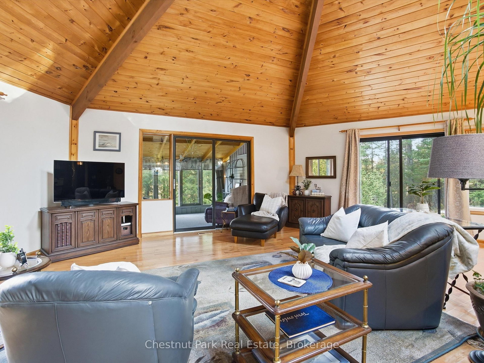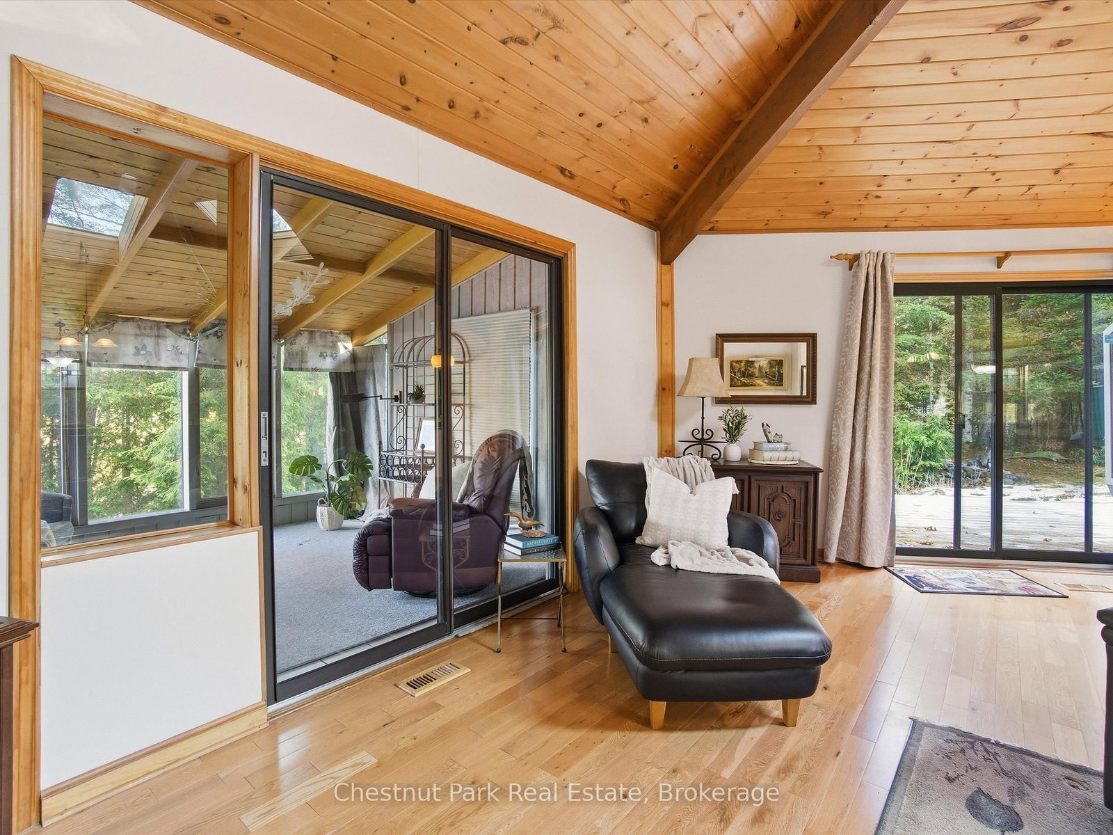 Welcome to your peaceful Muskoka retreat on the beautiful Muskoka River. The Bungalow-Raised on 1077 Fairy Falls Road has 2 bedrooms, 2 bathrooms, and is located on a 296 x 200 ft lot in the community of Mclean . This year-round home sits on a wooded lot filled with White Pine, Oak, and Maple, offering excellent privacy and a serene natural setting. With approximately 200 feet of river frontage and a creek bordering the east side of the property, there are endless vantage points around the property to take in the incredible views. Enjoy relaxing days in the screened-in gazebo near the water or explore the many natural sitting areas along the shoreline.Inside, the open-concept layout is highlighted by an impressive octagon-shaped ceiling with skylights, filling the main living area with natural light. Hardwood floors run throughout the main level, adding warmth and character. Off the family room, a bright sunroom with river views and a propane stove offers a cozy year-round living space. The primary bedroom features its own sunroom with peaceful garden views, creating a quiet and private retreat.The lower level is fully developed and includes a second propane stove, a spacious workshop, and plenty of storage. Outside, you'll find a 12' x 12' bunkie for guests, tandem garages ideal for trailered boat storage, and a compacted crushed gravel parking area with space for up to six vehicles. A Generac backup generator provides added peace of mind, and year-round access is convenient with a paved municipal road leading right to the property.Whether you're seeking a full-time residence or a four-season getaway, this property blends comfort, thoughtful design, and the natural beauty of Muskoka living.
