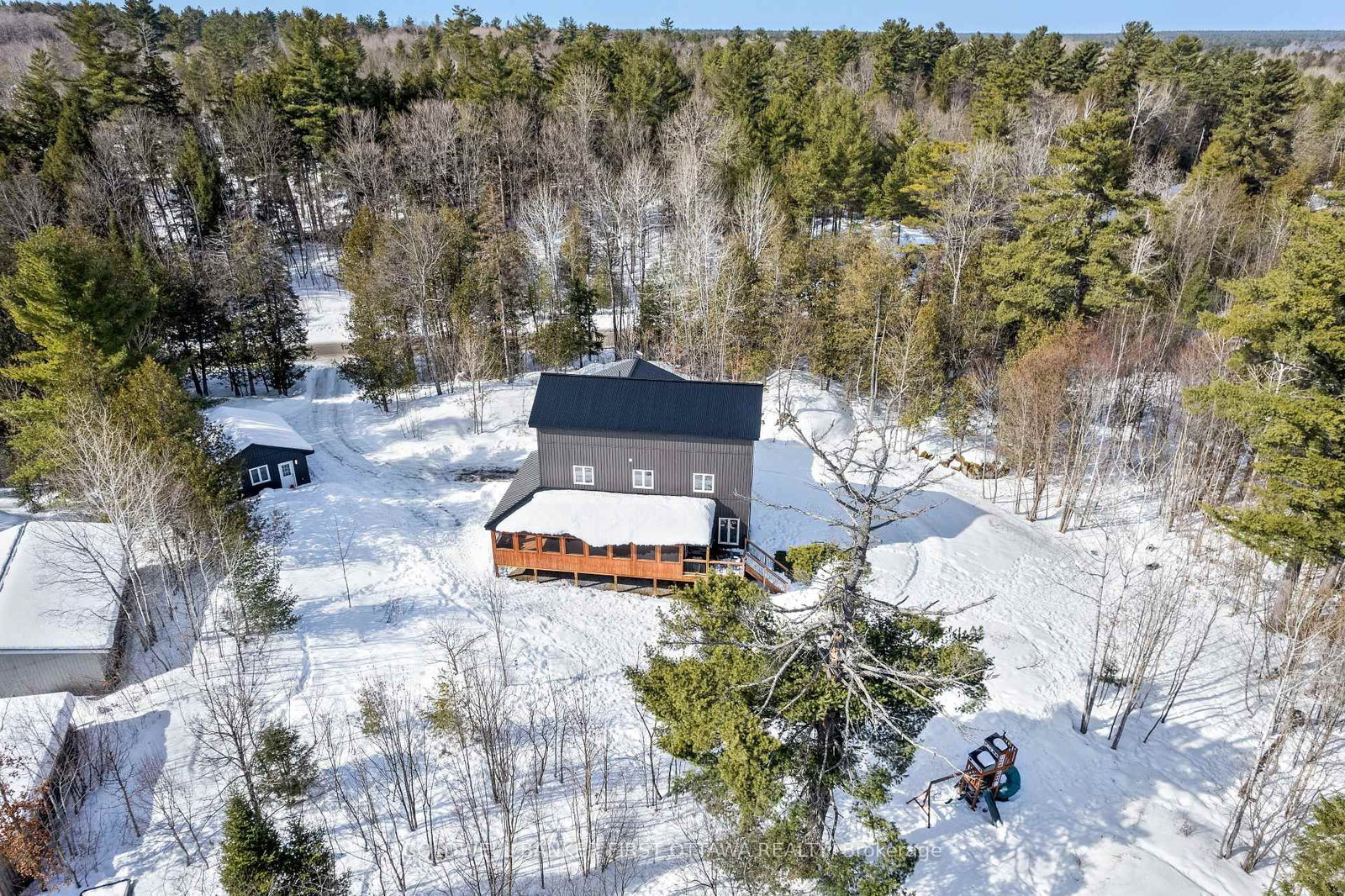 With three storeys of living space, every family member has their own private space plus comfortable rooms for gathering together. The 3-Storey on 628 Sugar Bush Road has 5 bedrooms, 4 bathrooms, and is located on a 539.14 x 420 ft loton 2-4.99 acres in the community of Mississippi Mills - Pakenham . Outside, 4.9 acres to enjoy - especially when exploring trails meandering thru the property. Built in 2021, the home blends into its natural surroundings with attractive board & batten styled siding, made of durable vinyl. Welcoming covered front porch extends into expansive screened sunroom, for games or relaxing. The 5 bedroom, 3.5 bathroom home has modern hardwood floors flowing thru living areas and bedrooms; ceramic tile in bathrooms. Open living, dining and kitchen with ceiling pot lights adding extra sparkle to the sunny spaces. Kitchen full of tasteful contemporary finishes with quartz counters, under counter lighting, honeycomb ceramic backsplash, five-burner stove and big island-breakfast bar. Kitchen breakfast nook is wrapped in windows overlooking tranquil outdoors. Second floor primary suite has vaulted ceiling creating great sense of space. The primary also includes walk-in closet and 5-pc ensuite with extra-deep soaker tub plus glass shower with rain head. Second floor has two more generous bedrooms and 4-pc bathroom with soaker tub plus rain head shower. Having a laundry room on the second floor is the best convenience ever. On third floor is home's 4th and 5th bedrooms plus 4-pc bathroom also with deep soaker tub and separate rain head shower. Lower level family room suits your entertainment centre. Attached double garage inside entry and rough-in for propane heater. Detached garage/workshop has 100 amps. Metal roofs on home and the two garages. Reliable internet and cell service, up to speed for those who work from home. Located on township maintained road with mail delivery, garbage/recycling pickup & school bus route. 10 mins to Pakenham where there is well-known golf course, family ski hill and century stone store full of freshly-baked delectables. Or, 10 mins to Almonte for shopping & fine dining. 35 mins to Kanata.