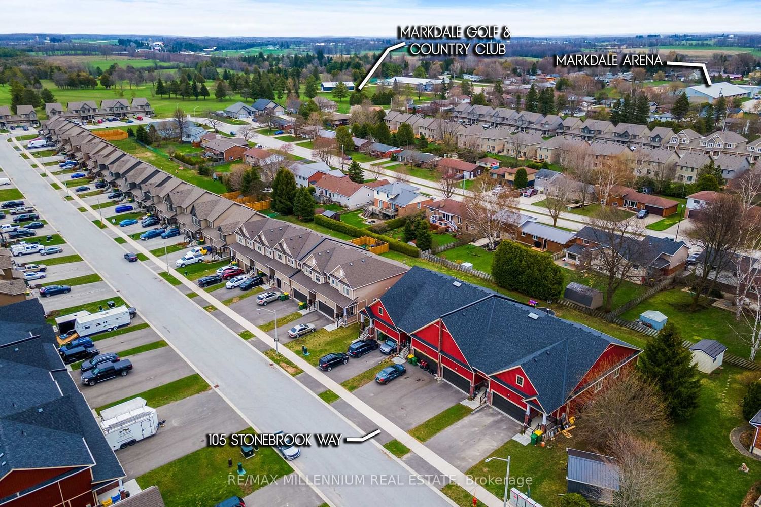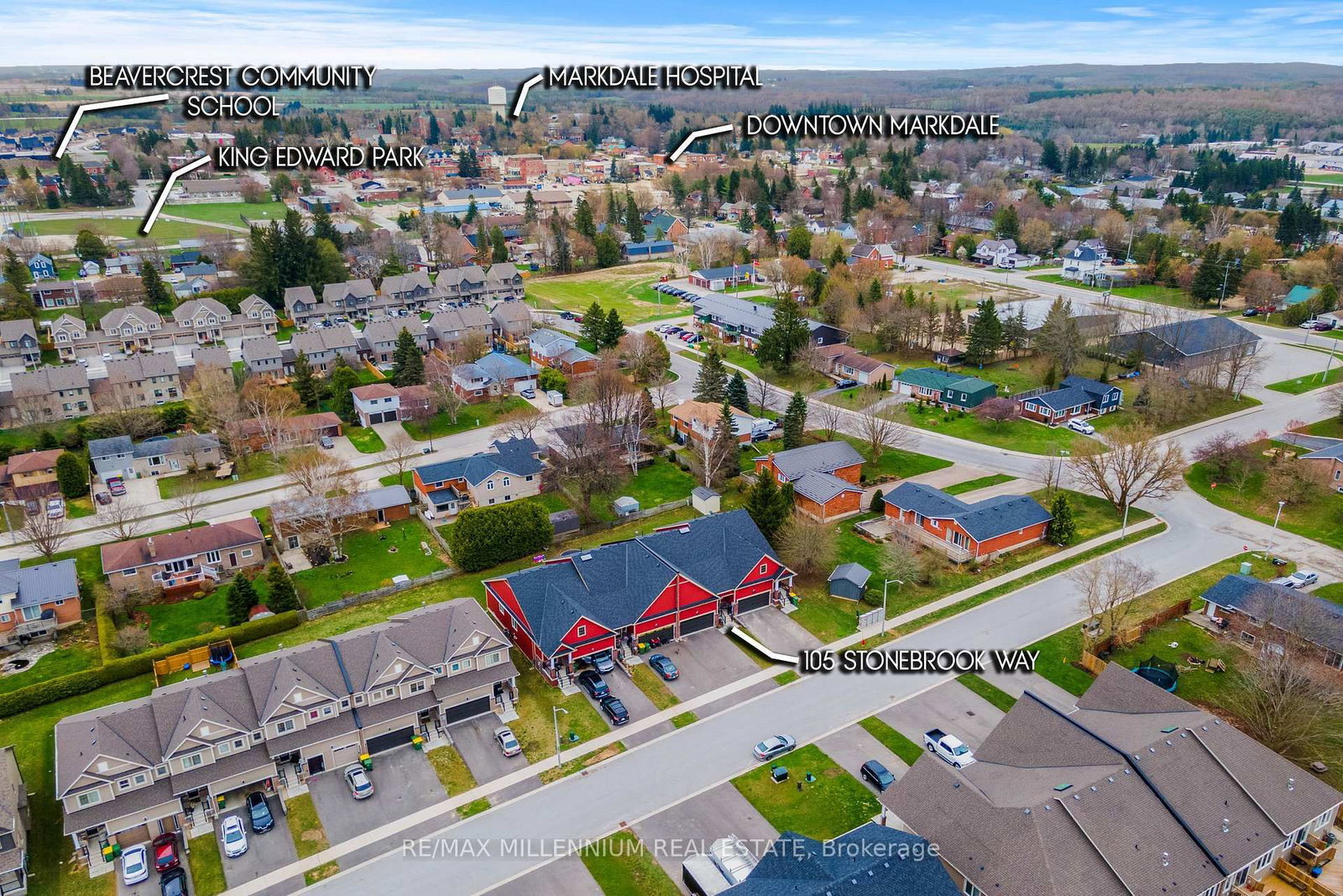 Welcome to your dream home in the heart of Markdale! This beautifully designed bungalow townhome offers a spacious, thoughtfully planned layout with premium upgrades, perfect for modern living. The Bungalow on 105 Stonebrook Way has 2 bedrooms, 2 bathrooms, and is located on a 129.99 x 27.23 ft lot in the community of Grey Highlands . Step inside to an open-concept living area filled with natural light, soaring9-foot ceilings, featuring engineered hardwood floors, quartz countertops, and stainless steel appliances. The chefs kitchen showcases a stylish island, ideal for meal prep or casual dining, while the spacious family room provides a warm and inviting space for relaxation and entertainment, complete with an upgraded fireplace for cozy evenings. Two generously sized bedrooms include a primary retreat with a walk-in closet and a private ensuite for ultimate comfort, while the additional bedroom features skylight windows and a 4-piecebath, ensuring ample space for family or guests. A fresh air system runs throughout the home, enhancing comfort year-round, and main-level laundry adds everyday convenience. The unfinished lower level, complete with a 3-piece rough-in, offers endless potential for a future home office, recreation area, gym, in-law suite, or even an income-generating unit. Parking is no issue with a 6-car driveway and an oversized 2-cargarage featuring a garage door opener, backyard access, and direct interior entry. This freehold end-unit property comes with no monthly fees or POTL fees, giving you the freedom to truly make it your own. Ideally located in the heart of Grey County, you'll enjoy easy access to hiking, skiing, golf courses, the Curling Club, Beaver Valley Ski Club, and the stunning Georgian Bay, all while being just minutes from shopping, schools, grocery stores, banks, the new Markdale Hospital, and Chapman's Ice Cream headquarters. Offering the perfect blend of style, comfort, and convenience, this easy-living freehold townhome is an exceptional opportunity miss your chance to call this beautiful property your home!