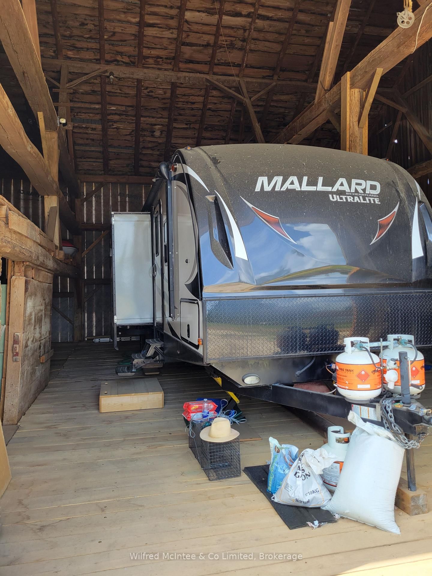 ~ RV: 35' Mallard M33, 2017. VIN/Ownership transfer upon sale (was plated and on road when parked inside barn). All electrical and sewage hook-up for RV. ~ All gates ~ gazebo