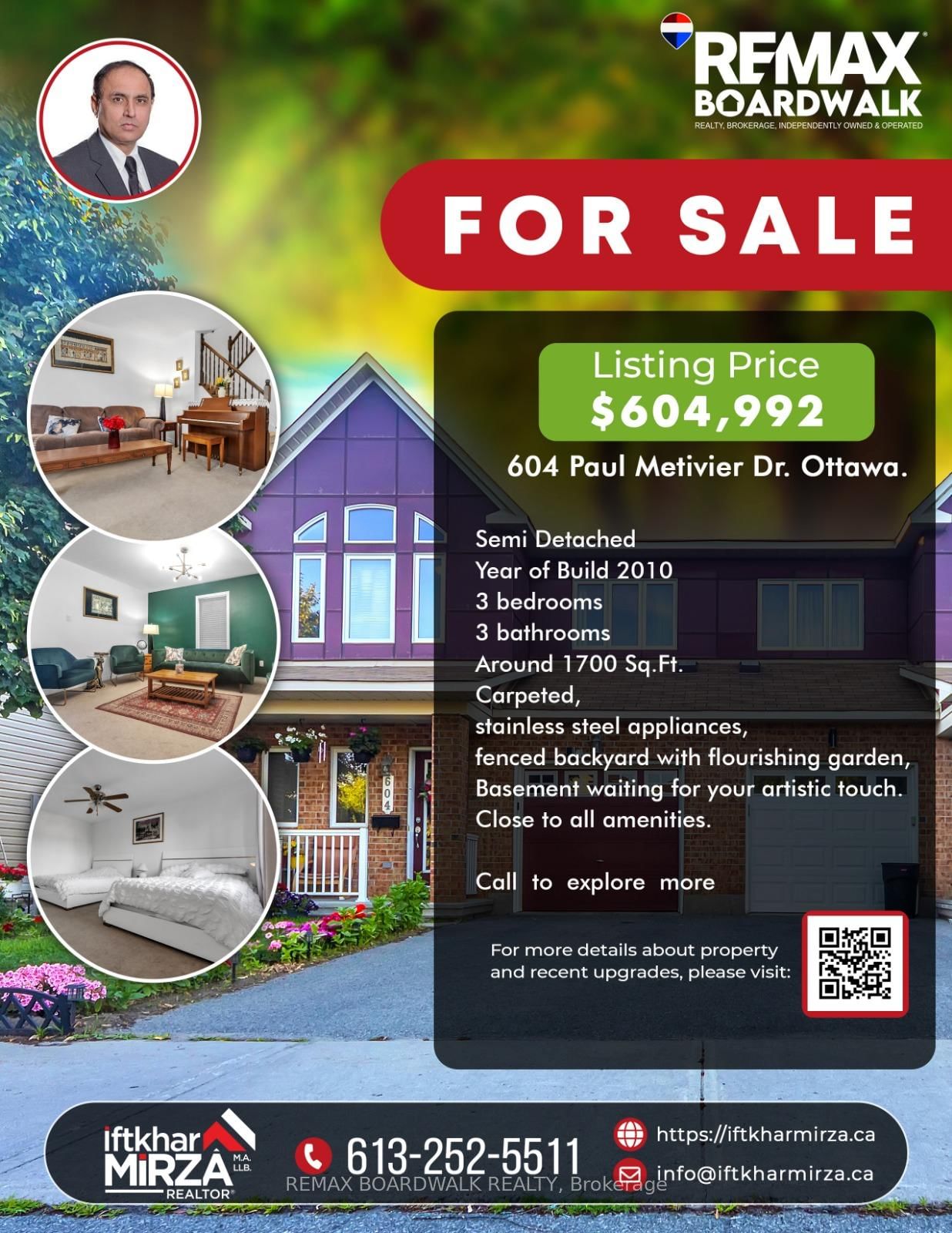 Welcome to this neat, sweet, and beautifully maintained semi-detached gem tucked into the heart of the coveted, family-focused Chapman Mills community in Barrhaven. The 2-Storey on 604 Paul Metivier Drive has 3 bedrooms, 3 bathrooms, and is located on a 87.01 x 8.94 ft lot in the community of Barrhaven - Strandherd . Bursting with natural light, this charming 3-bedroom, 3-bathroom home offers comfort, warmth, and timeless appeal. Step into a welcoming foyer that gracefully opens into accommodating living room, while the privacy filled family room with a cozy fireplace sets the perfect tone for relaxing evenings. The chef-inspired kitchen, complete with sleek stainless steel appliances and a sunlit eat-in area, is made for joyful cooking and gathering. The elegant primary bedroom is a true retreat, featuring a serene sitting area, a generous walk-in closet, and an ensuite. Two additional bedrooms and a full bathroom complete the inviting second level. Soft wall to wall carpeting, ceramic tiles, and a clean, spacious basement await your creative vision. Enjoy the fully fenced backyard adorned with flourishing gardens, and a flower filled front yard that welcomes you with a burst of color. Ideally located just steps to schools, parks, and playgrounds, and minutes from Marketplace, shopping, dining, entertainment, and transit. A True Delight to Own, Don't Miss Out on this rare offering. Book Your Private Showing Today! Public Open House, March 29, 2026 from 2-4 pm.