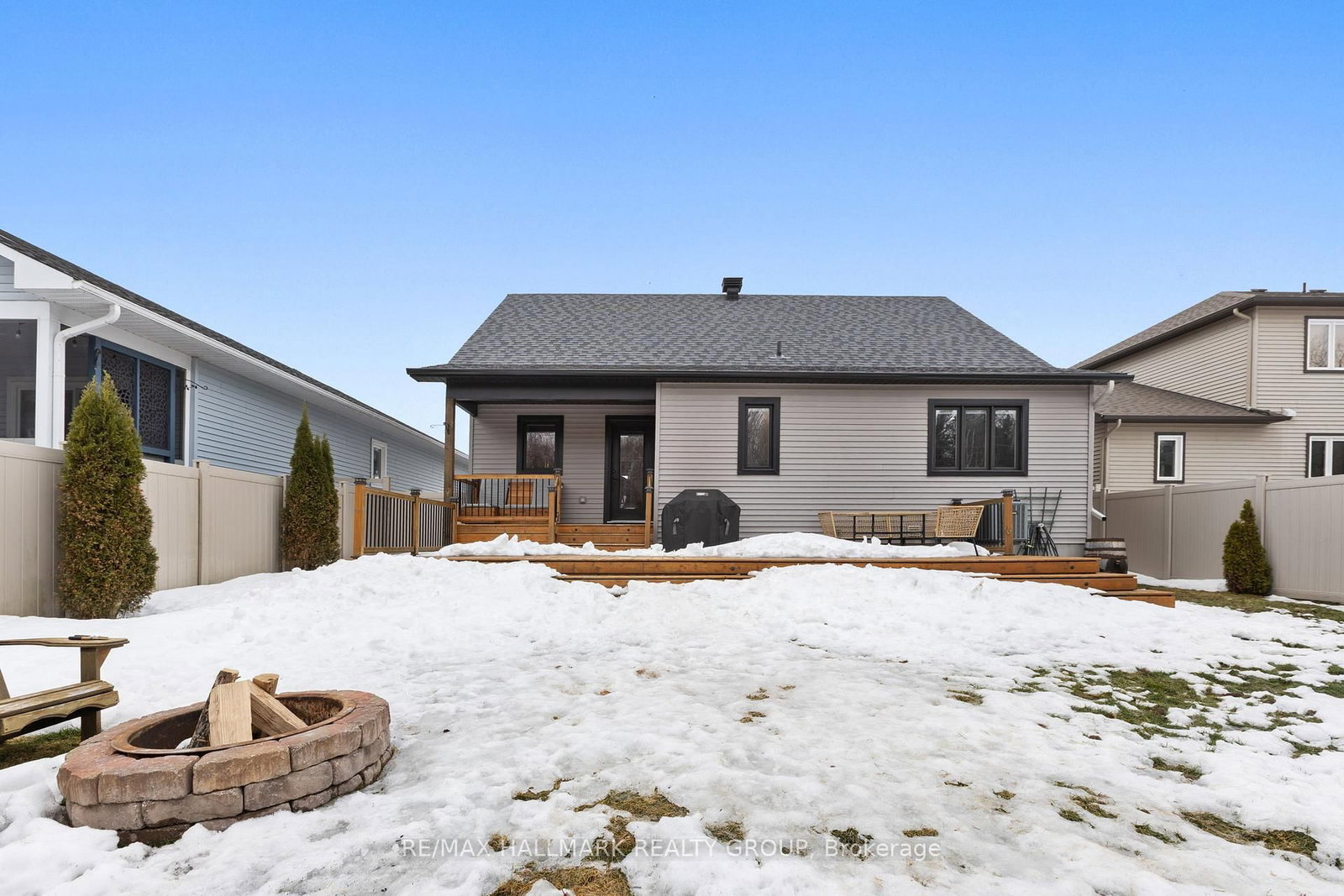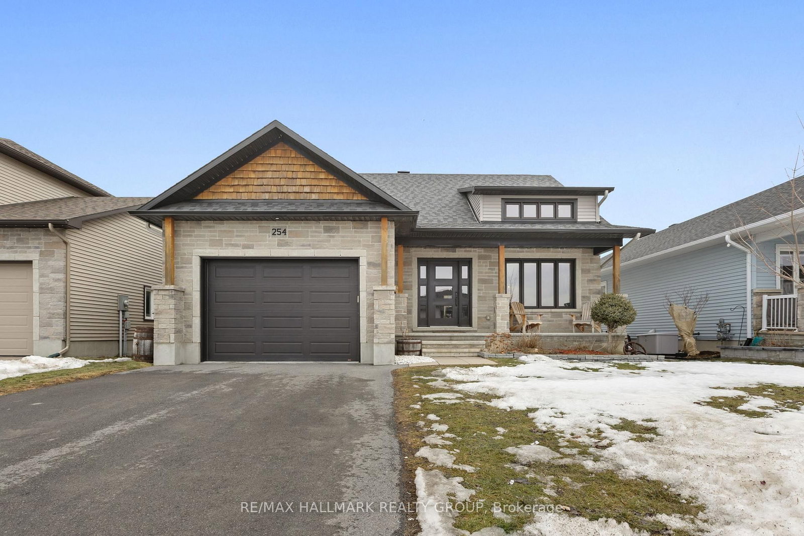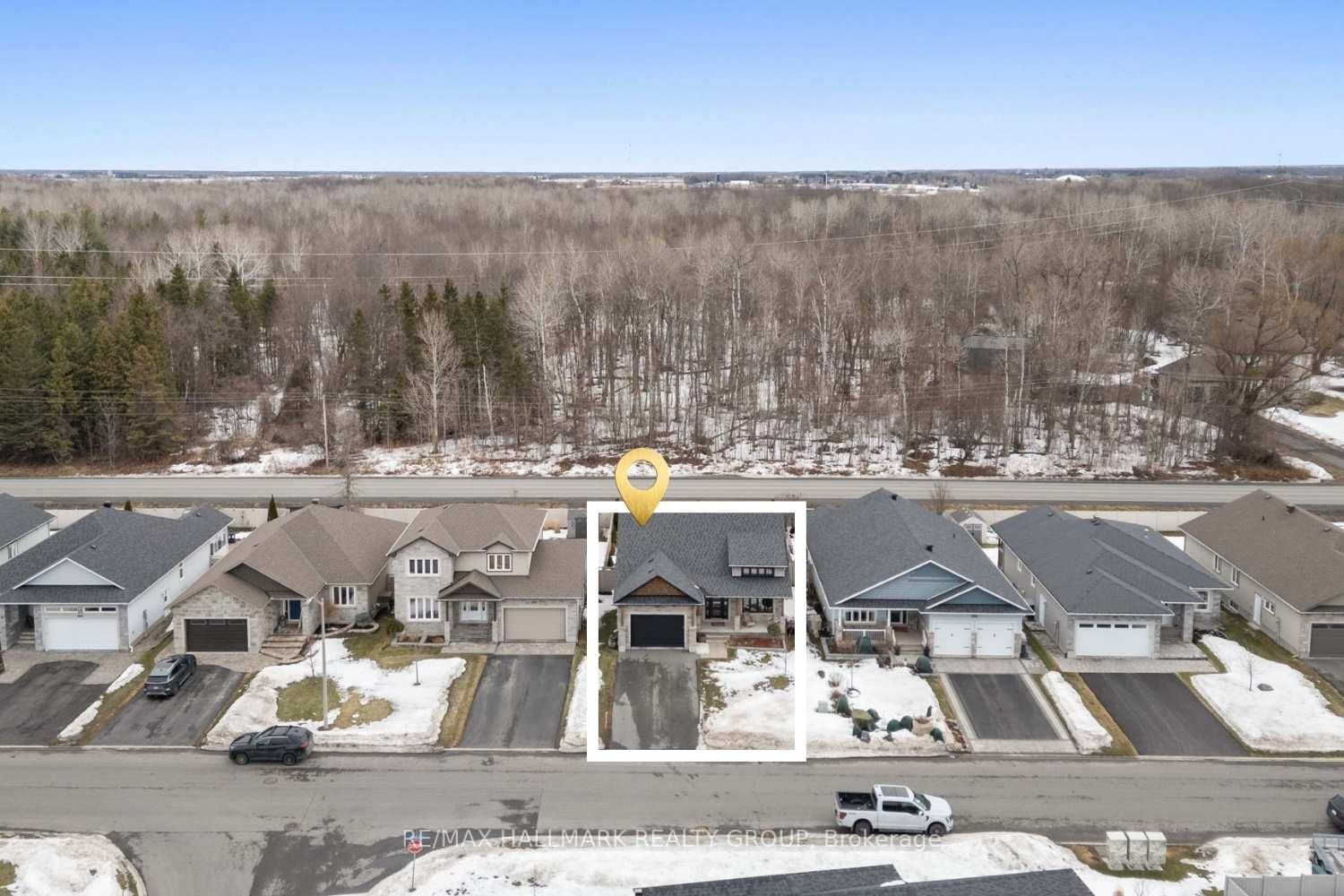 *Open House Sunday, March 29 , 2:00-4:00 PM* Welcome to 254 Pioneer Road in Russell, a beautifully designed 2018-built bungalow offering 2+1 bedrooms and 3 full bathrooms. The Bungalow on 254 Pioneer Road has 2 bedrooms, 3 bathrooms, and is located on a 114.71 x 49.95 ft lot in the community of Village of Russell . From the moment you arrive, this home impresses with its stone exterior, warm wood beams, covered front porch, single attached garage, and private double driveway. Inside, a welcoming foyer with tile flooring and a front closet opens into a bright, airy main floor with high ceilings, large windows, and hardwood floors throughout. The open-concept living space feels warm, comfortable, and full of natural light. The kitchen is both stylish and functional, featuring cream cabinetry, stainless steel appliances, generous storage, and a massive antique-style wood island with seating that adds character and warmth. A wine fridge is a great bonus, and the walkout from the kitchen leads directly to the backyard deck, making outdoor dining and entertaining effortless.T he primary bedroom offers a relaxing retreat with a modern ensuite featuring a walk-in shower. A second main-floor bedroom with its own closet is ideal for family, guests, or a home office. A second full bathroom and a convenient laundry room with sink and storage complete the layout. The lower level features beautiful stone accents, a bar and kitchenette with seating area, and a cozy family room with a fireplace and matching stone wall. A third bedroom offers flexibility for guests, office space, or hobbies, along with a third full bathroom. Outside, enjoy a spacious fully fenced backyard overlooking a wooded area with no rear neighbours. The large deck offers room for seating and BBQ, while the corner gazebo with built-in wood design creates a charming outdoor dining space. A firepit area adds extra warmth and character. Located in a desirable Russell neighbourhood close to groceries, restaurants, and everyday amenities, this home offers comfort, style, privacy, and convenience in one inviting package.