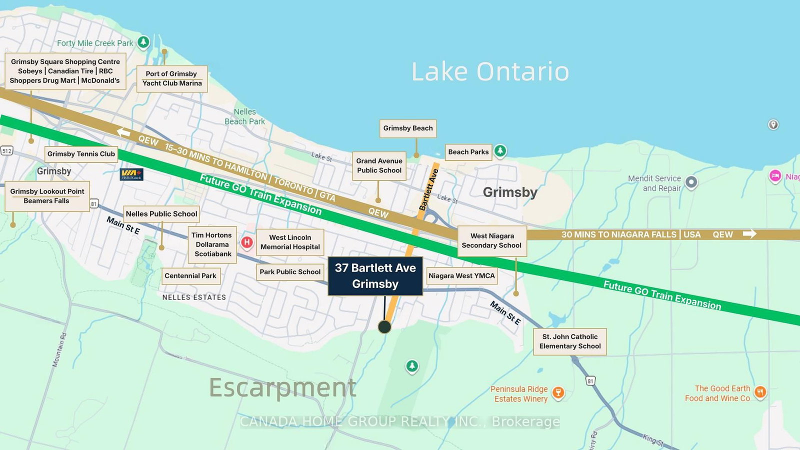An exceptional, fully approved development site in the rapidly expanding community of Grimsby. The Bungalow on 37 Bartlett Avenue has 4 bedrooms, 3 bathrooms, and is located on a 413.21 x 617.57 ft lot in the community of Grimsby East . 37 Bartlett Avenue presents a rare opportunity to acquire a shovel-ready project featuring 5 blocks 4 storeys 112 stacked urban townhomes, strategically positioned between the GTA and Niagara Region--one of Ontario's fastest-growing housing corridors. This offering delivers immediate scale, efficiency, and speed-to-market, eliminating lengthy entitlement timelines. Surrounded by established residential communities, natural amenities, and convenient highway access, the site is ideally suited to meet the strong and growing demand for attainable housing in the region. Recent announcements by Doug Ford and Mark Carney to expand 13% HST rebates to all new home buyers and further reduction on development fees are expected to significantly stimulate demand and improve absorption rates across new construction projects. This unprecedented cost reduction materially enhances affordability, accelerate sales velocity, and strengthens developer building outcomes. This site enjoys highly sought after premiums namely forever Escarpment view and everlasting forest, adjacent ravine, massive woods and greenery, and breathtaking tranquility. It Is close to all amenities Including parks, beaches, trails, public transit, shopping, restaurants, and newly built schools and hospital. This site has an easy access to Hwy QEW with quick rides to GTA and Niagara Falls. Location wise, Grimsby is just like crown jewel shining right between Lake Ontario and Niagara Escarpment which enjoys both water and mountain-like gorgeous views. With new GO Train station coming, Grimsby can only be better and brighter. A true golden location. Whether you are a developer/builder, institutional investor, purpose-home builder, or long-term care/ retirement housing operator, this site offers a compelling blend of approved density, macroeconomic support, and strategic location. Pride of ownership!