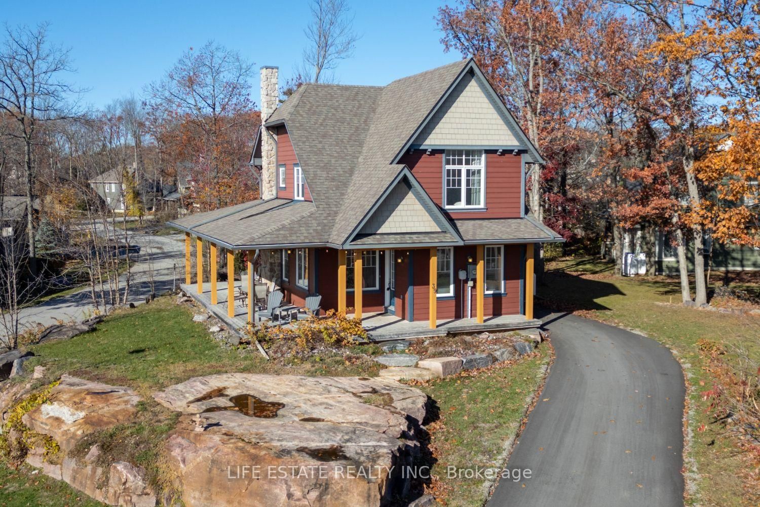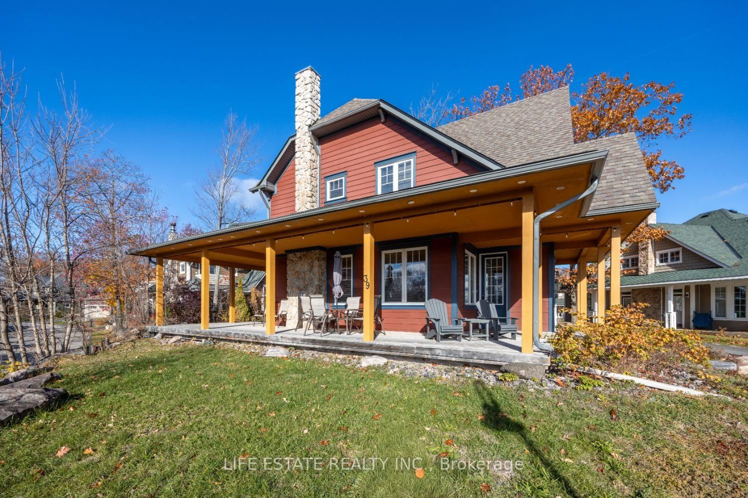 Welcome Home to 39 Country Trail, a 3-bedroom, 3-bathroom, 2-storey detached home that epitomizes lakeside community living. The 2-Storey on 20-39 Country Trail has 3 bedrooms, 3 bathrooms, and is located in the community of Baxter . Set majestically on Muskoka rock. A large custom wrap-around covered porch invites you to enjoy in the breathtaking views. The spacious open concept main floor with 9 foot ceilings and pot lights throughout; The family and dining areas boast expansive windows, offering a panoramic display of the stunning natural views. A fireplace with stone facade and wood mantle. A spacious primary bedroom is complete with a large closet and ensuite bathroom that has an extra wide shower stall. 2nd full bathroom, 2 more bedrooms and a large linen/pantry closet on 2nd level. Energy Star R22 insulation in walls R56 in attic. Only steps from the community marina with boat access out to Georgian Bay. Access to & from the extended/deep single car garage with 10' ceiling via back door off the back of the covered porch. Custom exterior, featuring Hardie Board siding with Maibec trim ensures durability and low maintenance for years to come. New luxury vinyl flooring, new eavestroughs with covers. This is a peaceful sanctuary to call home and escape the bustle of city life, where serene sunsets paint the sky in hues of orange and pink, beckoning you to embark on your own lakeside community chapter. Social fee to be phased in. Exceptional Opportunity to expand the home with a Muskoka Room off the Living Room, ask for all the details.