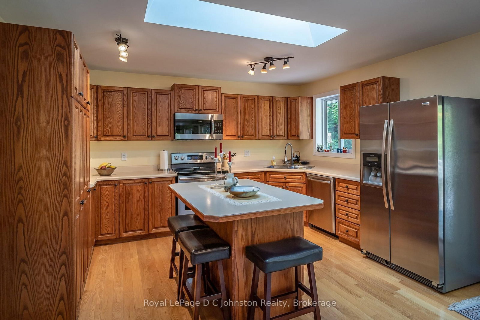 • Kitchen: hardwood floor, Skylight