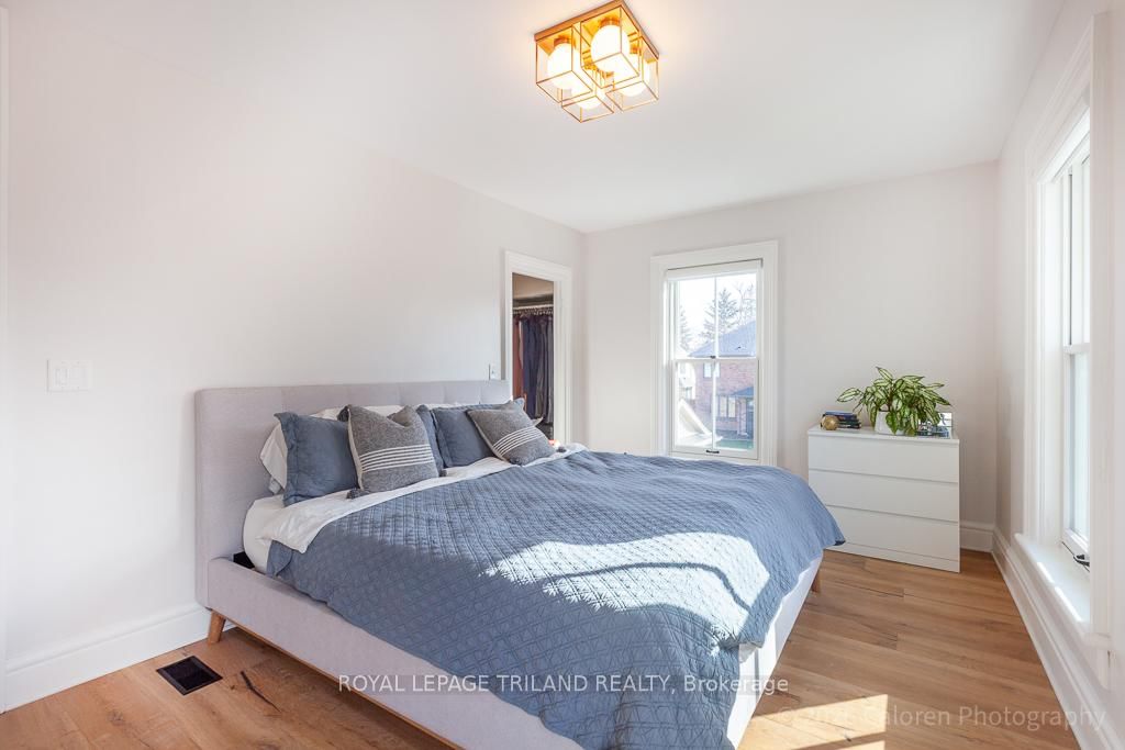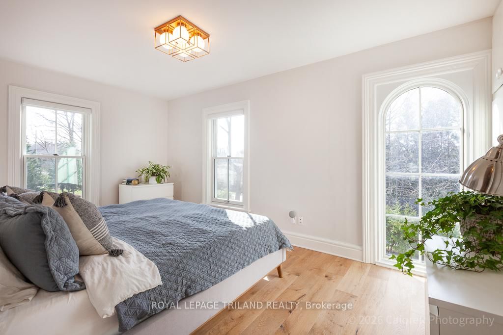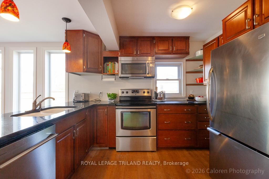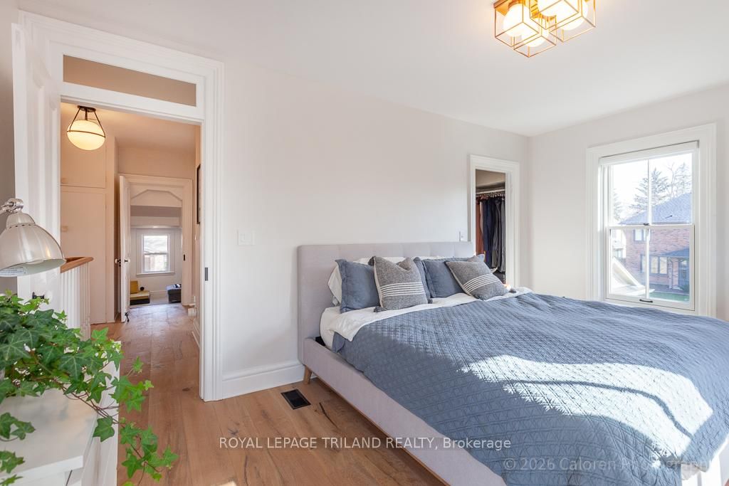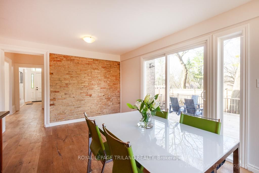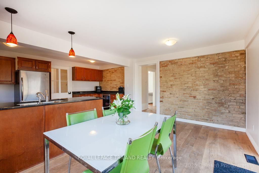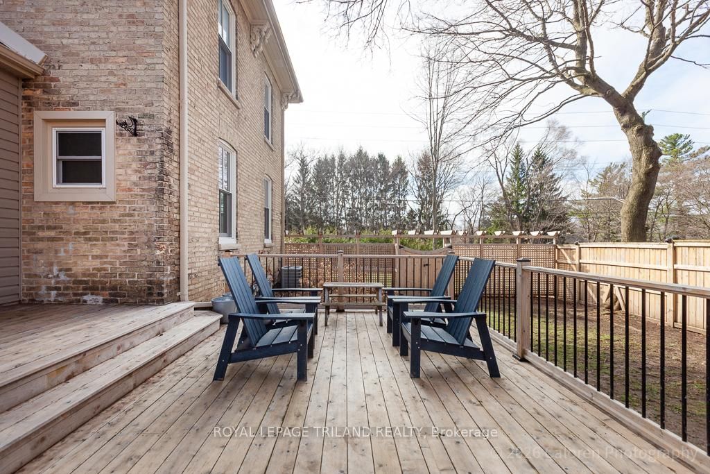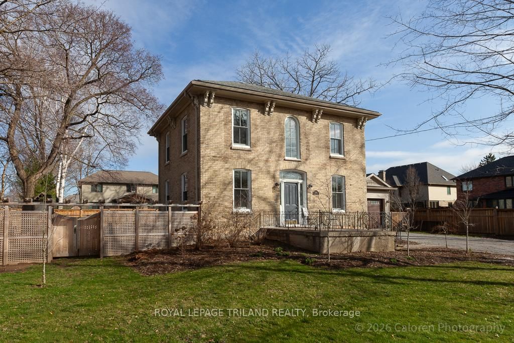 This exceptional late-1800s residence seamlessly blends historic character with thoughtful modern updates. The 2-Storey on 1135 Riverside Drive has 3 bedrooms, 2 bathrooms, and is located on a 98.14 x 100.25 ft lot in the community of North O . Impeccably maintained inside and out, the home offers timeless charm coupled with everyday functionality.Featuring three bedrooms and two full bathrooms, the inviting interior showcases exquisite details throughout. A welcoming front foyer with leaded stained glass accents opens to a beautifully restored staircase boasting a handcrafted newel post and railing. Heated floors in the mudroom add comfort and convenience, while distressed plank flooring flows throughout, creating a calm, cohesive aesthetic. The living room features a custom-built wall unit with shelving and drawers, combining style and practicality. High ceilings, wide baseboards, and neutral tones accentuate the home's light-filled spaces.The kitchen and dining area highlight beautiful exposed brick walls, granite countertops, a convenient coffee bar with bar fridge, and access to a spacious multi-level deck-perfect for entertaining or quiet evenings outdoors.Upstairs, three bright bedrooms include remote-controlled blinds and a versatile bonus room ideal for a home office, play area, or cozy snug. Custom double-hung replacement windows replicate the original design, providing energy efficiency without sacrificing charm. Distinctive light fixtures complete the interior's refined ambiance.Outdoors, the fully fenced yard features a new fence with pergola-style gate and landscaped grounds designed for relaxation and gatherings. Rare for a home of this era, the oversized double garage offers exceptional storage and parking.Ideally located near Hyde Park and the Oxford shopping district, with Remark and Starbucks moments away, the property is steps from the golf course, Thames River trails, and local sports fields-an outstanding combination of heritage, comfort, and convenience.