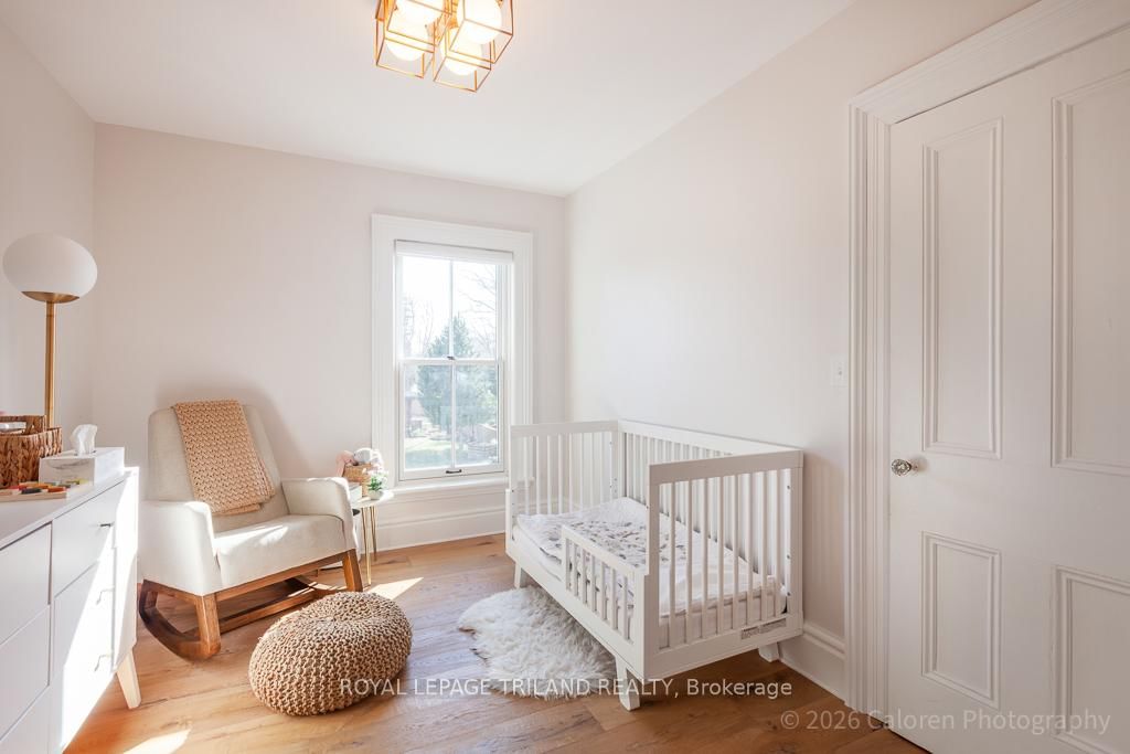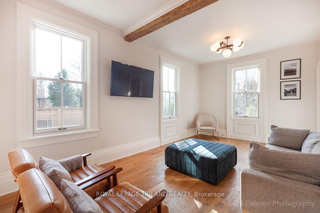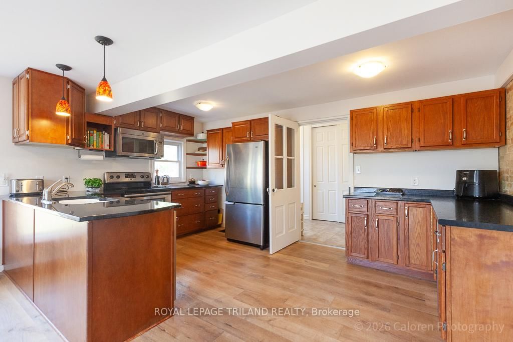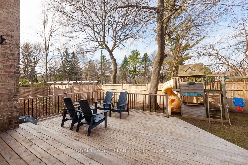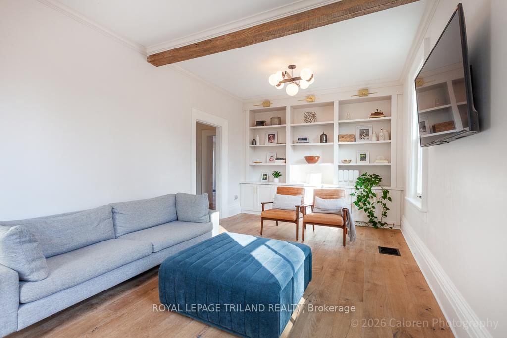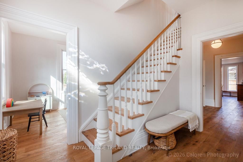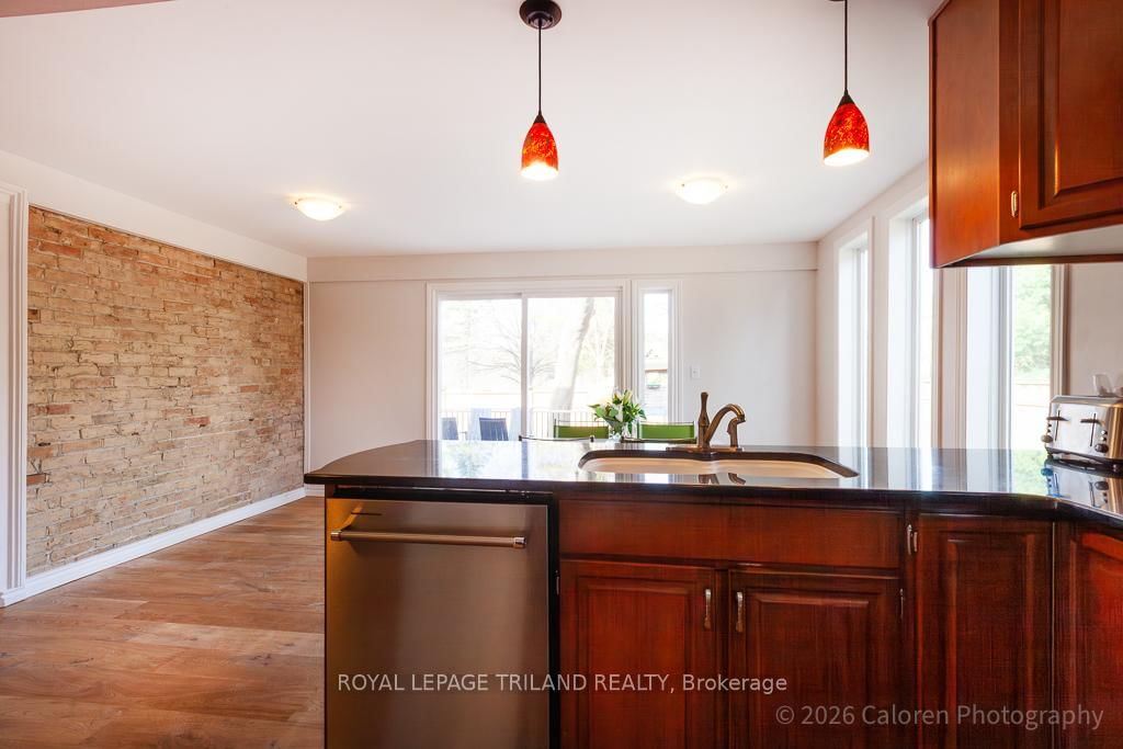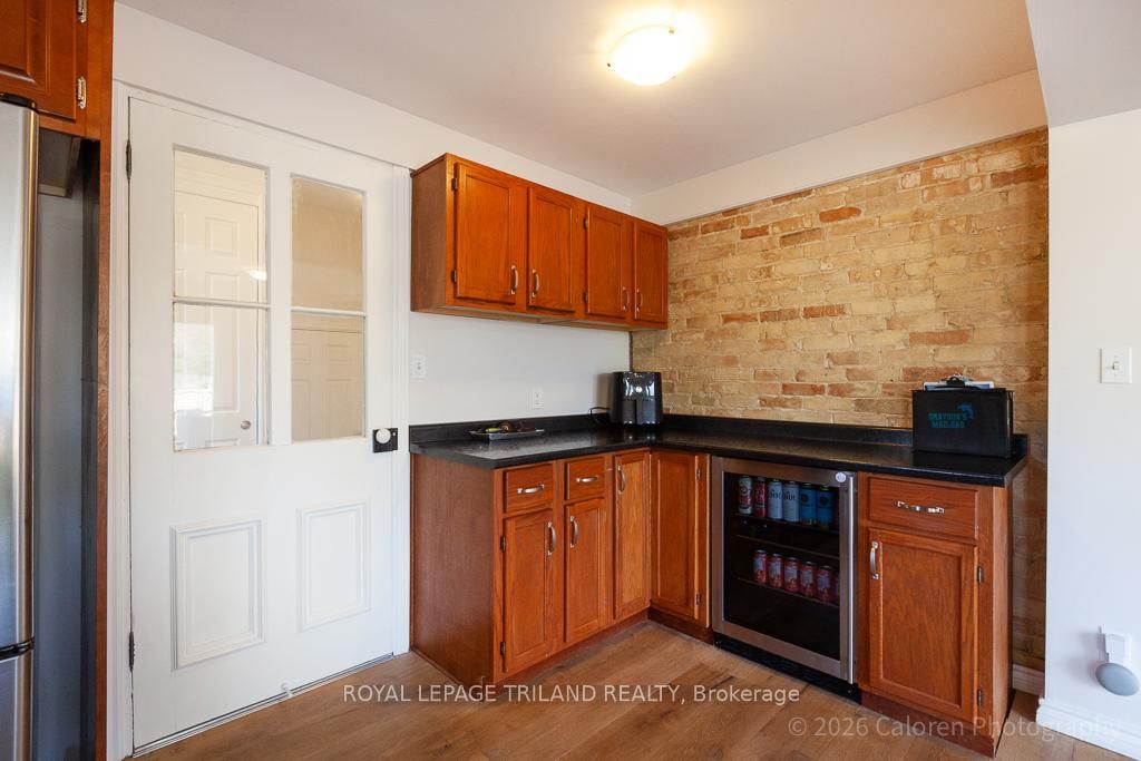 This exceptional late-1800s residence seamlessly blends historic character with thoughtful modern updates. The 2-Storey on 1135 Riverside Drive has 3 bedrooms, 2 bathrooms, and is located on a 98.14 x 100.25 ft lot in the community of North O . Impeccably maintained inside and out, the home offers timeless charm coupled with everyday functionality.Featuring three bedrooms and two full bathrooms, the inviting interior showcases exquisite details throughout. A welcoming front foyer with leaded stained glass accents opens to a beautifully restored staircase boasting a handcrafted newel post and railing. Heated floors in the mudroom add comfort and convenience, while distressed plank flooring flows throughout, creating a calm, cohesive aesthetic. The living room features a custom-built wall unit with shelving and drawers, combining style and practicality. High ceilings, wide baseboards, and neutral tones accentuate the home's light-filled spaces.The kitchen and dining area highlight beautiful exposed brick walls, granite countertops, a convenient coffee bar with bar fridge, and access to a spacious multi-level deck-perfect for entertaining or quiet evenings outdoors.Upstairs, three bright bedrooms include remote-controlled blinds and a versatile bonus room ideal for a home office, play area, or cozy snug. Custom double-hung replacement windows replicate the original design, providing energy efficiency without sacrificing charm. Distinctive light fixtures complete the interior's refined ambiance.Outdoors, the fully fenced yard features a new fence with pergola-style gate and landscaped grounds designed for relaxation and gatherings. Rare for a home of this era, the oversized double garage offers exceptional storage and parking.Ideally located near Hyde Park and the Oxford shopping district, with Remark and Starbucks moments away, the property is steps from the golf course, Thames River trails, and local sports fields-an outstanding combination of heritage, comfort, and convenience.