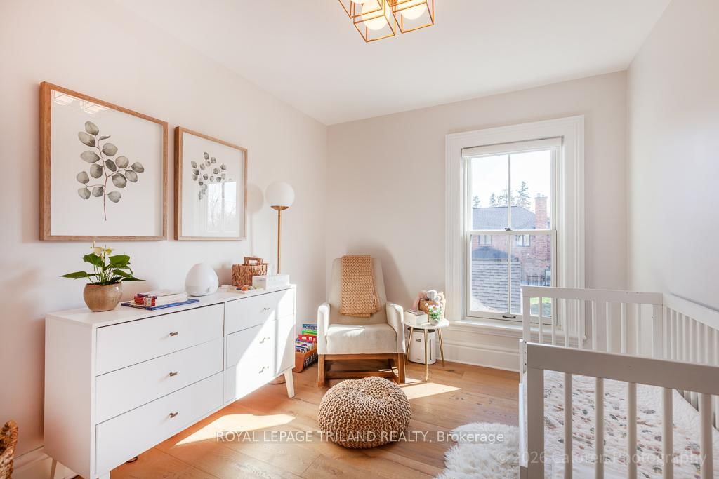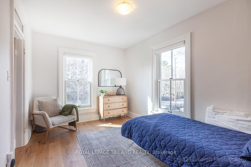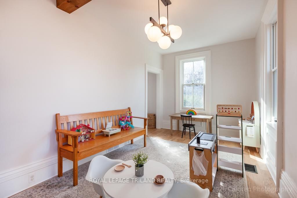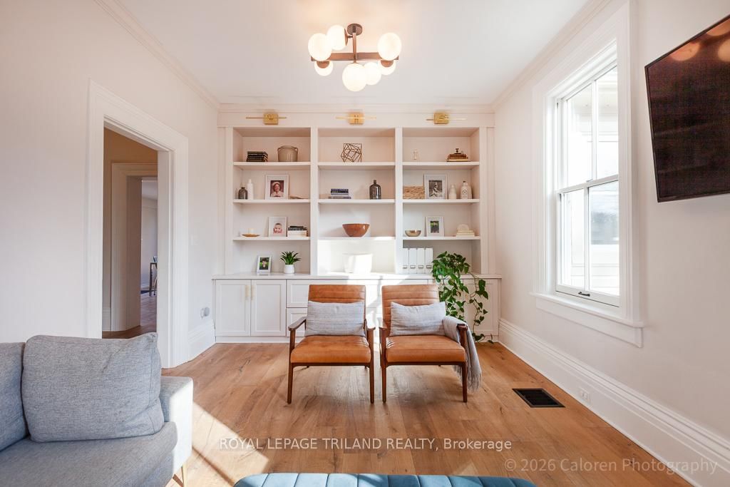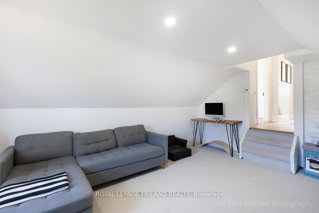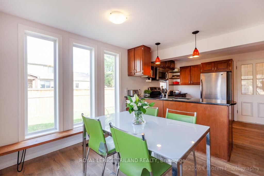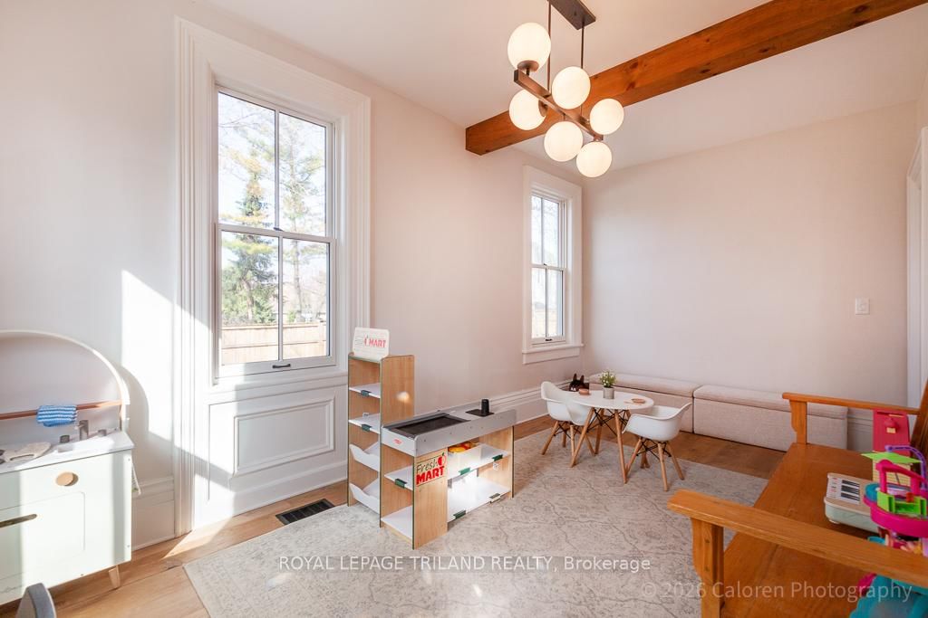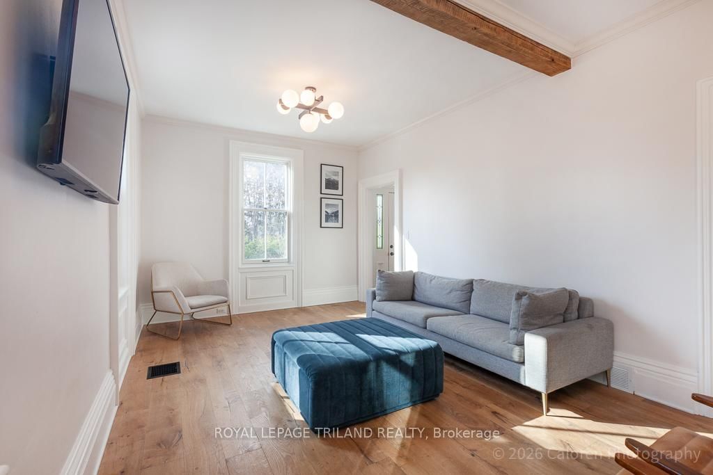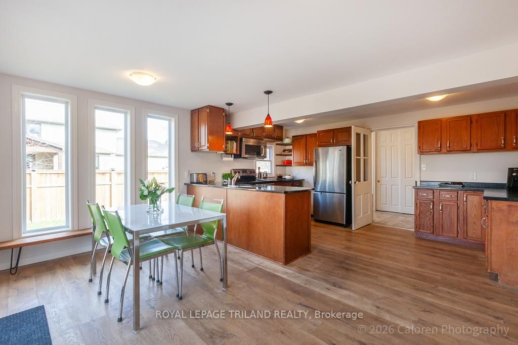 This exceptional late-1800s residence seamlessly blends historic character with thoughtful modern updates. The 2-Storey on 1135 Riverside Drive has 3 bedrooms, 2 bathrooms, and is located on a 98.14 x 100.25 ft lot in the community of North O . Impeccably maintained inside and out, the home offers timeless charm coupled with everyday functionality.Featuring three bedrooms and two full bathrooms, the inviting interior showcases exquisite details throughout. A welcoming front foyer with leaded stained glass accents opens to a beautifully restored staircase boasting a handcrafted newel post and railing. Heated floors in the mudroom add comfort and convenience, while distressed plank flooring flows throughout, creating a calm, cohesive aesthetic. The living room features a custom-built wall unit with shelving and drawers, combining style and practicality. High ceilings, wide baseboards, and neutral tones accentuate the home's light-filled spaces.The kitchen and dining area highlight beautiful exposed brick walls, granite countertops, a convenient coffee bar with bar fridge, and access to a spacious multi-level deck-perfect for entertaining or quiet evenings outdoors.Upstairs, three bright bedrooms include remote-controlled blinds and a versatile bonus room ideal for a home office, play area, or cozy snug. Custom double-hung replacement windows replicate the original design, providing energy efficiency without sacrificing charm. Distinctive light fixtures complete the interior's refined ambiance.Outdoors, the fully fenced yard features a new fence with pergola-style gate and landscaped grounds designed for relaxation and gatherings. Rare for a home of this era, the oversized double garage offers exceptional storage and parking.Ideally located near Hyde Park and the Oxford shopping district, with Remark and Starbucks moments away, the property is steps from the golf course, Thames River trails, and local sports fields-an outstanding combination of heritage, comfort, and convenience.