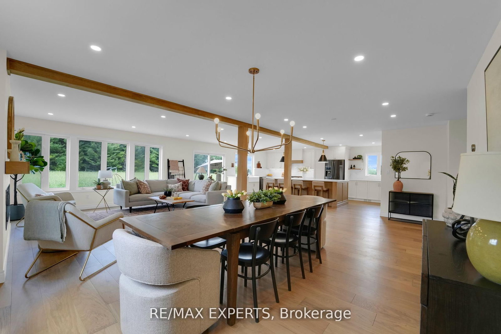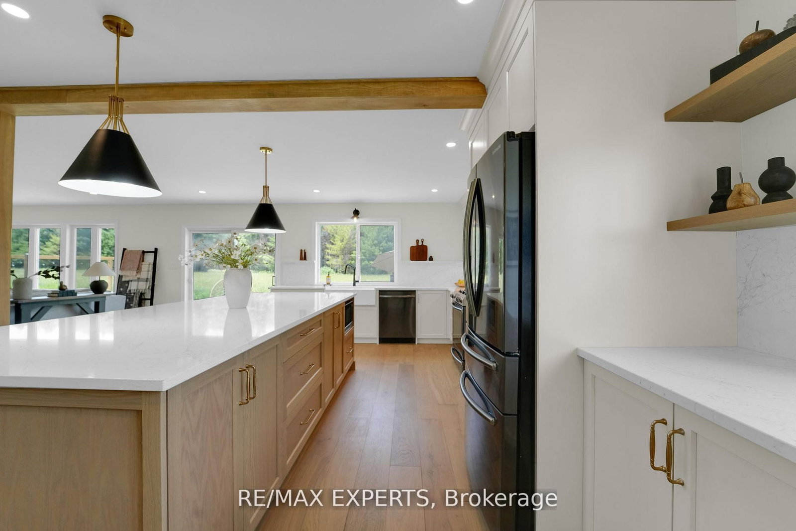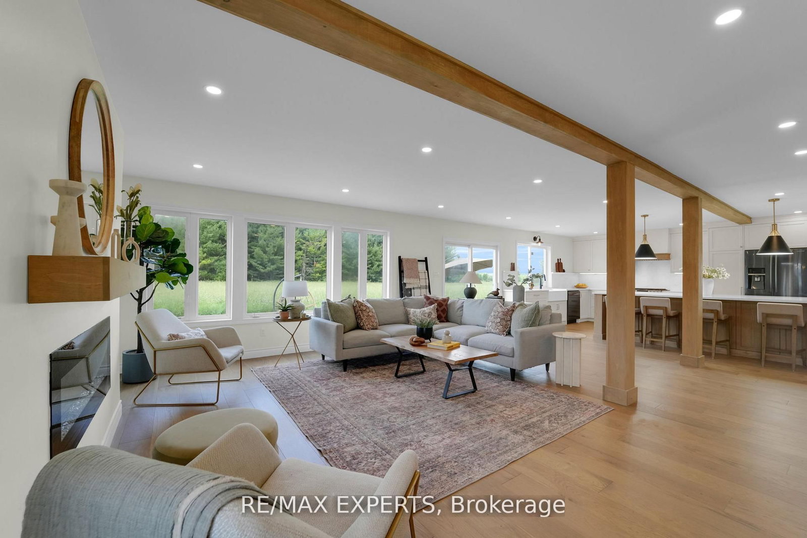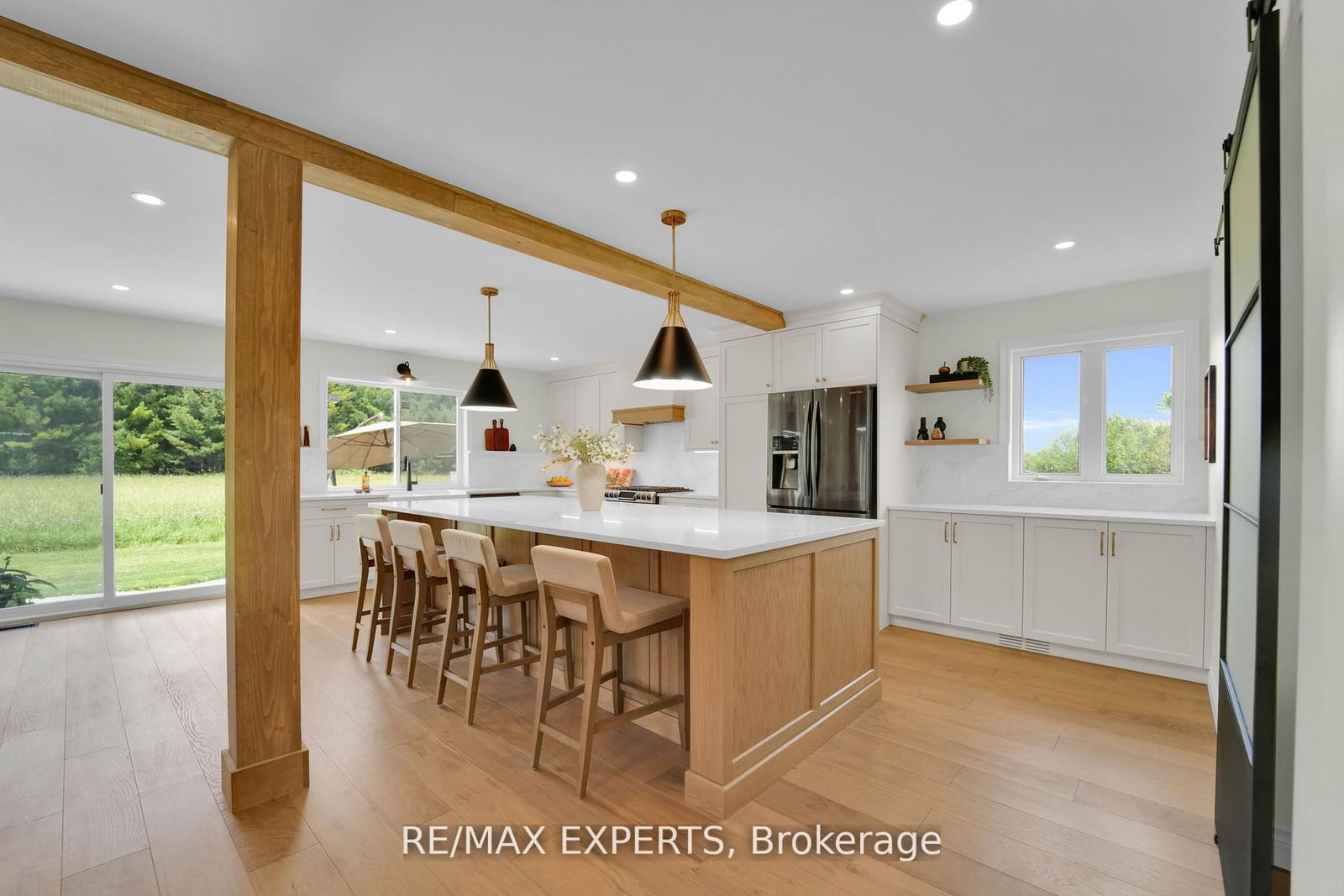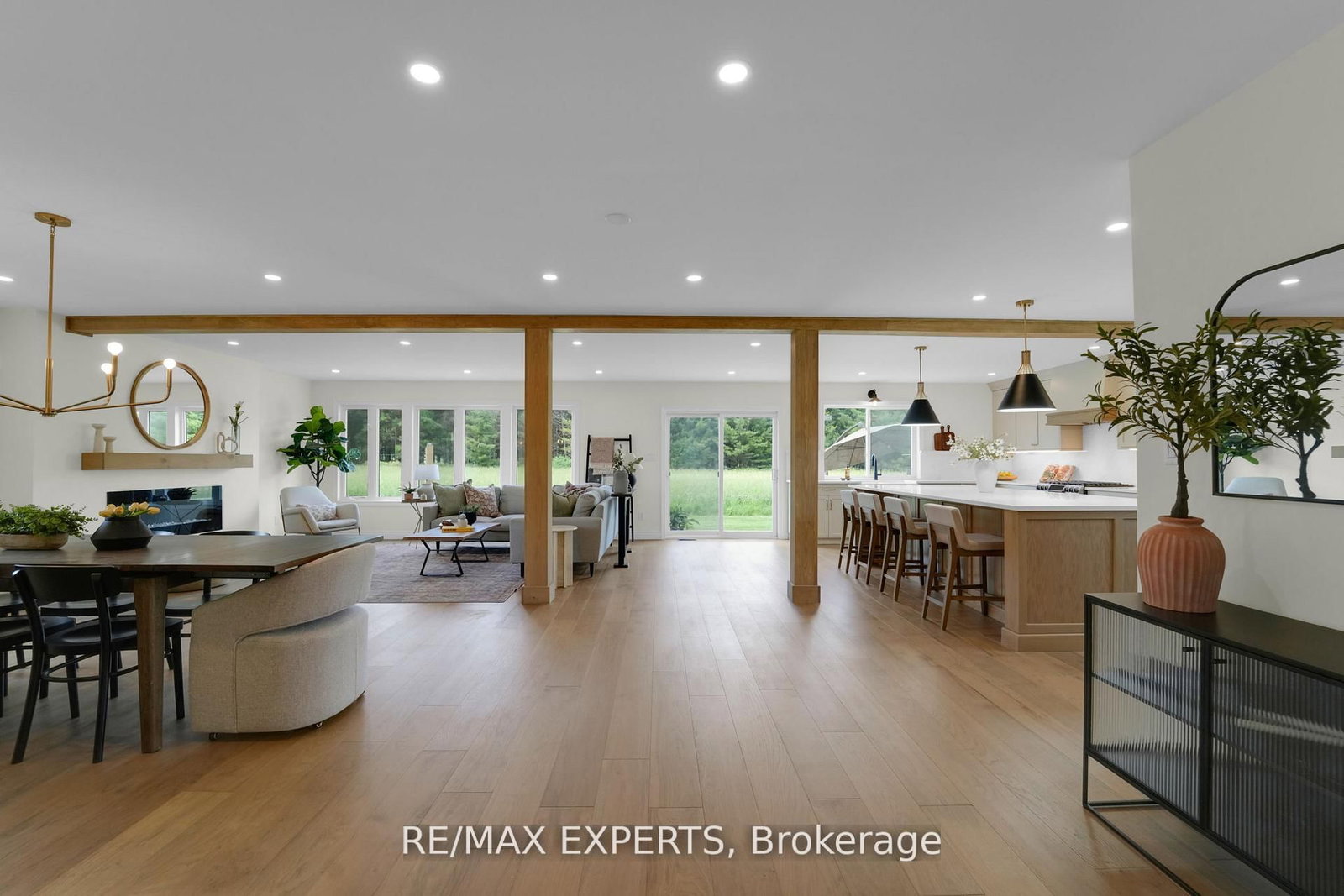Welcome to 46 Scenic Drive! Where timeless craftsmanship meets modern country elegance in the heart of Drayton. The 2-Storey on 46 Scenic Drive has 6 bedrooms, 5 bathrooms, and is located on a 150 x 100 ft lot in the community of Rural Mapleton . Situated on a stunning 100x150 ft lot, this newly renovated custom home offers approx. 5,300 sq ft of beautifully finished living space across three levels. The open-concept main floor is enhanced by engineered hardwood, pot lights, and a striking exposed wooden beam that ties the space together. The designer kitchen is a showstopper featuring quartz countertops, custom cabinetry, an oversized centre island, a uniquely crafted hood, and a walk-in pantry for optimal functionality. Large picture windows flood the home with natural light and frame peaceful views of the lush backyard. With 7 bedrooms and 5 bathrooms, this home blends comfort and sophistication effortlessly. The oak staircase with sleek iron spindles leads to a second floor that boasts a luxurious primary retreat with a spa-like ensuite, double vanities, freestanding tub, glass shower, and his & her closets. The fully finished basement includes pot lights, a spacious bedroom with ensuite, and a custom wet bar with a gleaming granite countertop, perfect for entertaining. Step outside to your stamped concrete patio with outdoor fire-pit, or unwind on the charming front veranda. Located in Drayton, a close-knit community known for its scenic beauty and small-town charm, this home is a true masterpiece of luxury living.