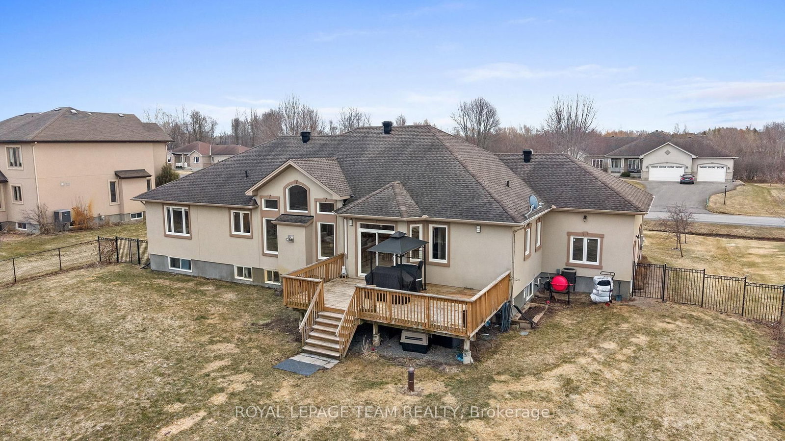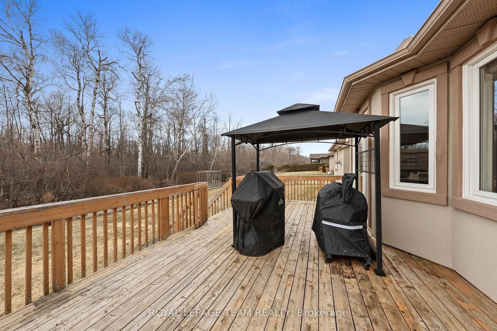 Nestled on a large premium lot backing onto woodland, this custom-built home blends comfort and style. The Bungalow on 6673 Pebble Trail Way has 3 bedrooms, 4 bathrooms, and is located on a 186.4 x 115.81 ft lot in the community of Greely . Enjoy serene views of the backyard and mature trees beyond, while the welcoming front porch invites you to relax and take in the quiet, family-friendly streetscape. Thoughtfully designed with quality finishes, the home combines functionality with refined living. It features four bedrooms, four bathrooms, and a three-car garage, complemented by an open-concept living space with cathedral and tray ceilings, recessed lighting, and hardwood flooring. The great room is anchored by a natural gas fireplace, while the formal dining room provides an elegant setting for entertaining. The eat-in kitchen boasts granite countertops, ample cabinetry, stainless steel appliances, and a centre island with space for casual seating, while a spacious walk-in pantry ensures convenient storage. The primary bedroom serves as a private retreat, with a walk-in closet with custom built-ins and a well-appointed 5pc ensuite. Two additional bedrooms share a full bathroom. The finished lower level extends the living space for entertaining and everyday enjoyment, including a large recreation room with a wet bar, a home theatre with a gas fireplace, a versatile exercise room, a bedroom with a walk-in closet, and a full bathroom. Outdoors, the fenced backyard is framed by mature trees, creating a serene setting throughout the seasons. A spacious deck provides an ideal space to relax or entertain. Set in the Woodstream community, this home offers a wonderful lifestyle with exclusive access to amenities including a pool, tennis court, volleyball court, play area, walking trails, and green spaces. The association fee of $450 per year provides exclusive access to shared neighbourhood amenities.