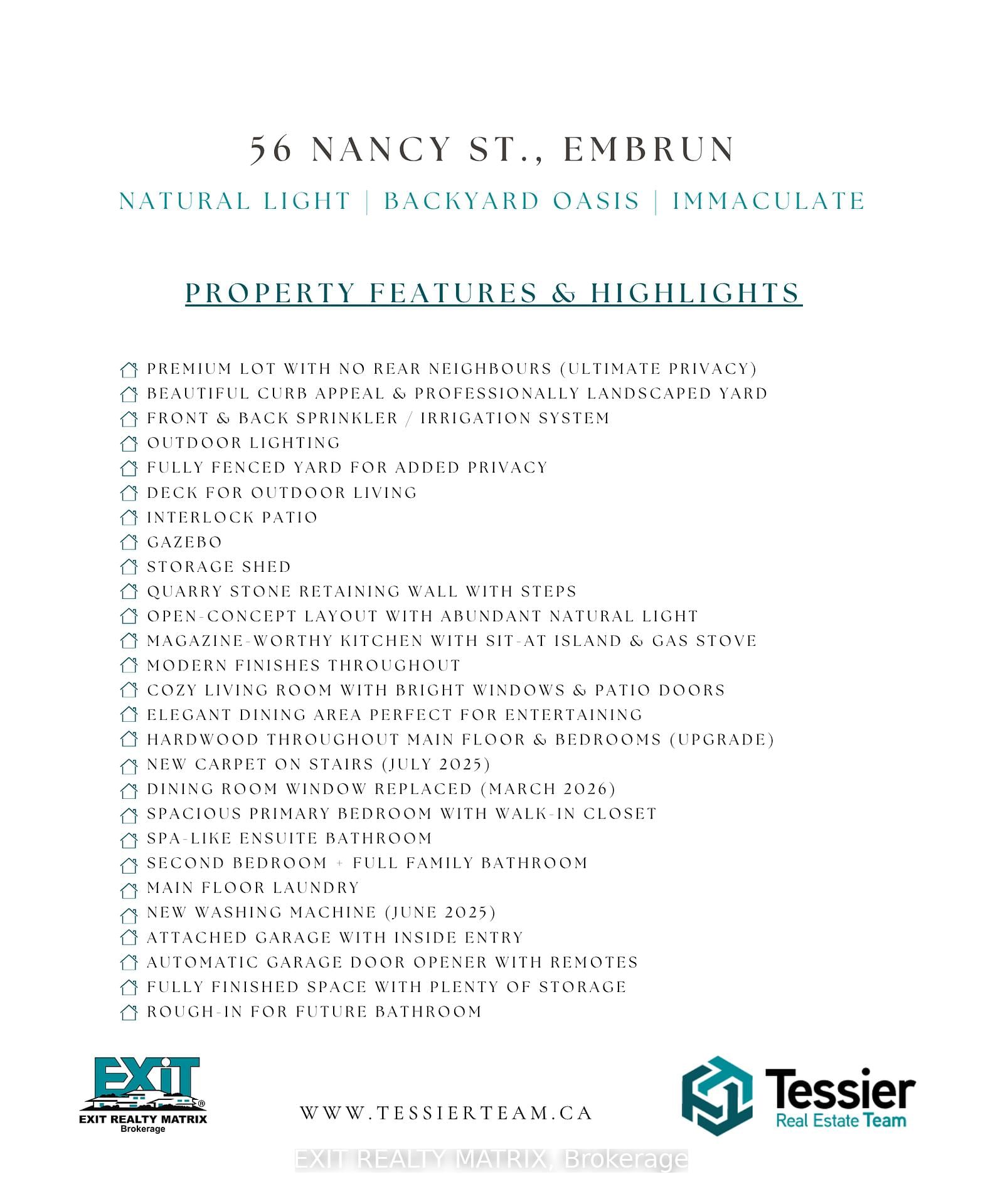 Step into perfection with this stunning bungalow, where pride of ownership shines in every detail. The Bungalow on 56 Nancy Street has 2 bedrooms, 2 bathrooms, and is located on a 129.77 x 49.16 ft lot in the community of Embrun . Set on a premium lot with no rear neighbours, this home pairs elegance, comfort, and everyday functionality in the most captivating way. From the beautiful curb appeal to the meticulously maintained landscaping with irrigation-sprinkler system, its clear this property has been cherished and cared for. Inside, the airy open-concept layout welcomes you with warmth and style. The magazine-worthy kitchen is a true showstopper ,featuring a stylish sit-at island, gas stove, sleek finishes, and all the space you need to cook, entertain, and create lasting memories. The cozy living room and elegant dining space, framed by bright windows and patio doors, flow effortlessly together - perfect for gatherings big or small. On the main level, the primary bedroom retreat impresses with a spacious walk-in closet and spa-like ensuite. A second bedroom and full family bathroom offer comfort for loved ones or guests, while main-floor laundry and direct garage access add to the everyday ease of living. Step outside to your private paradise - a fully fenced oversized yard with wood-look PVC fencing and a striking quarry stone retaining wall. Thoughtfully landscaped and designed for both beauty and function, this backyard is a true extension of the home. Enjoy summer BBQs under the covered deck or on the expansive 16' x 16' interlock patio, unwind in the charming gazebo, and let the built-in sprinkler system keep your lawn effortlessly lush and green. Designed for both lively family gatherings and quiet evenings under the stars, this outdoor retreat truly has it all. This isn't just a home - it's a lifestyle. Don't miss your opportunity to own this Embrun gem!