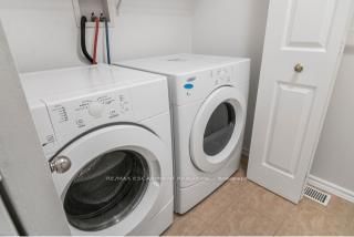 Shutters, dishwasher, stove, fridge, washer, dryer, shelving in utility room