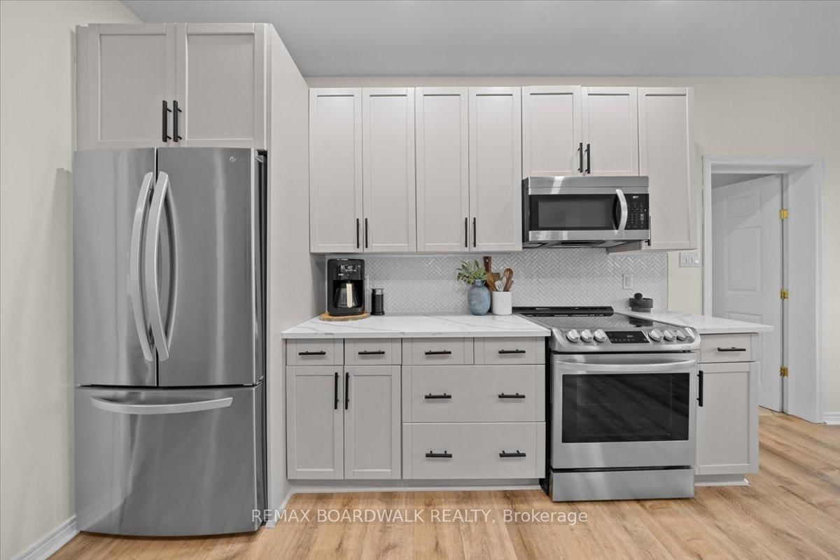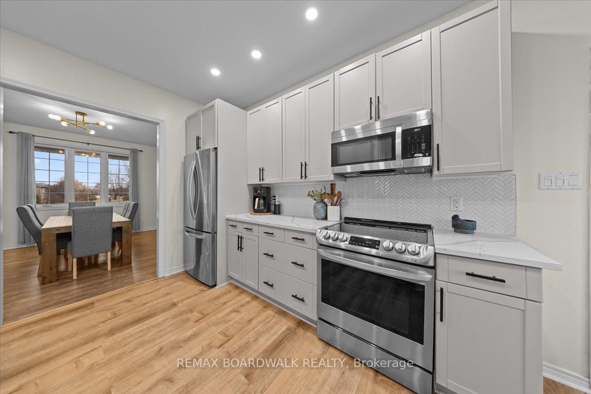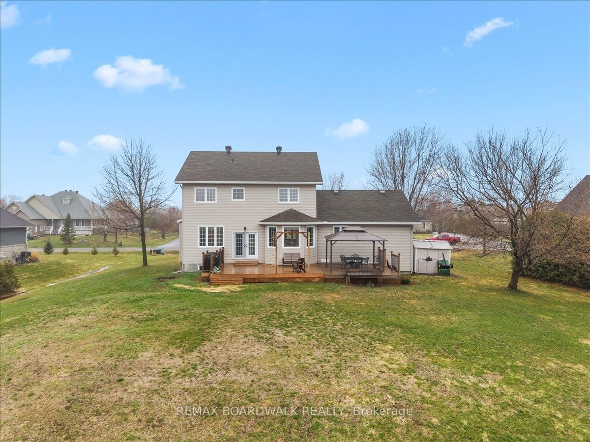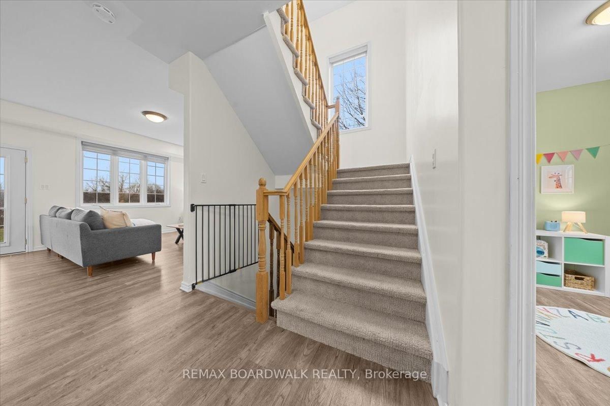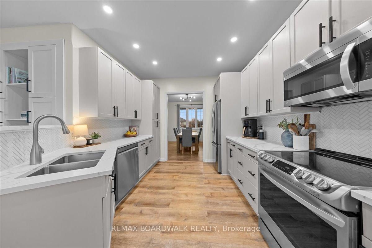 Welcome to a modern farmhouse-inspired home where thoughtful design meets everyday functionality, set on a quiet stretch of Craig Farm Dr in Metcalfe. The 2-Storey on 8044 Craig Farm Drive has 3 bedrooms, 3 bathrooms, and is located on a 194.65 x 124.67 ft lot in the community of Metcalfe . Set back from the street with a large driveway, this home offers great curb appeal with a covered front porch veranda and recessed pot lights. The double car garage features interior access, a side door, and overhead storage. Inside, a wide entry with custom hall tree, cubbies, and bench seating is perfect for busy family life. A beautiful front door with sidelights and transoms fills the space with natural light, complemented by high ceilings and luxury wide plank vinyl flooring. A versatile front room offers the ideal office or playroom, while the separate dining room with a large front window creates a welcoming space to gather. The bright corridor-style kitchen opens into a sun-filled eat-in nook wrapped in windows. Finished with wood cabinetry, granite countertops, herringbone backsplash, recessed sink, and stainless steel appliances, it blends style and function effortlessly. The living room features a stunning floor-to-ceiling stone framed gas fireplace with a natural wood mantle. Double doors lead to the backyard, extending your living space outdoors. A closed mudroom off the kitchen provides access to the laundry room, pantry, and garage. Upstairs, a large staircase window brings in natural light. Four bedrooms include a primary retreat with walk-in closet and 4-piece ensuite featuring a stand-alone soaker tub, double wide glass shower, under mounted vanity, and tile throughout. Linen closet. Main bath offers ceramic tile and a tub shower combo. The finished basement adds a rec room, gym area, office nook, and pot lights throughout, with hardwood stairs leading down. Enjoy a private backyard w/ no rear neighbours. Deck space, room to play, garden, and entertain. A home that offers space, comfort, and a lifestyle upgrade. 24h irrevocable on all offers.
