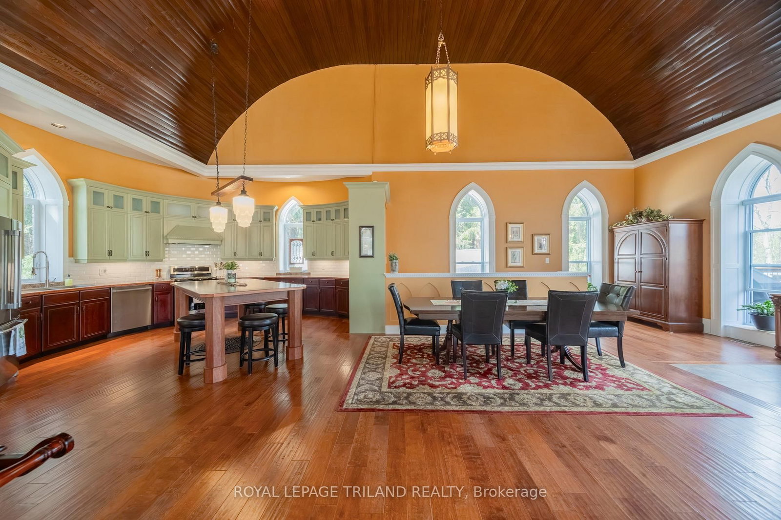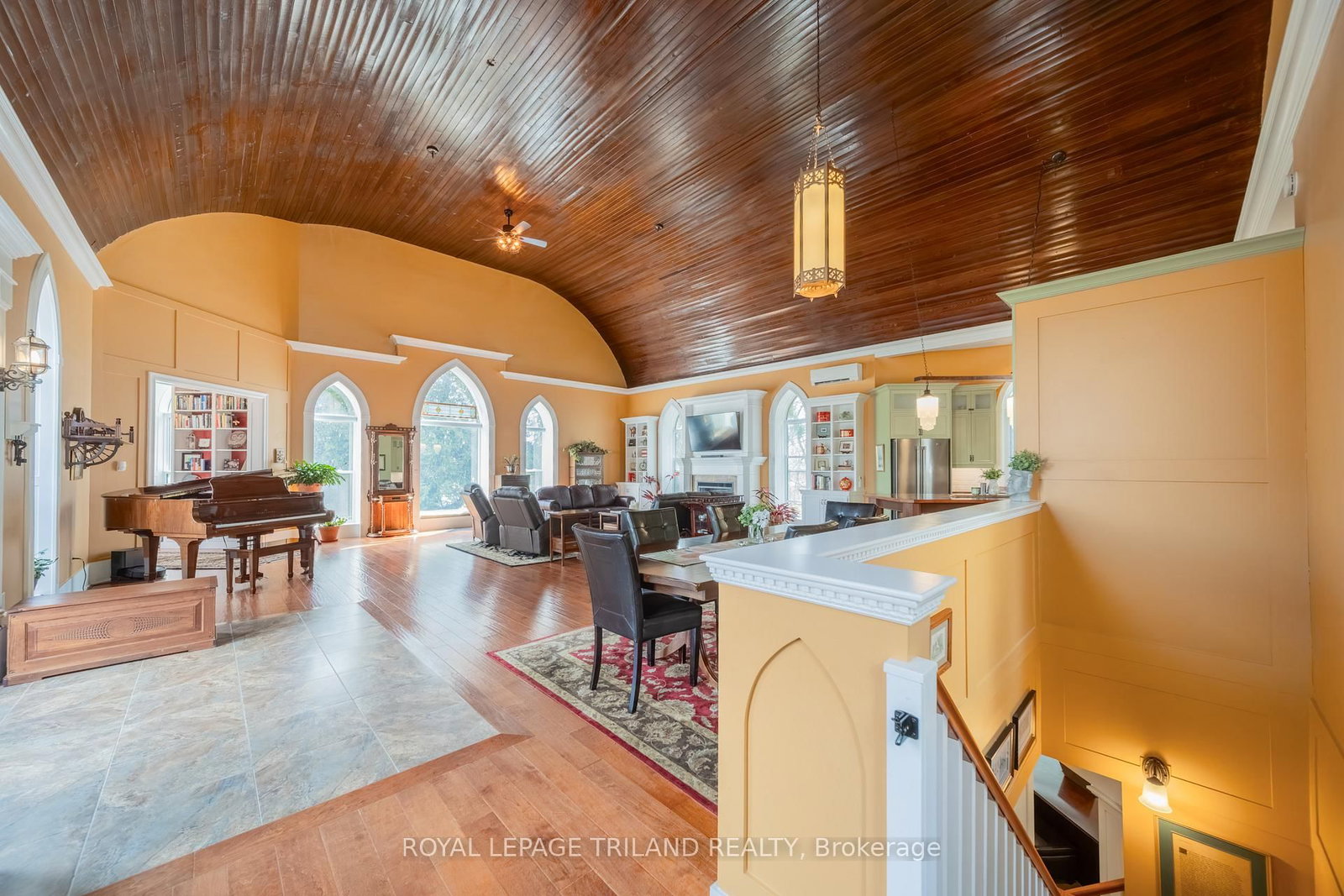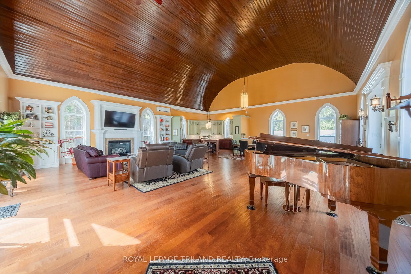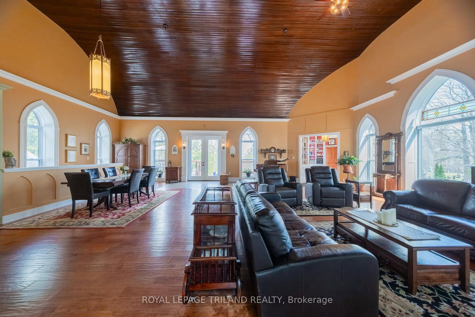 Step into a truly one-of-a-kind property-this beautifully converted 1914 church seamlessly blends historic charm with modern living. The 2-Storey on 32135 Sylvan Road has 3 bedrooms, 2 bathrooms, and is located on a 165 x 180 ft lot in the community of Sylvan . Thoughtfully redesigned 2017 and meticulously maintained, this two storey gem offers a unique layout full of character. This property is ideally located in the middle of ALL things, including London, Sarnia, Strathroy, Lake Huron, parks, wineries & golf. The upper level features an impressive open-concept "great room" complete with kitchen, dining, and living spaces, all highlighted by a breathtaking 19' original wood vaulted barrel ceiling. Large windows flood the space with natural light, while gleaming hardwood floors and a gas insert fireplace create an inviting and airy atmosphere. The chef's kitchen (where the altar was), is a showstopper-featuring a spacious eat-at island, with plenty of room. An area off the great room has been creatively transformed into a cozy library-an unforgettable feature that sets this home apart - complete with a convenient 2-piece bath. On the main floor, you'll find three bedrooms, 2 w/walk-ins, one with an electric fireplace, and ALL with full sized windows. This level also has a large 4-piece bath w/heated floors, laundry closet and two utility closets. Additionally, there is a flexible space, currently used as an office, which was once a theatre room, with a 2nd electric fireplace. This level also includes a mudroom and a huge three-season games room w/loads of storage and walkout access to the expansive yard. Set on 2/3 of an acre, the fully fenced property is ideal for families, pets, and outdoor enjoyment. Hobbyists and enthusiasts will appreciate the impressive outbuildings, including a pole barn 24x21(hydro), greenhouse 9x12, and a garden shed 9x6;-perfect for projects, storage. The yard consists of over 35 perennials for all season beauty. Beyond the fence this property is bordered by forest for ultimate privacy. A rare opportunity to own a distinctive home rich in history and charm.