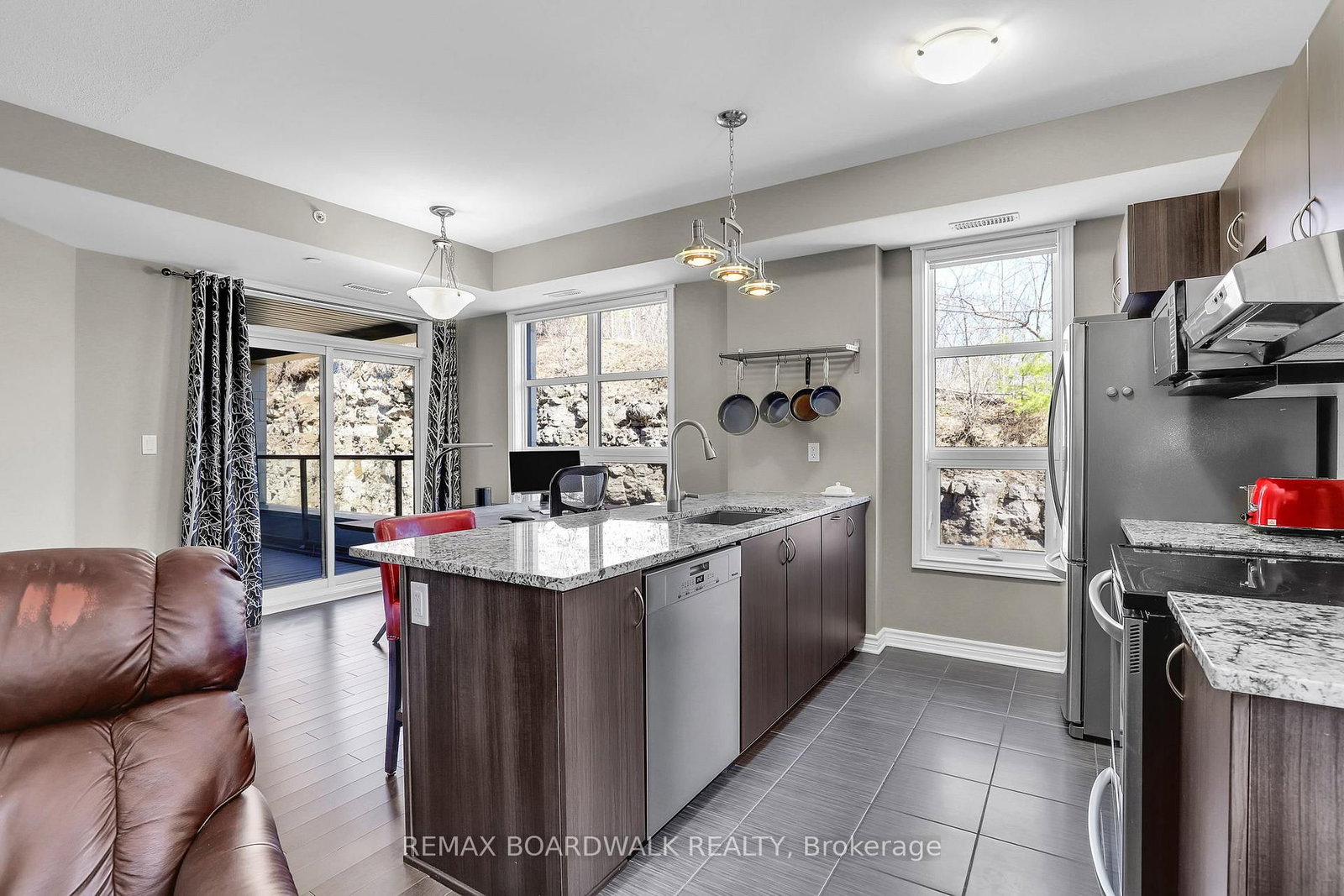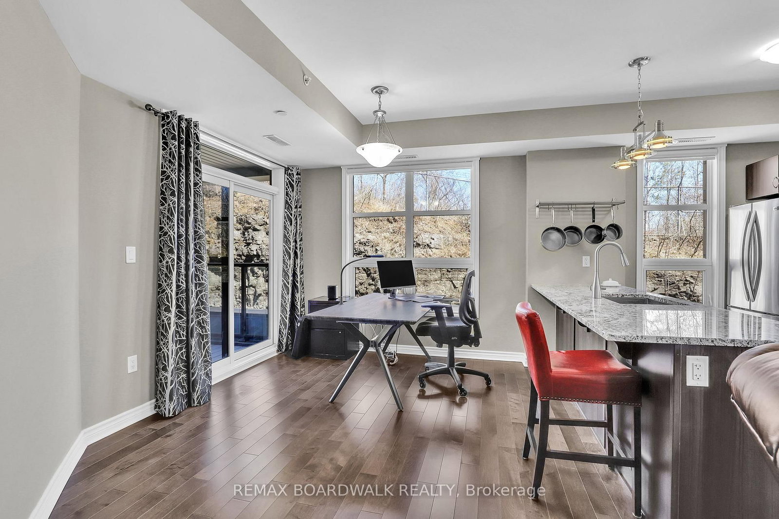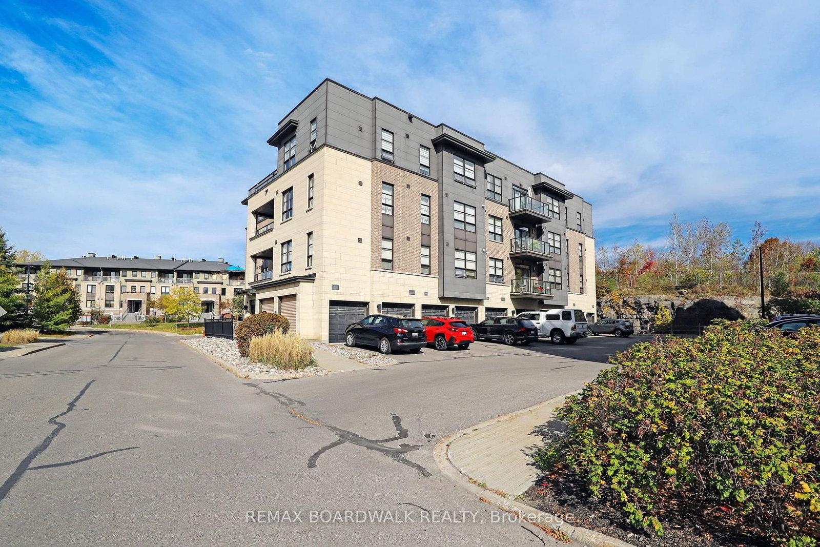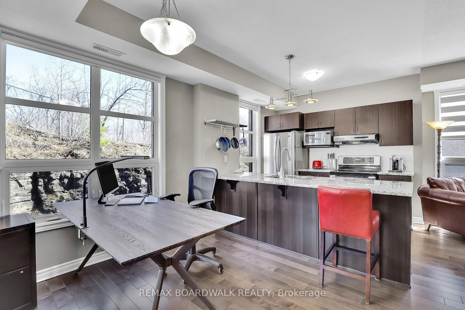 Welcome to 230 Titanium Private nestled in the tree filled Quarry Ridge complex of low-rise luxury condos. The 1 Storey/Apt on #202-230 Titanium Private E has 2 bedrooms, 2 bathrooms, and is located in the community of Convent Glen North . This large 2 bedroom & 2 bathroom CORNER unit showcases hardwood floors, 9ft ceilings, custom blinds and is filled with natural lights thanks to all your large windows. The open concept living area hosts a spacious living room, dining area with peaceful outdoor views and a Chef's kitchen with Granite countertops, Stainless Steel appliances, sit-up island and plenty of cabinet space. The move-in ready condo features a well sized secondary bedroom, a modern full main bathroom and a sizeable primary bedroom with personal 3pc ensuite. From the dining area you access your private covered deck which offers beautiful year-round outdoor views...the perfect space to watch nature, entertain your friends or sit back & read a book. This condo includes a tandem style parking space next to the front door that can accommodate 2 vehicles. The pet-friendly complex has plenty of visitor parking, various sitting areas with benches and a pond at the entrance. Great features included in-suite laundry with newer washer & dryer, Ecobe thermostat, entire condo freshly painted (April 2026), controlled building entry and convenient elevators for yourself & visitors. Located close to public transit (10min walk to upcoming LRT Station), multiple parks, walking/biking trails, Place d'Orléans, the Shenkman Arts Centre and a variety of stores & restaurants to make your daily life easy!